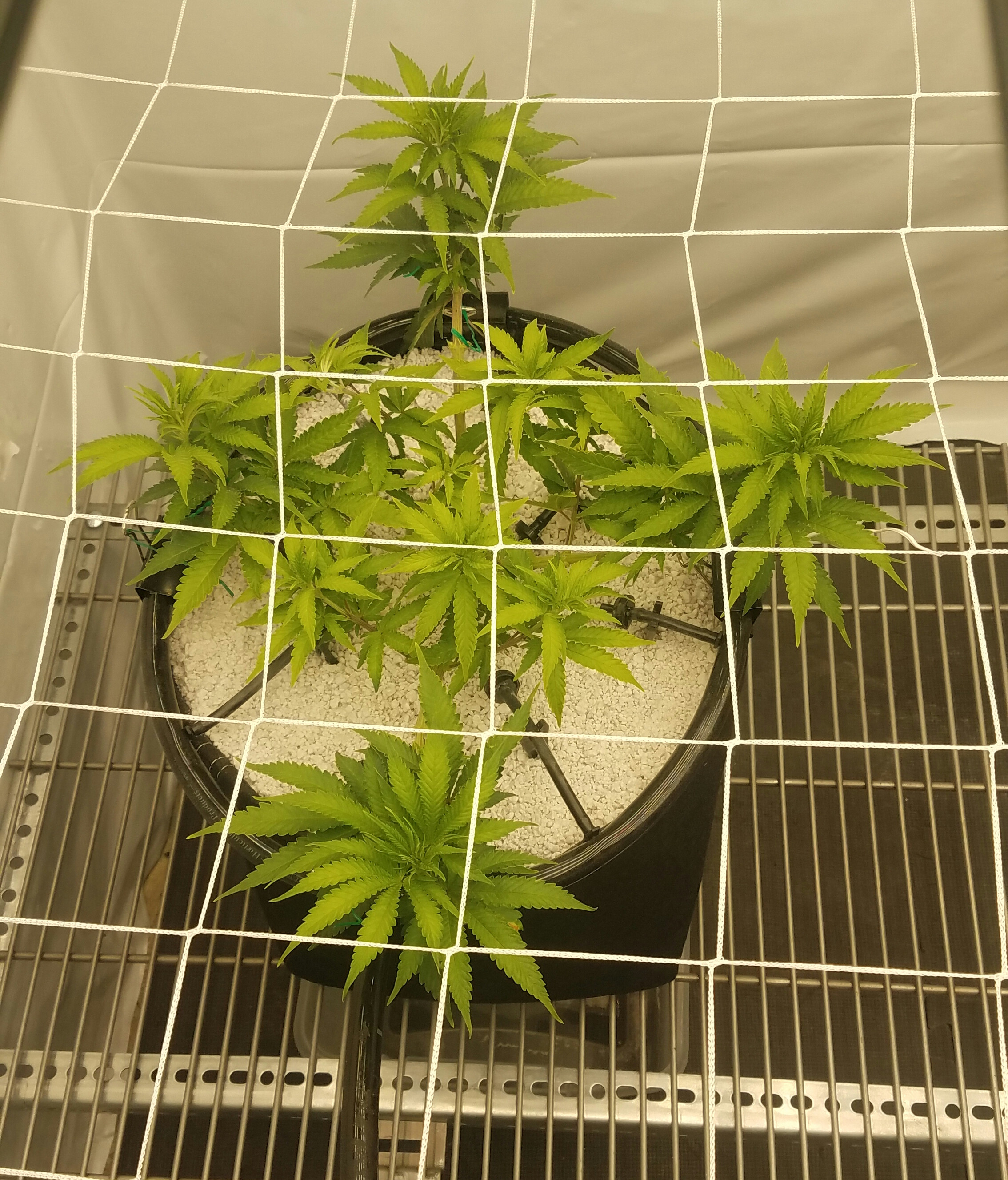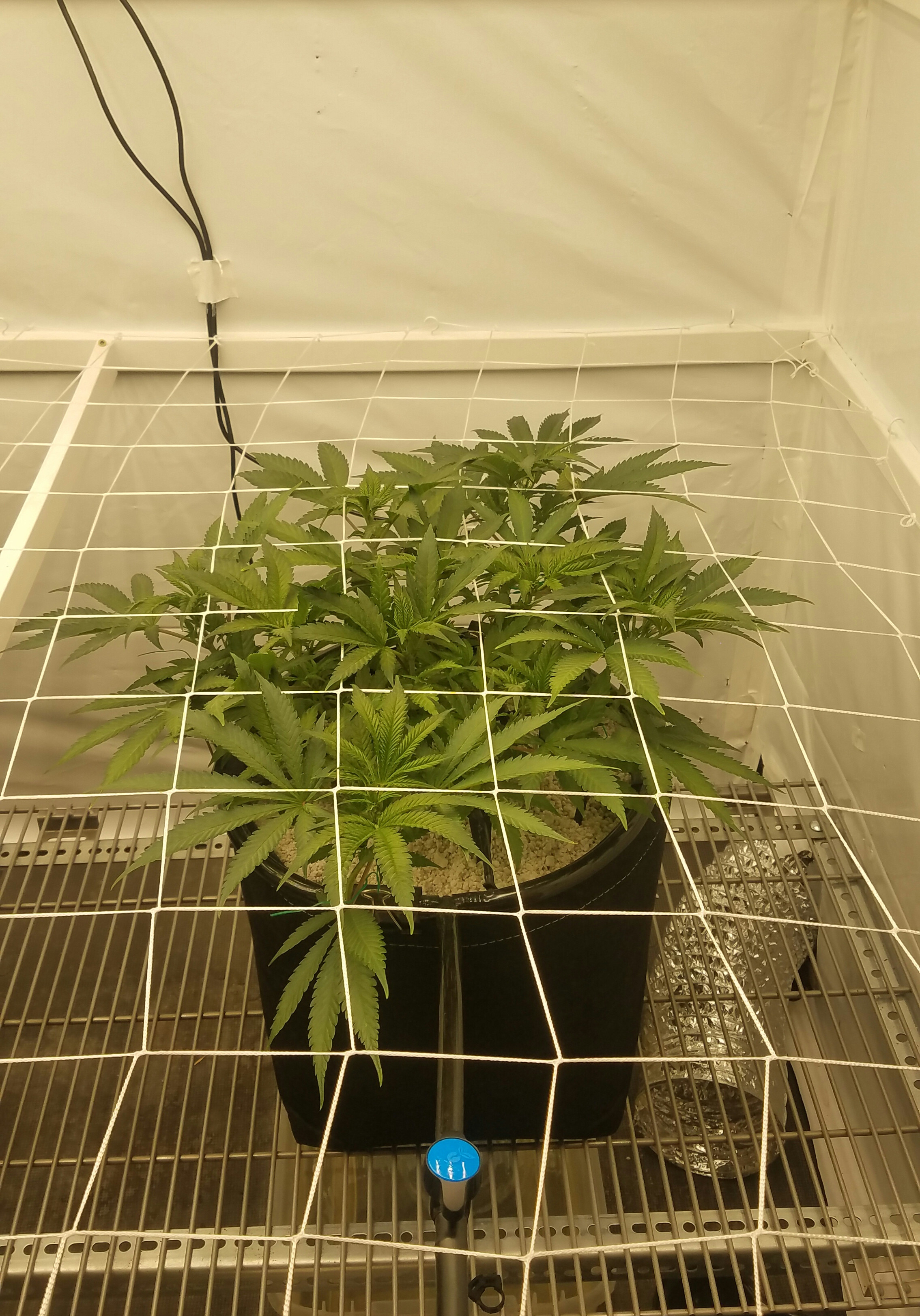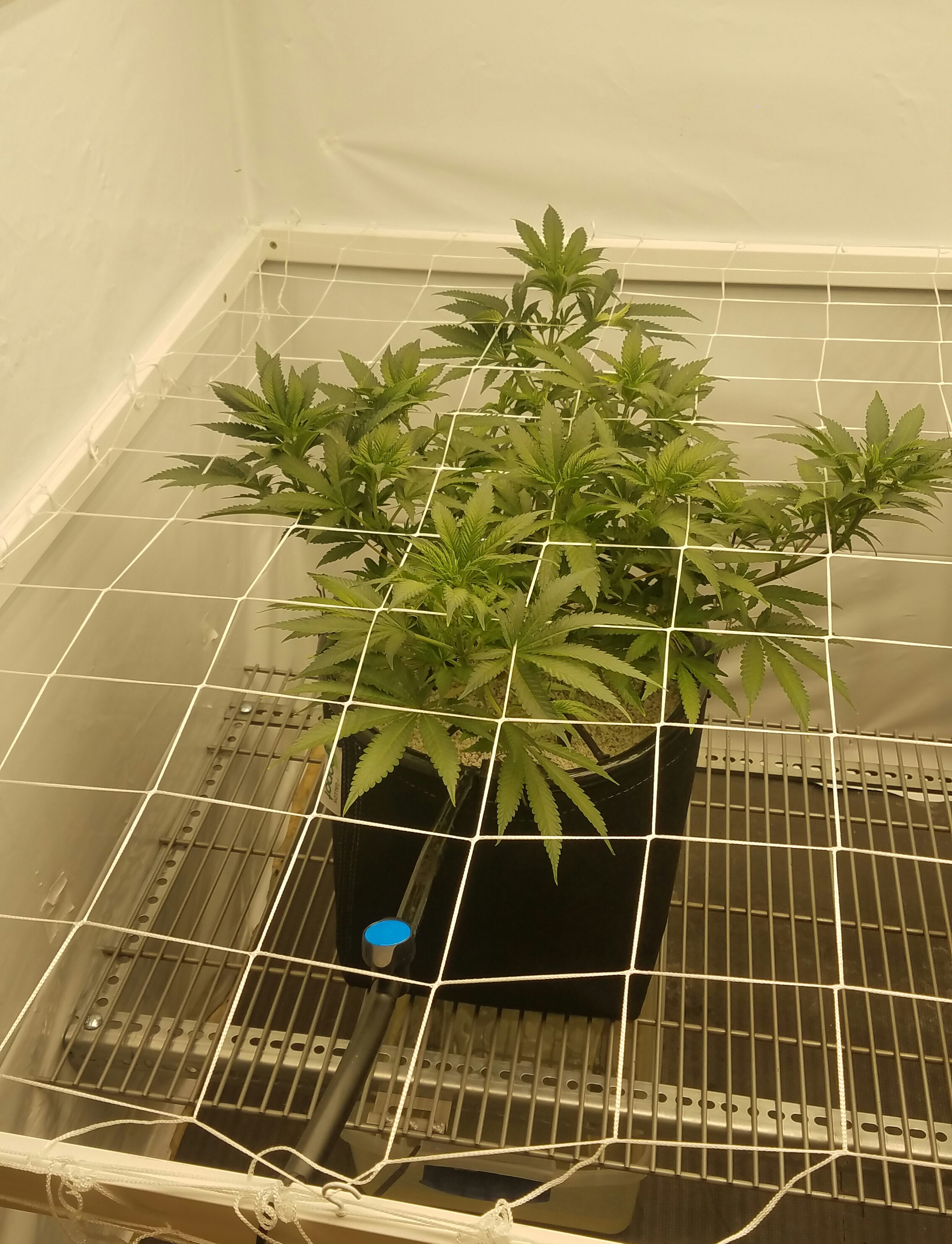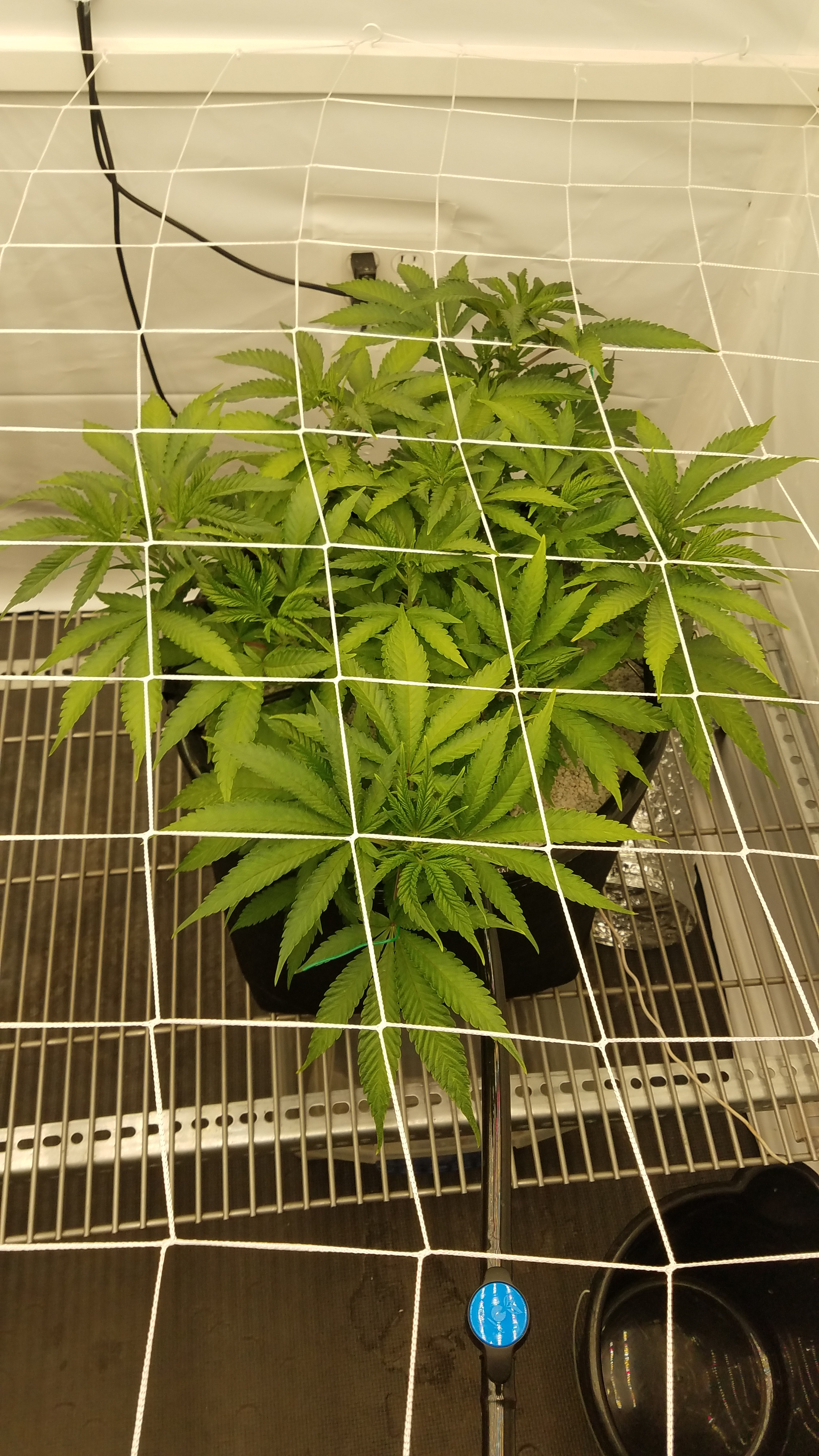 Blue Dream clone and Grape ape are playing leap frog, more like I'm making them play. The blue dream has taking off found her home, so the net went in. This is the second time Iv run BD off the mother and is technically a eight months old plant. Grape Ape is still stretching her legs, I'm expecting it to take off soon. I'm not worried, pots are drying faster, water has increased, nutes-water-nutes-water repeat. It will take the time it takes to fill the net, by using a larger pot, less plants, in a scrOG a 10 week veg was about my Target for the flip. I am keeping notes on the Photo's