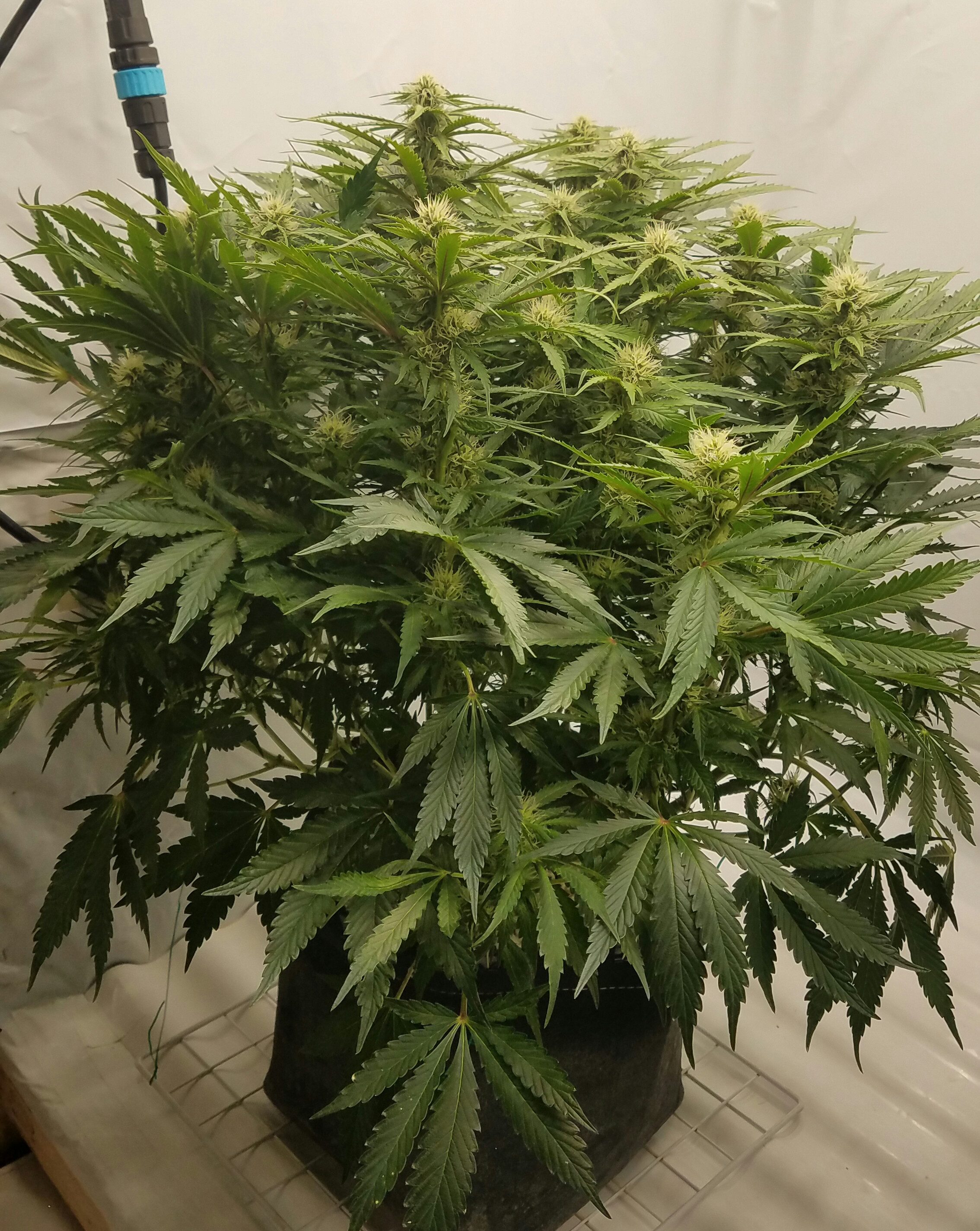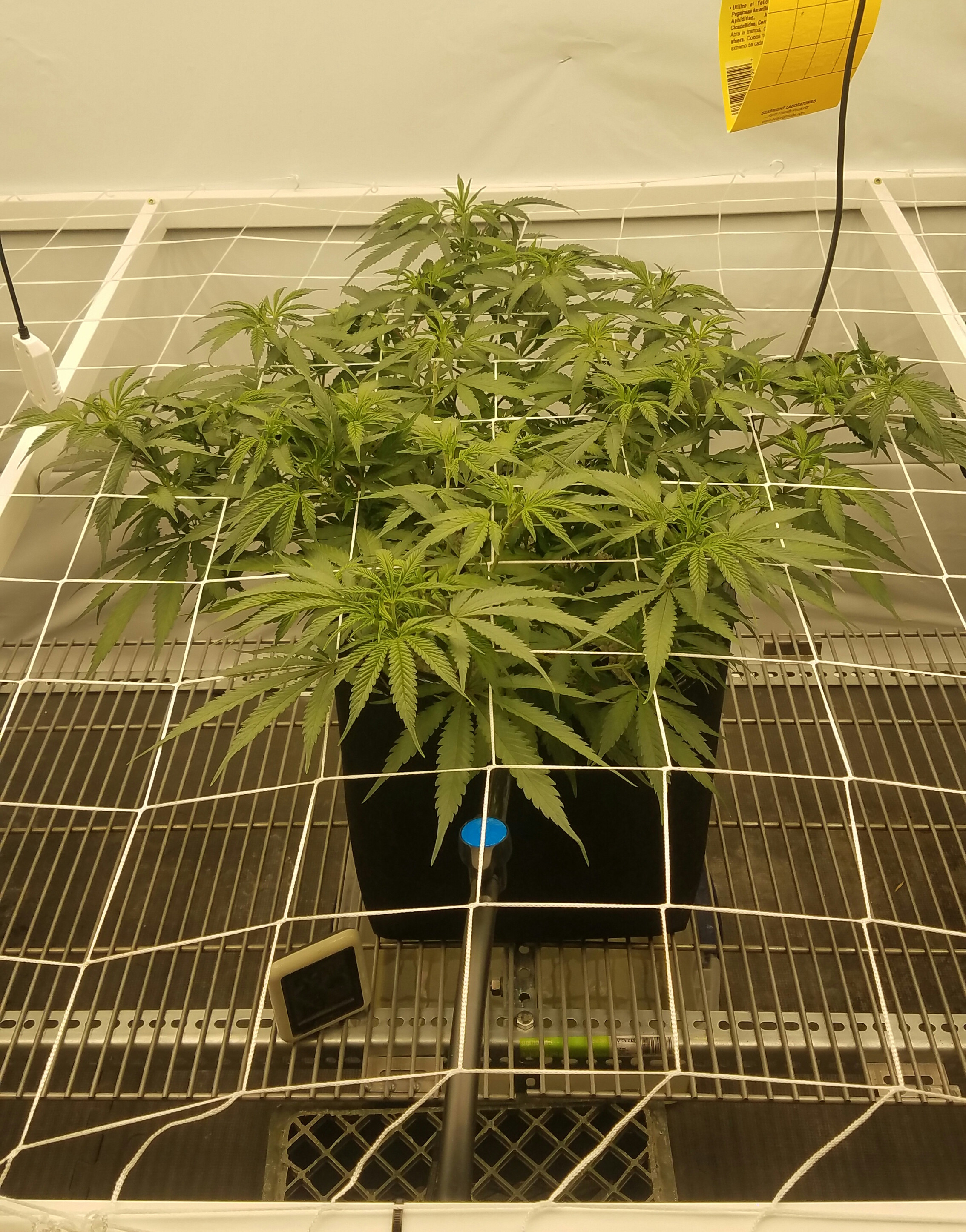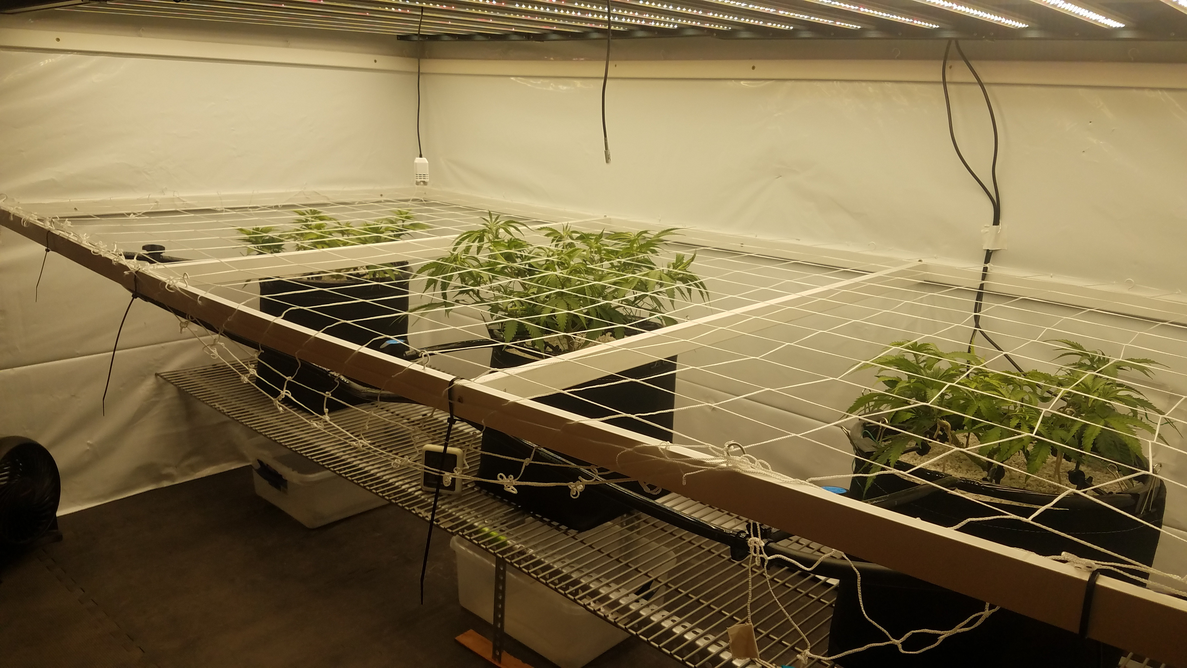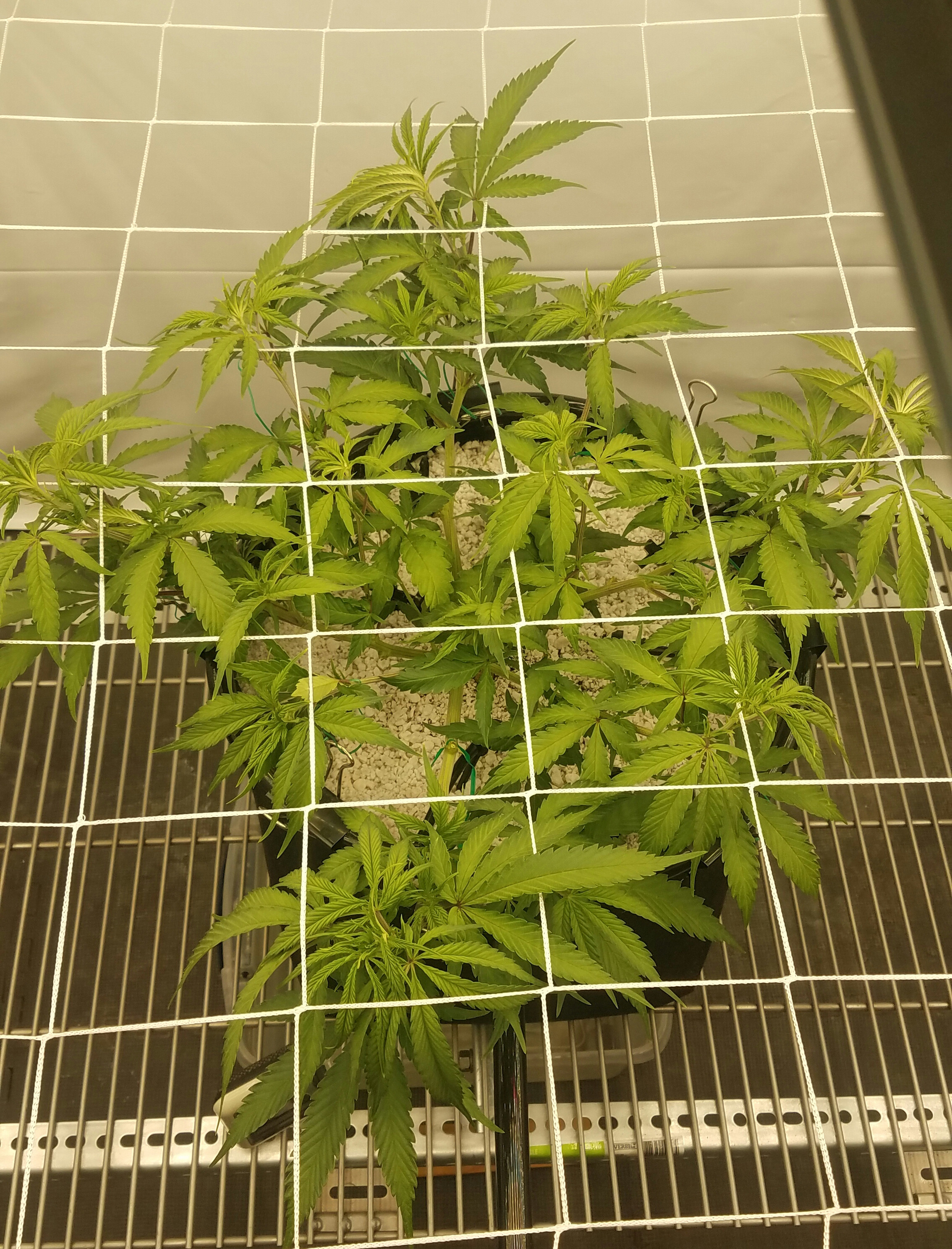 Blue Dream clone and Grape ape are playing leap frog, more like I'm making them play. The blue dream has taking off found her home, so the net went in. This is the second time Iv run BD off the mother and is technically a eight months old plant. Grape Ape is still stretching her legs, I'm expecting it to take off soon. I'm not worried, pots are drying faster, water has increased, nutes-water-nutes-water repeat. It will take the time it takes to fill the net, by using a larger pot, less plants, in a scrOG a 10 week veg was about my Target for the flip. I am keeping notes on the Photo's
