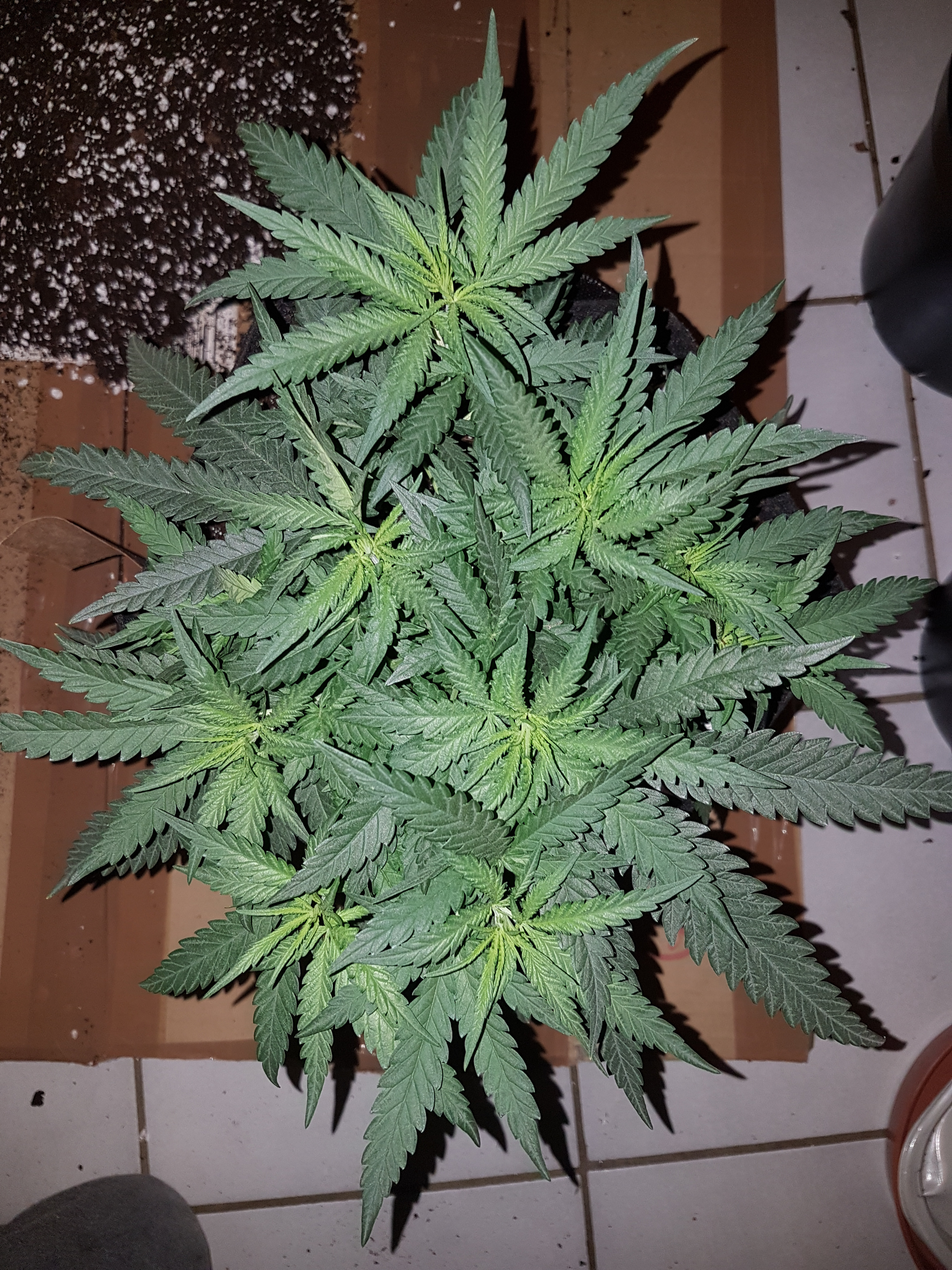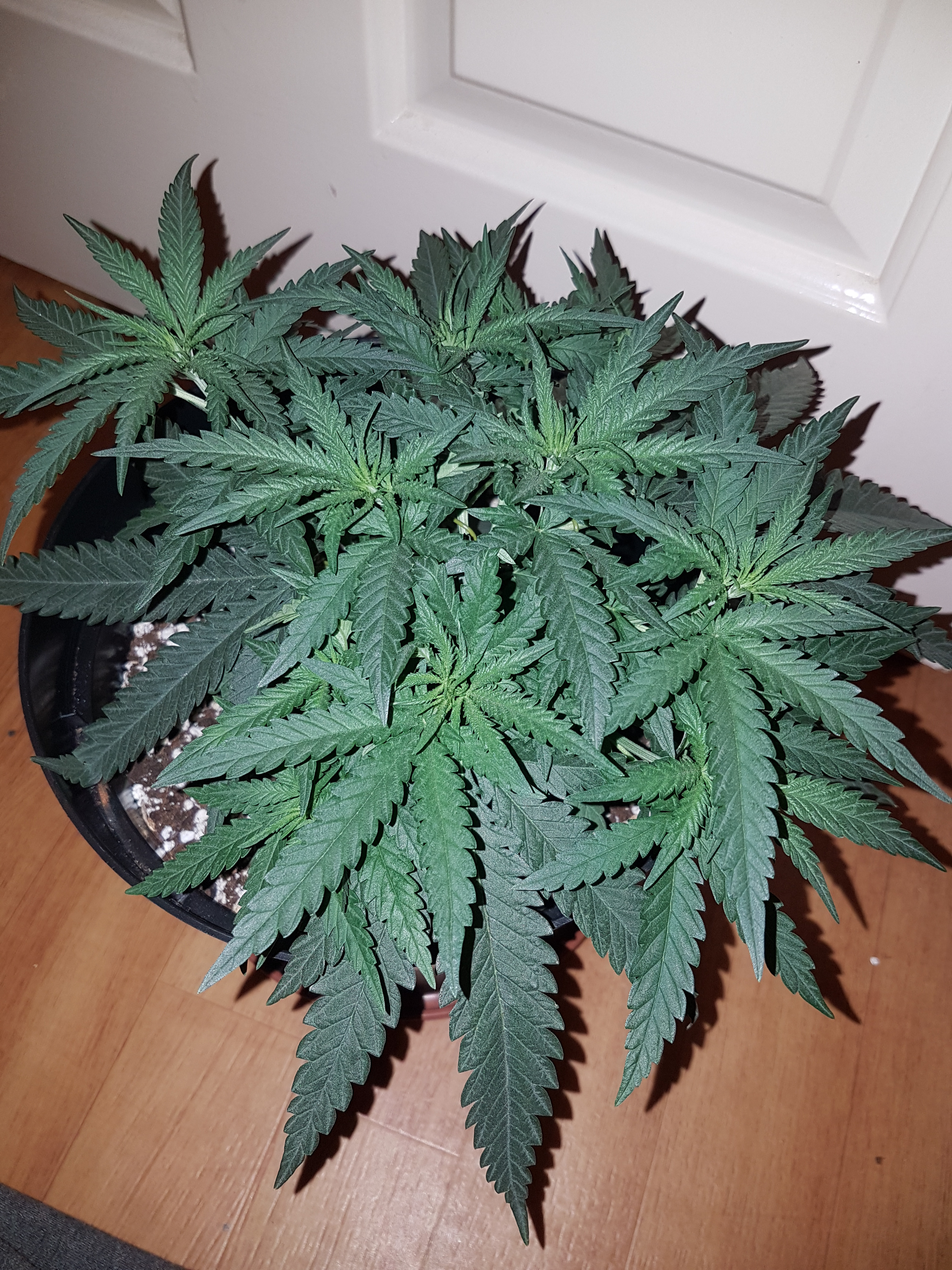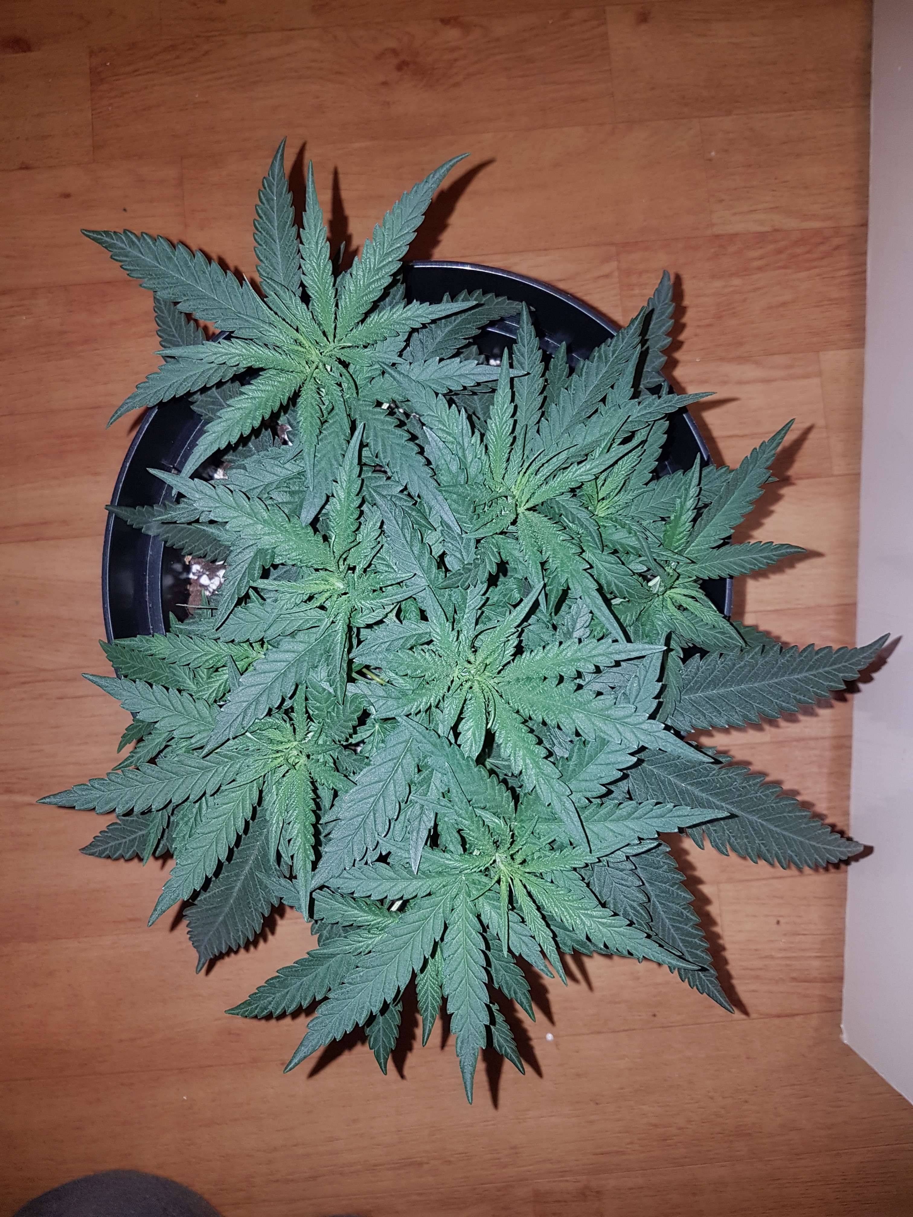 My plants are 5wks old tomorrow. They are currently in 5 ltr (roughly a gallon) pots and have been in them since seed so this will be their first transplant. I'm going to move them into 12 ltr fabric pots. Didn't get to do it last night as something came up so going to attempt it later. My one plants leaves have already extended beyond the sides of the pot. Seems to be growing wide more than tall probably in part down to mistakes i made in the beginning. That plant is currently 6.5 inches tall grown half inch in last 2 days lol, and 14 inches wide and starting to get bushy which is also another reason for transplanting it. I am unable to do any lst with the room i currently have in the pot. Pics below.