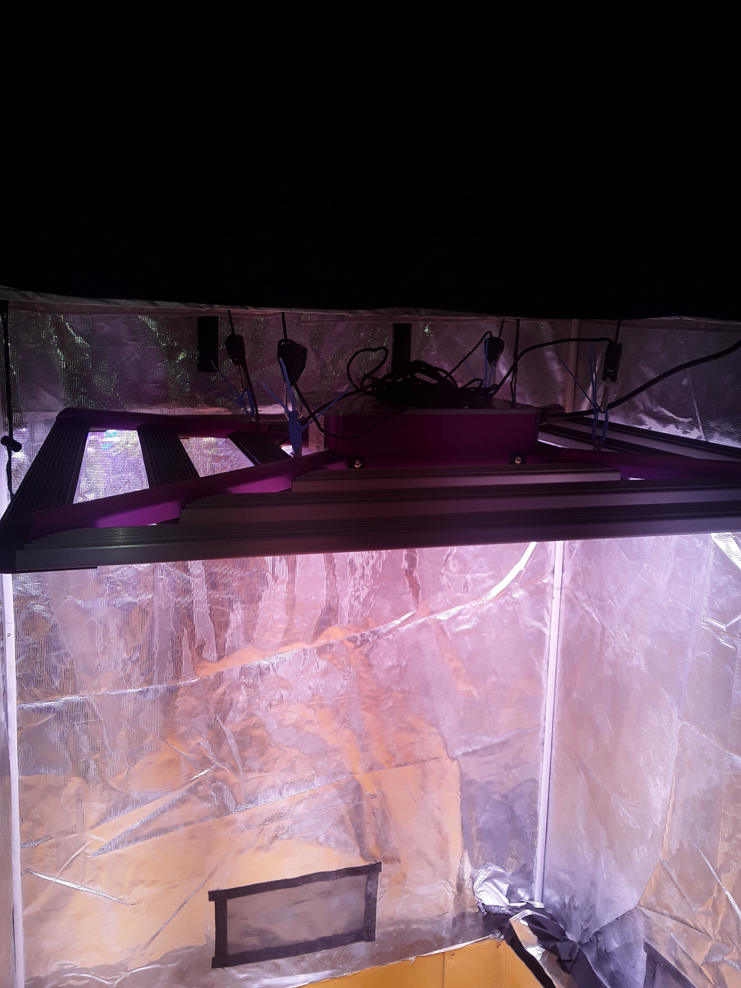 Ok I know starting off that they are not under the light described. Unfortunately my controller for the light is on back order and it is to much for them at this stage of growth. I just started their manifold training two nights ago. The one in the back corner is showing some signs light burn already. Raised the light up some and nothing on the small new growth. They are all clones from my raspberry cough scrog. That thread is First grow in 6 years. So when the girls get a bit bigger I will transfer them into my 4x4 tent under the X2. I will post a few pics of the set up in the 4x4 even though it's not being ran just yet.