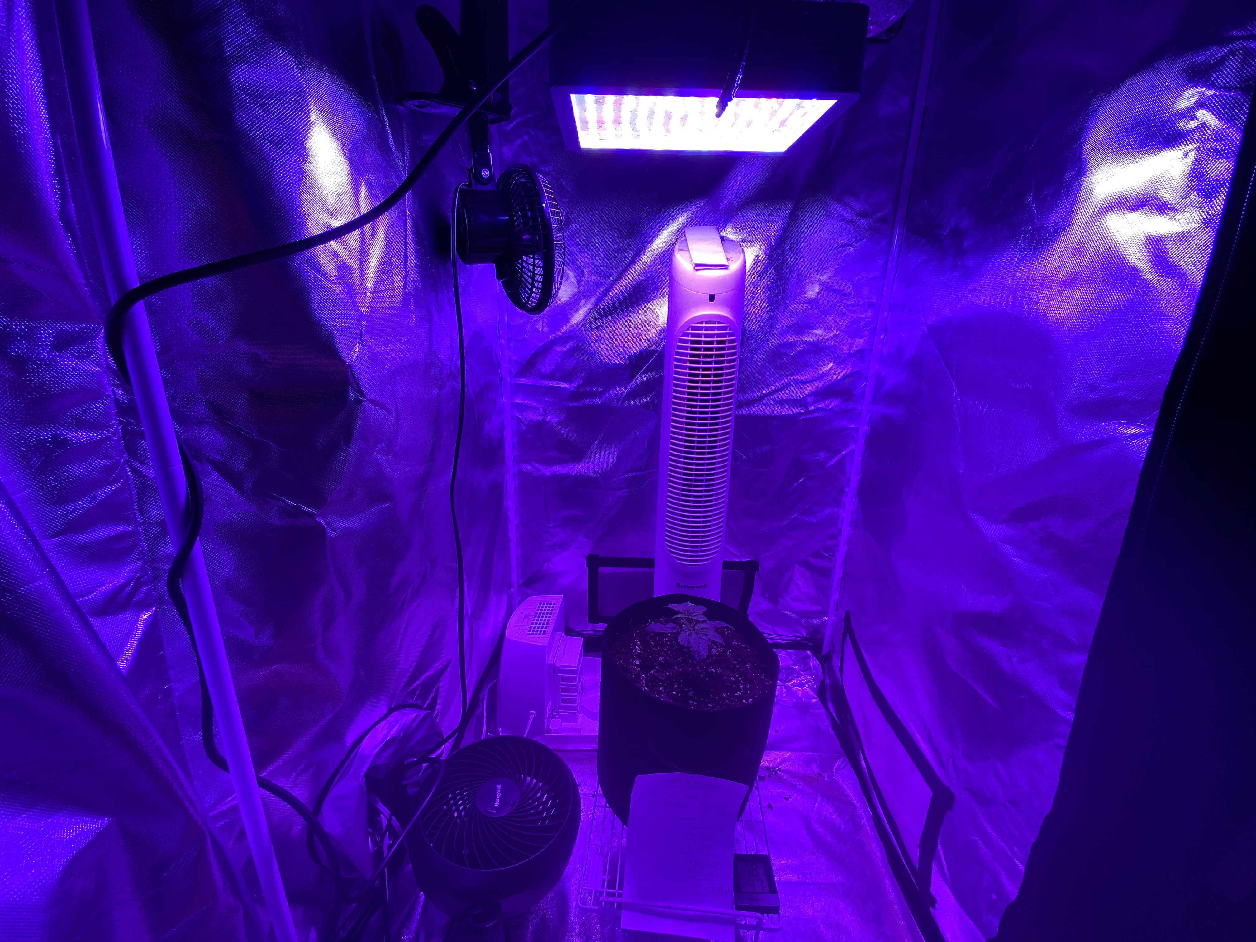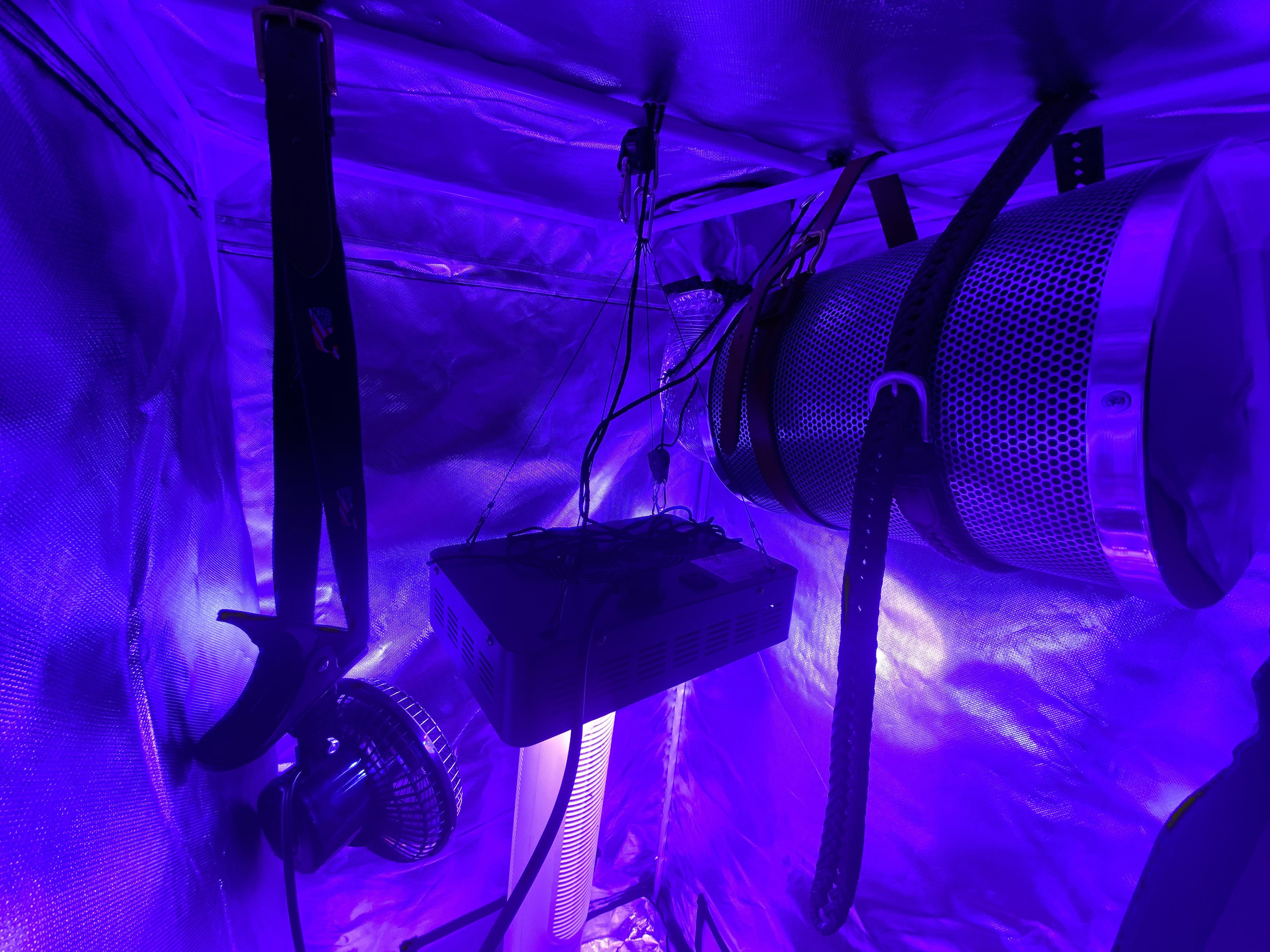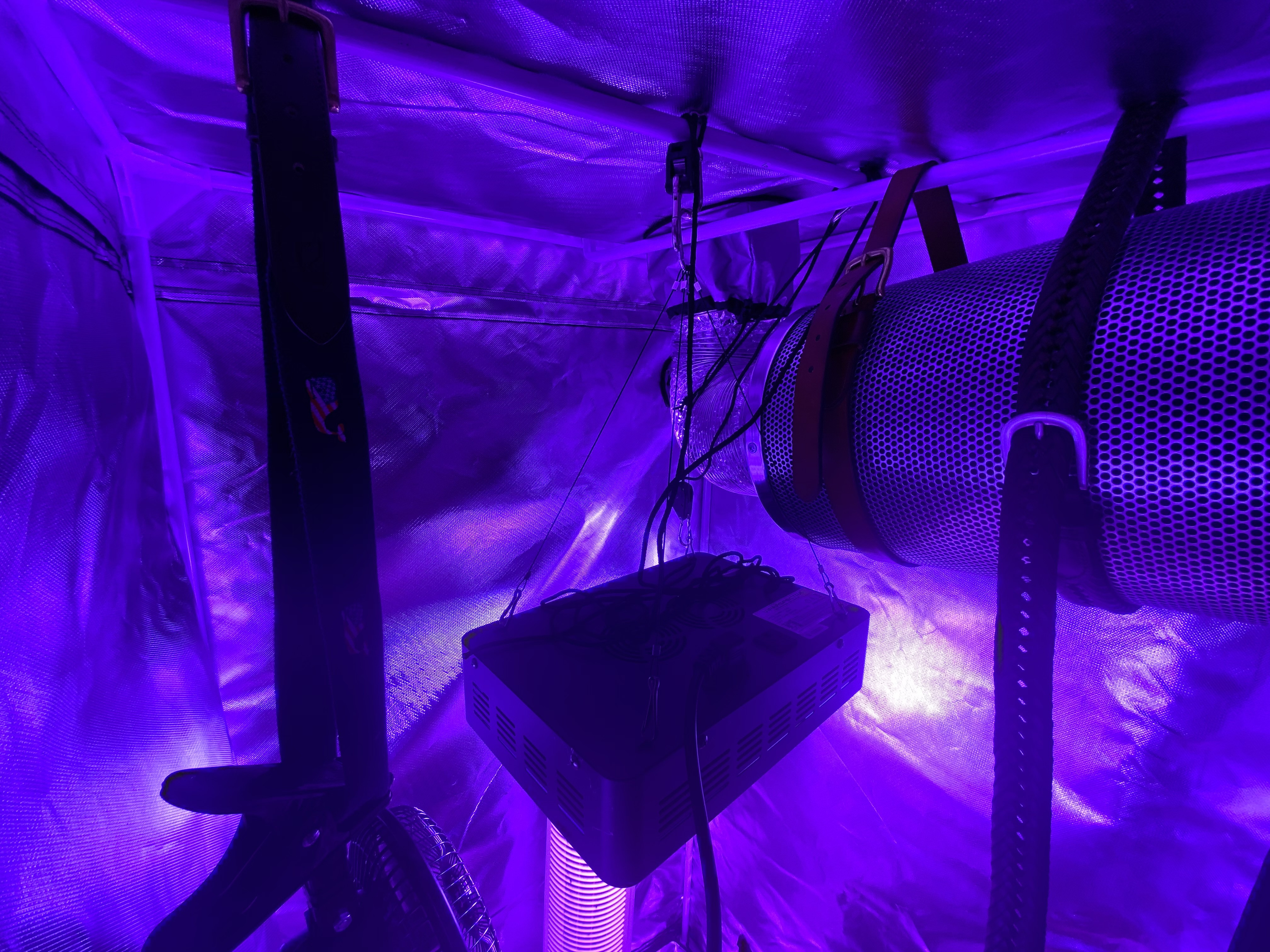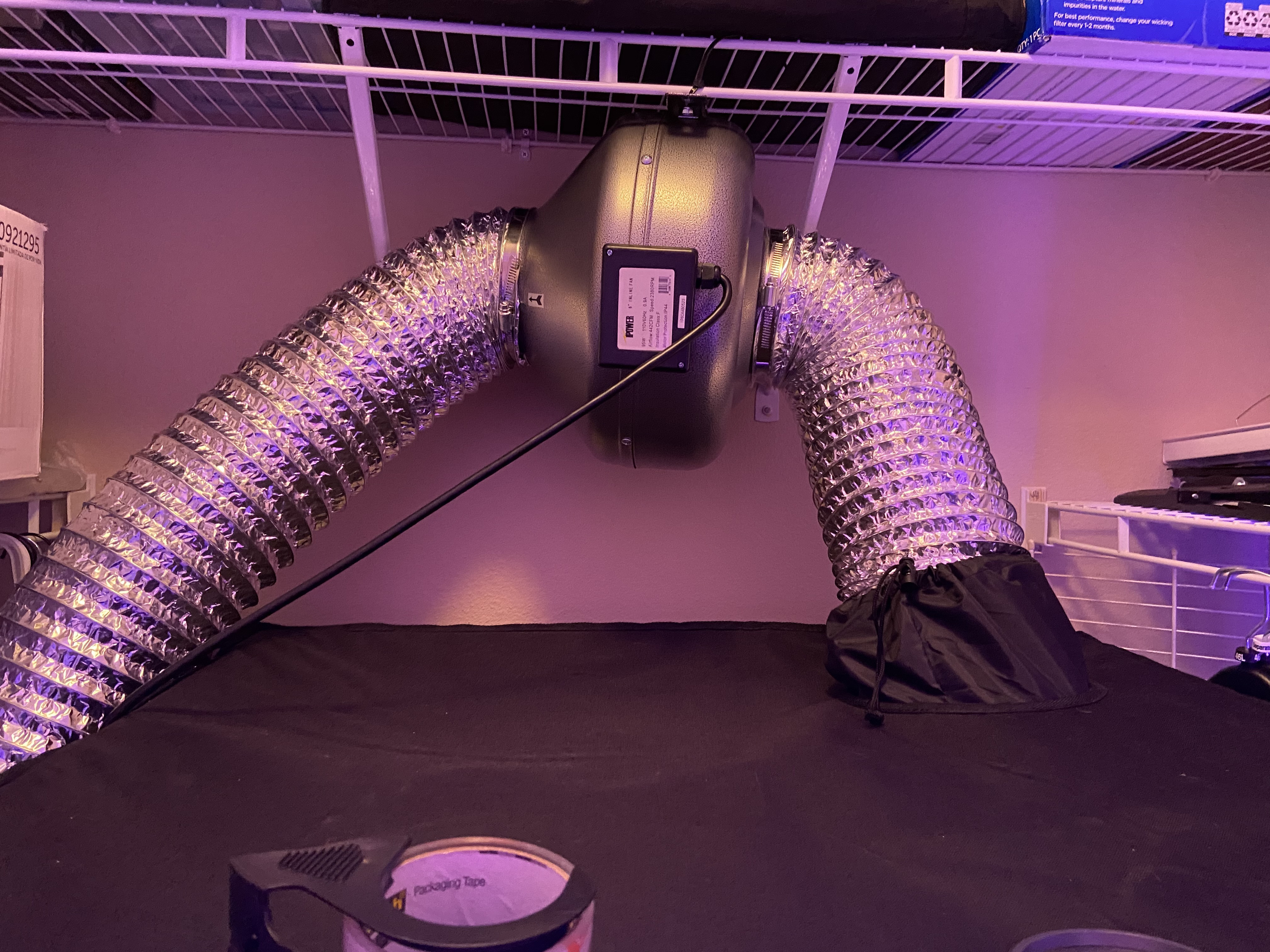 Hopefully the photos provide a good description of what I'm working with setup wise. The intake is inside the tent attached to the carbon filter, which goes up and out the tube which I attached to the screen door I had to use as my closet door because It got waaaaay too hot with the original door. but I have to keep the cats out of the closet because they've already put holes in the tent.