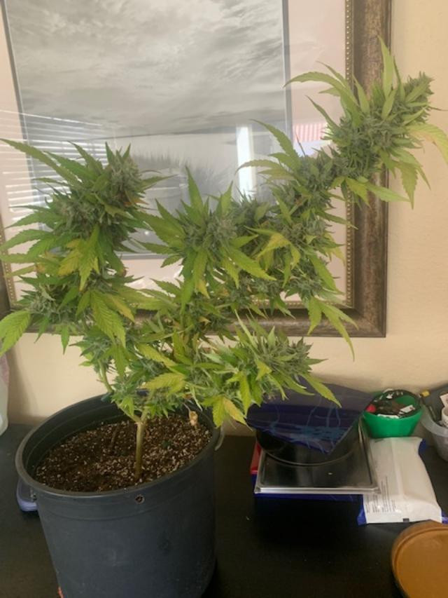 One of my Wedding Cake clones couldn't handle the increasing bud weight any longer. Got out the microscope and with about 5% amber I decided to take her. She went into her forever 3 gallon pot on June 19th, so basically a 4 month grow. Wedding Cake is a strain I would recommend to any outdoor grower, but especially for the folks with limited experience. Very little maintenance, simple nutrient feeding, and very tolerant of California weather extremes. Fat, healthy, extremely sticky buds, with a citrusy profile, and easy to train. (I kinda got lazy on her LST after her one and only tie down.) These were far and away the most trouble free plants I have going. Her two sisters aren't falling over yet so they will get another week or so I think. I'm dealing with some very hot dry conditions currently so I'm trying a old school drying technique with her. When I turn on the A/C I'm unable to keep the humidity up even with a humidifier going nonstop. So instead of hanging them I've opted to lay the branches down in a container in a dark closet and turn them 3 times a day. I have a fan going to keep air moving but no direct wind on them. I used this method back in the 80's and as long as I'm diligent in turning, it works pretty well, although it does take longer. Not a ton of product but these buds are dense and heavy. I'm going to include this strain I'm sure in next year's grow but will probably try and find some feminized seeds instead of going the clone route.