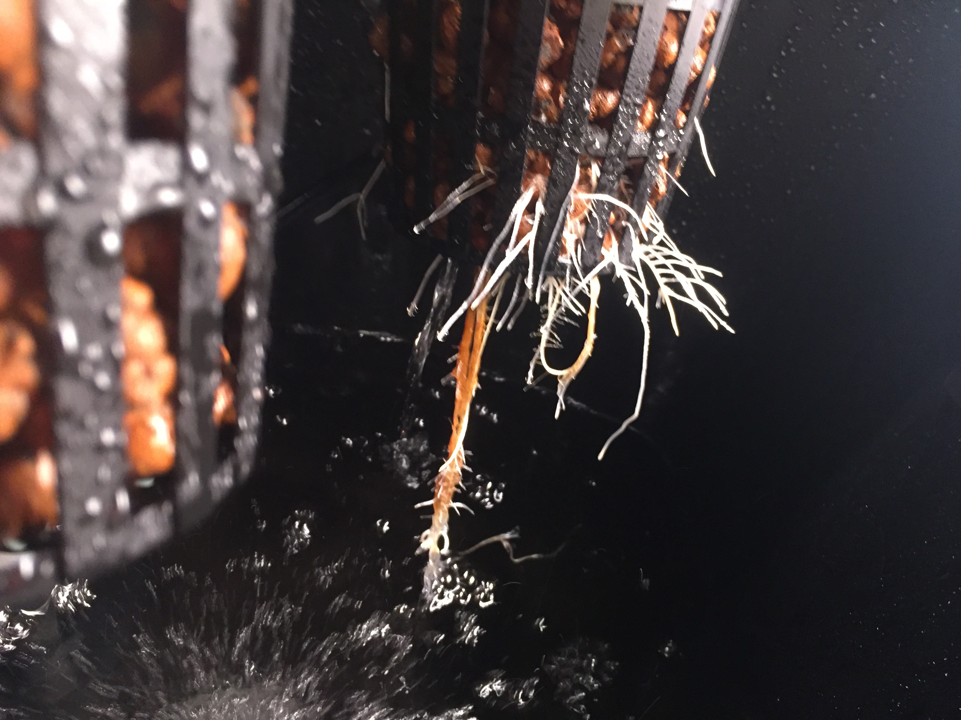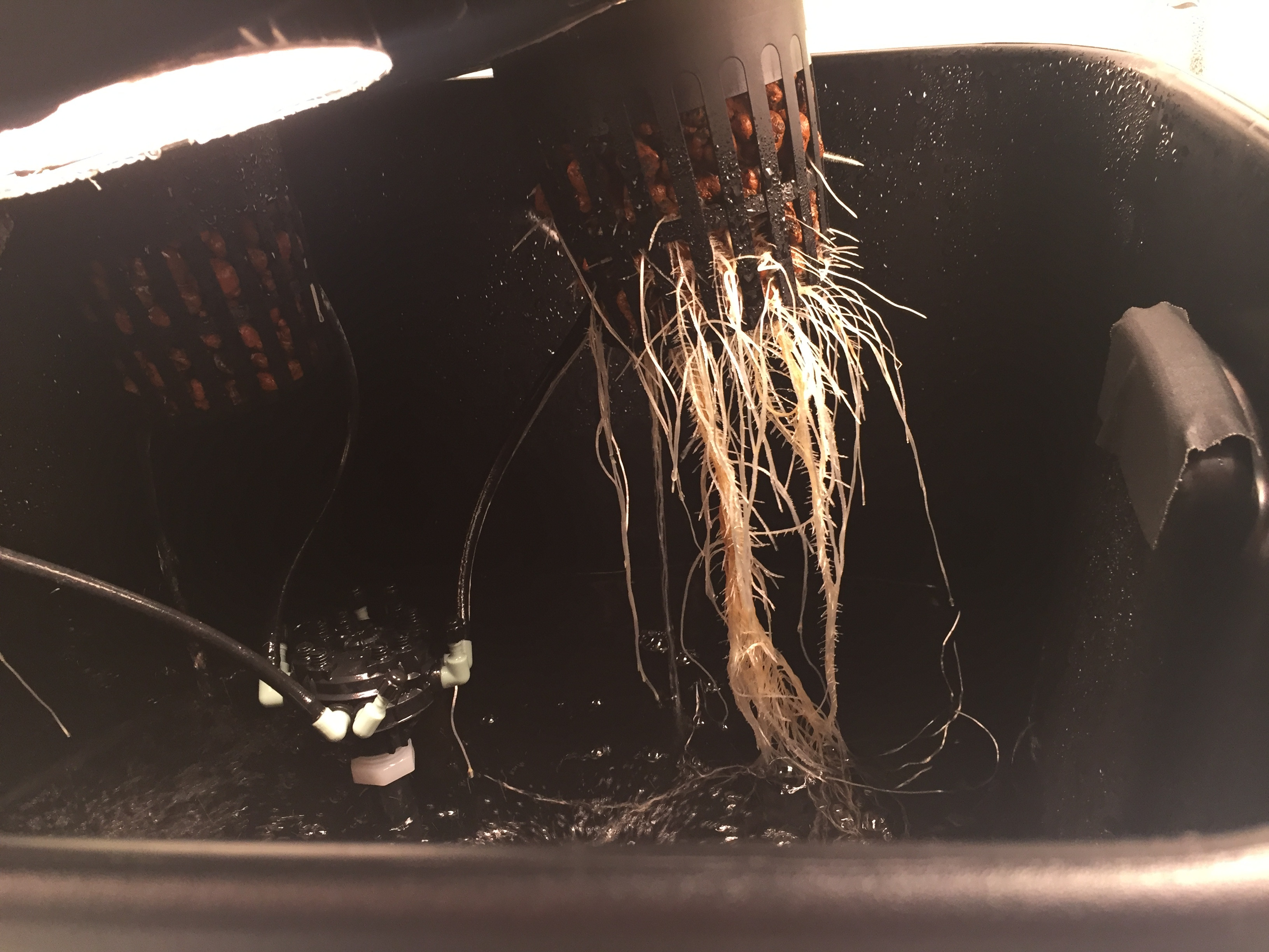These are my first two plants so I'm very paranoid. I can't tell if the main root of this plant is stained from nutrients or if it's starting to show signs of root rot. I included a photo of the seedlings themselves if that helps (the one on the right is the plant whose roots are in the other photo). I use the GH trio and hydroguard schedule defined in the bubbleponics article on here. You can see from the probe the temp gets pretty high in the reservoir (here it almost reaches 85, though I've never seen it above 85). The aluminum tape and mylar aren't helping too much =(.