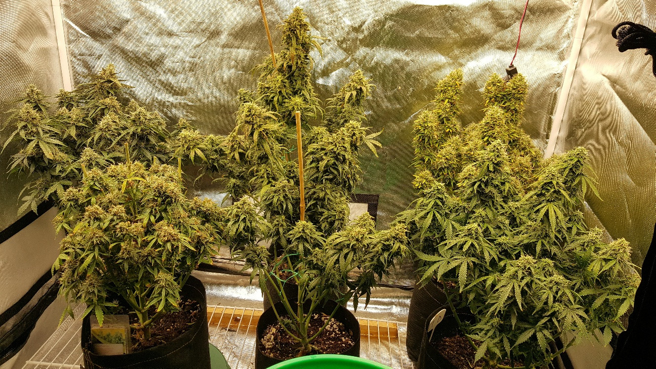 The plant in the upper left first photo (notice the brown leaves from nute lockout and subsequent burning) is the same plant as lower left with the big buds removed. The upper right in both photos has burnt leaves also.