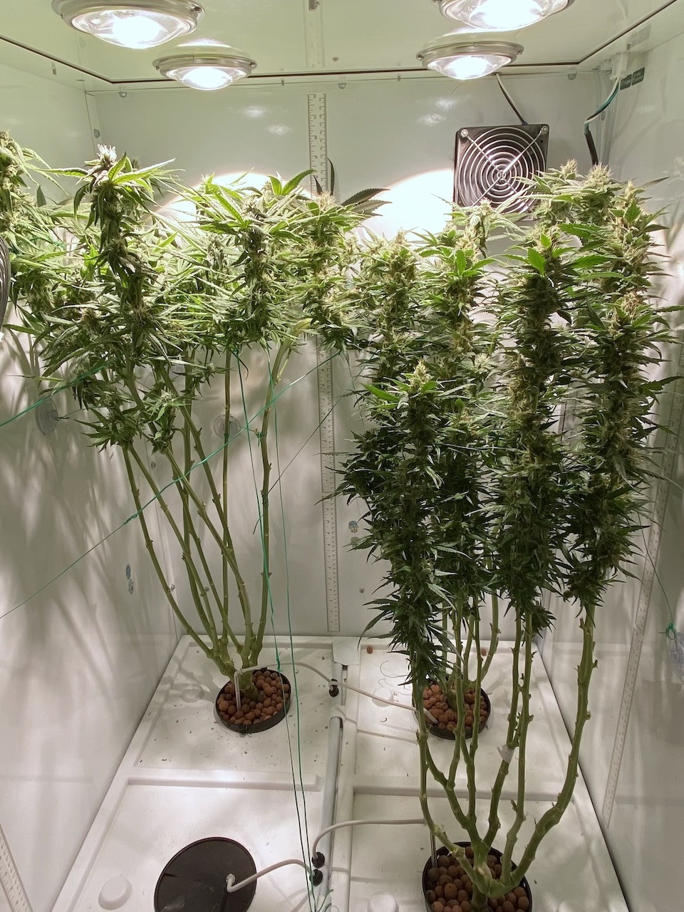 Plants are about to start week 7 of flower tomorrow. I was trying various new strains, and I vegged around 2-3 weeks longer than I was before. Lo and behold, they turned into beanstalks, I had to remove a plant from each box in order to supercrop them. Only one plant--RQS Hulkberry--formed a perfect manifold with 10 beautiful, phat, long colas. The picture doesn't do her justice, but she's front right in this picture:
