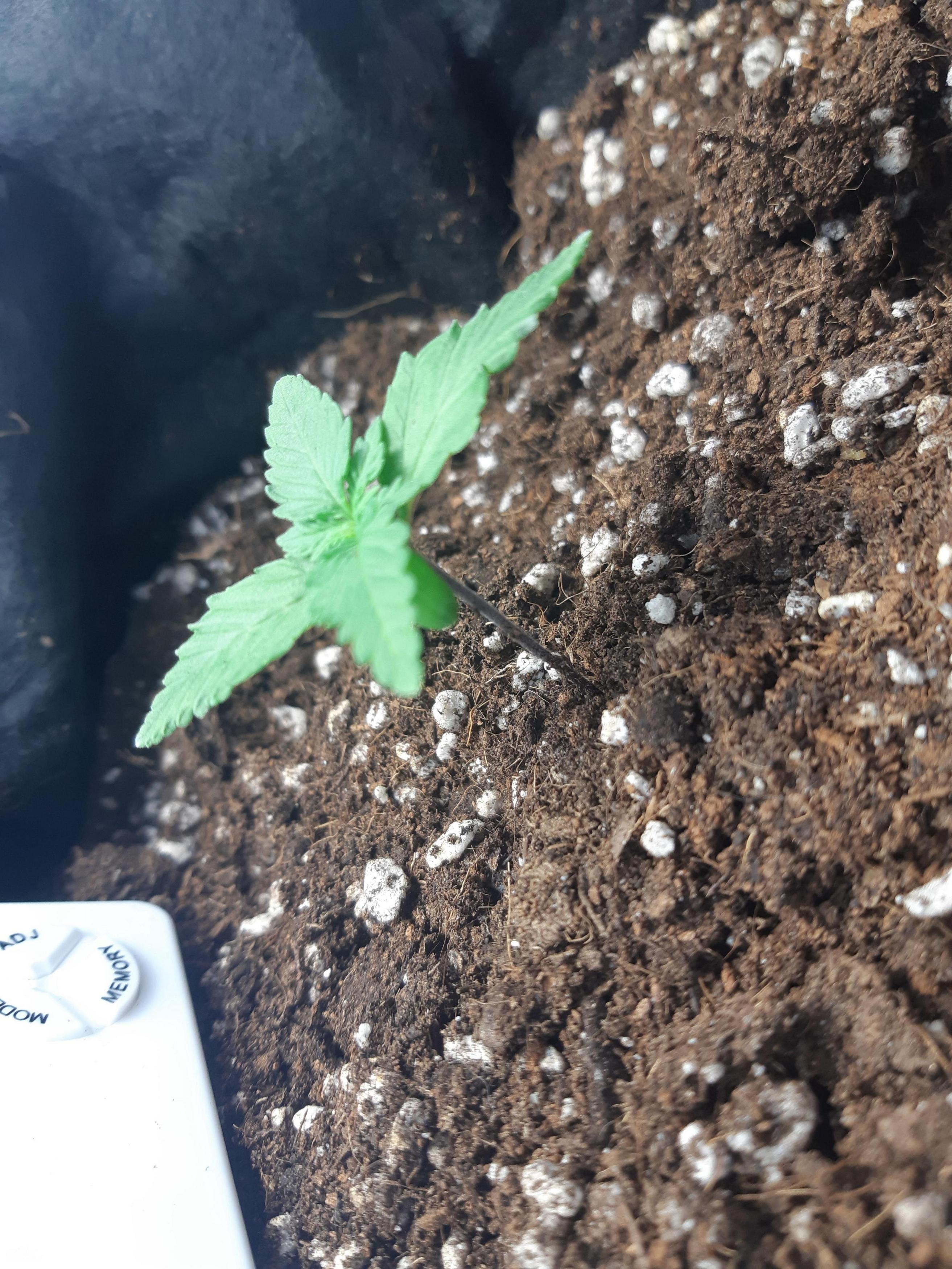 Recently my seedling was upset because of underwatering. Today i noticed some of the serations have turned upwards. Because it has been cold where I live I set the fan to blow air past the cfls down onto the plant. The soil is a mix of canna terra ~50 to 60% and the rest is equal parts of perlite and coco coir. The seedling is about 180 mm (7'') away from 4 x 23 W CFL ~4500K. Temp in the bucket was 26 deg c (79f) rh varies between 40 to 50%. 3 bladed leaves have almost doubled in a couple of days so the plant appears to be happy. The soil is almost dry to my second knuckle.