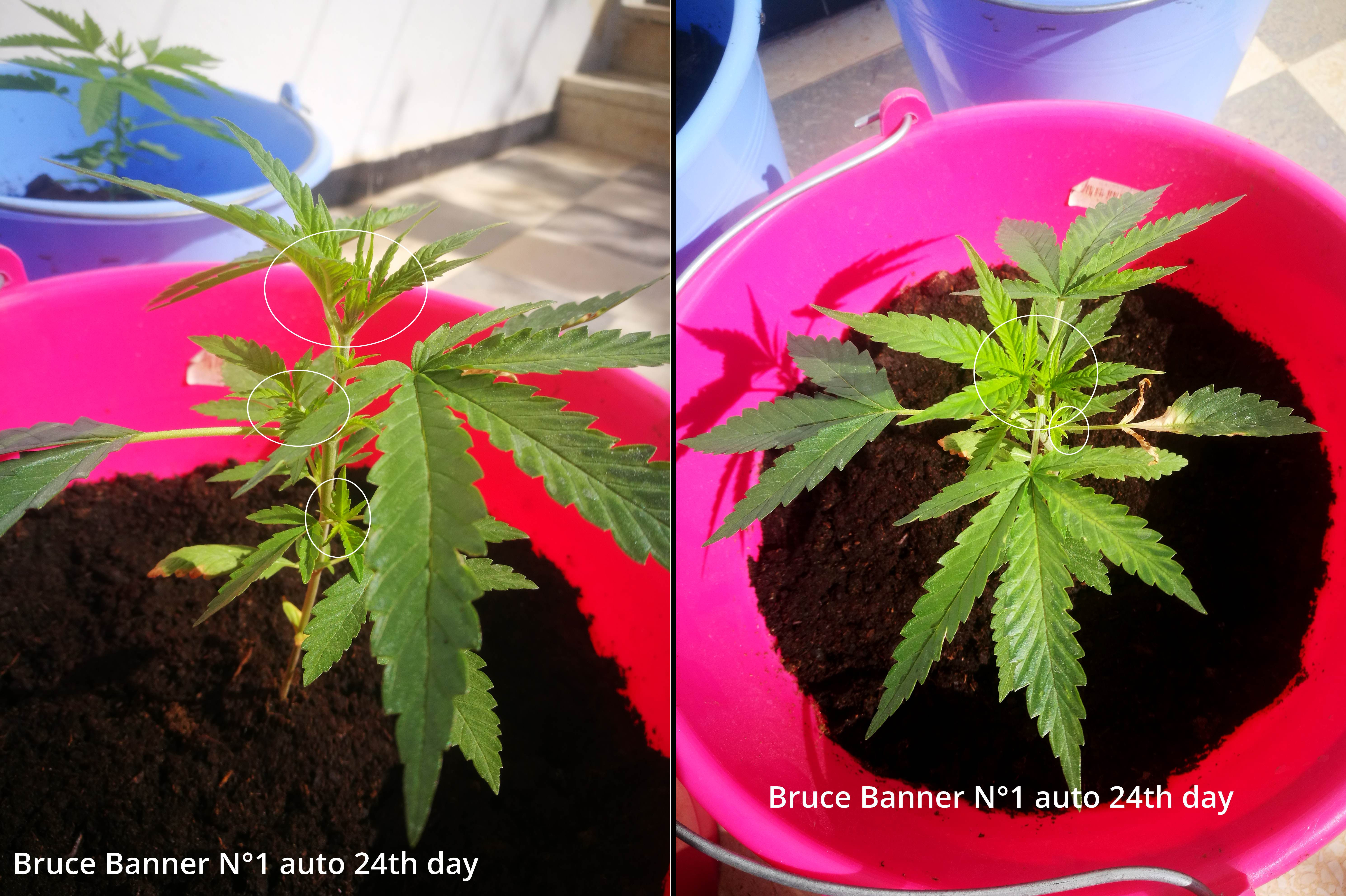 So, the 24th day and my Bruce Banner auto N°1 recovered from Iron deficiency but N°2 not yet (even if the leaves are turning green again) but the growth seems stunted! the other leaves are "greener" "darker" than the N°1.