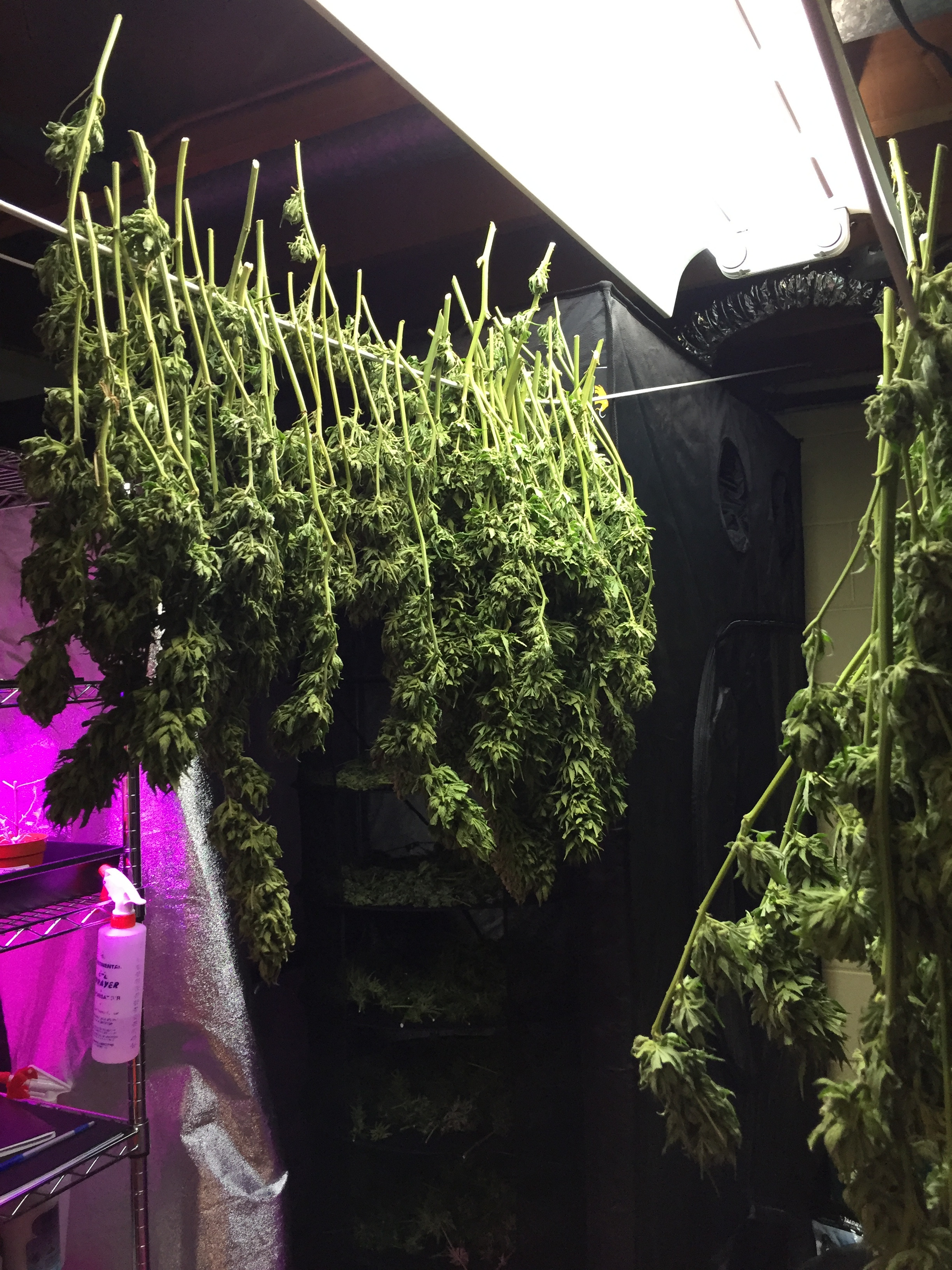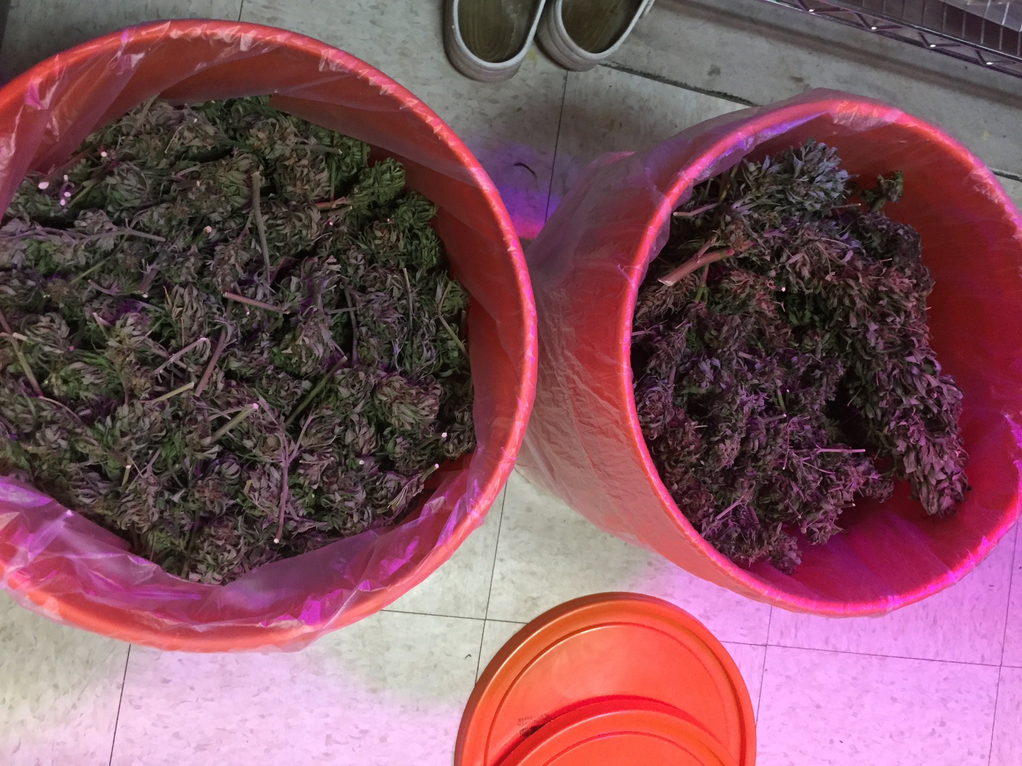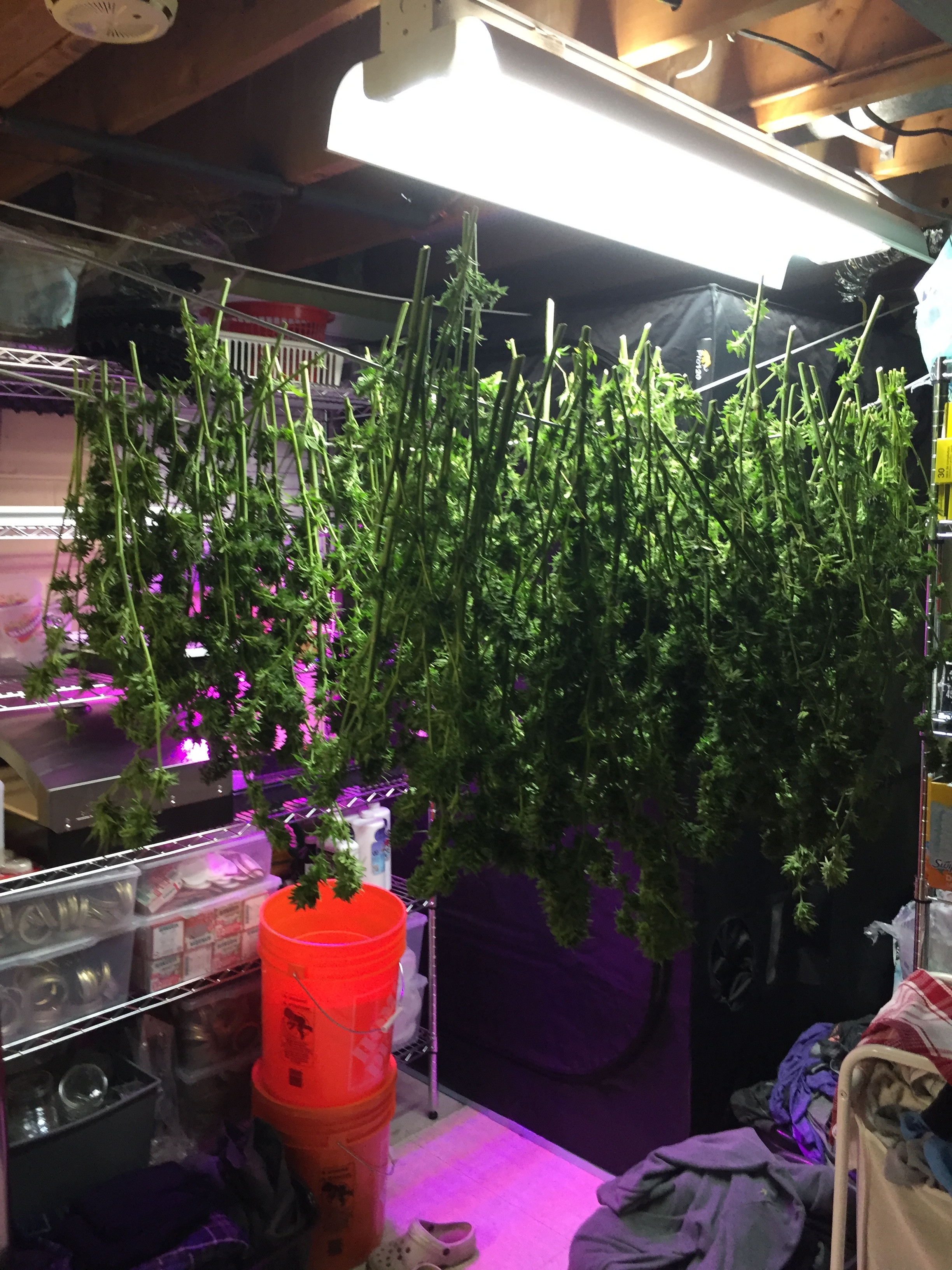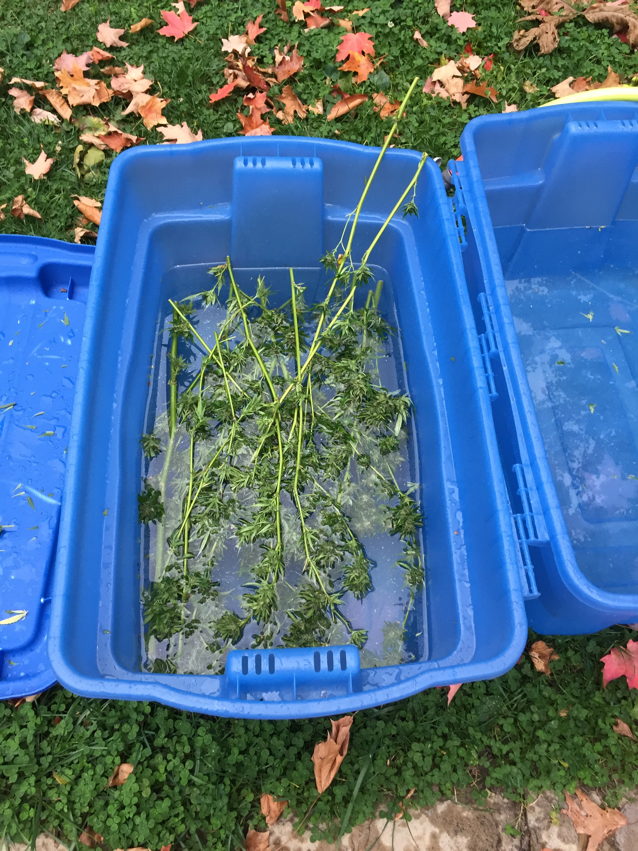 It's harvest time at my place. This is my second time growing weed. Total of 19 plants, 4 strains. Love potion, white widow, power africa mk ultra and gorilla glue. I had powdery mildew again this year so I do the hydrogen peroxide wash and rinse during harvest which removes the mildew really well. Cutting, washing, drying and putting into buckets for the cure. My house really smells good!