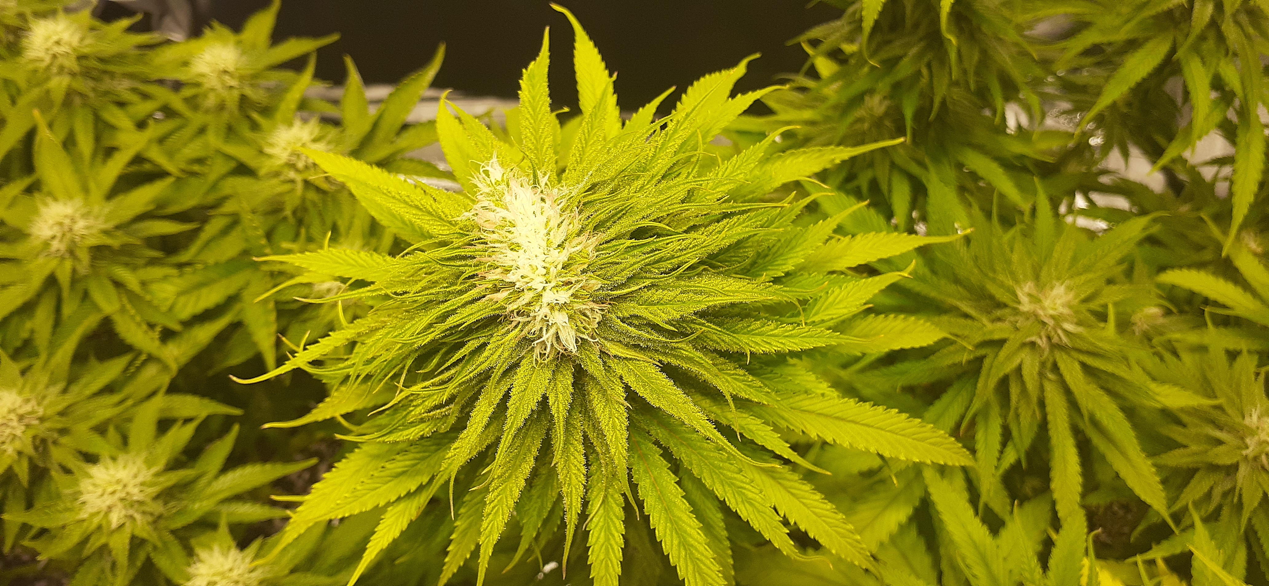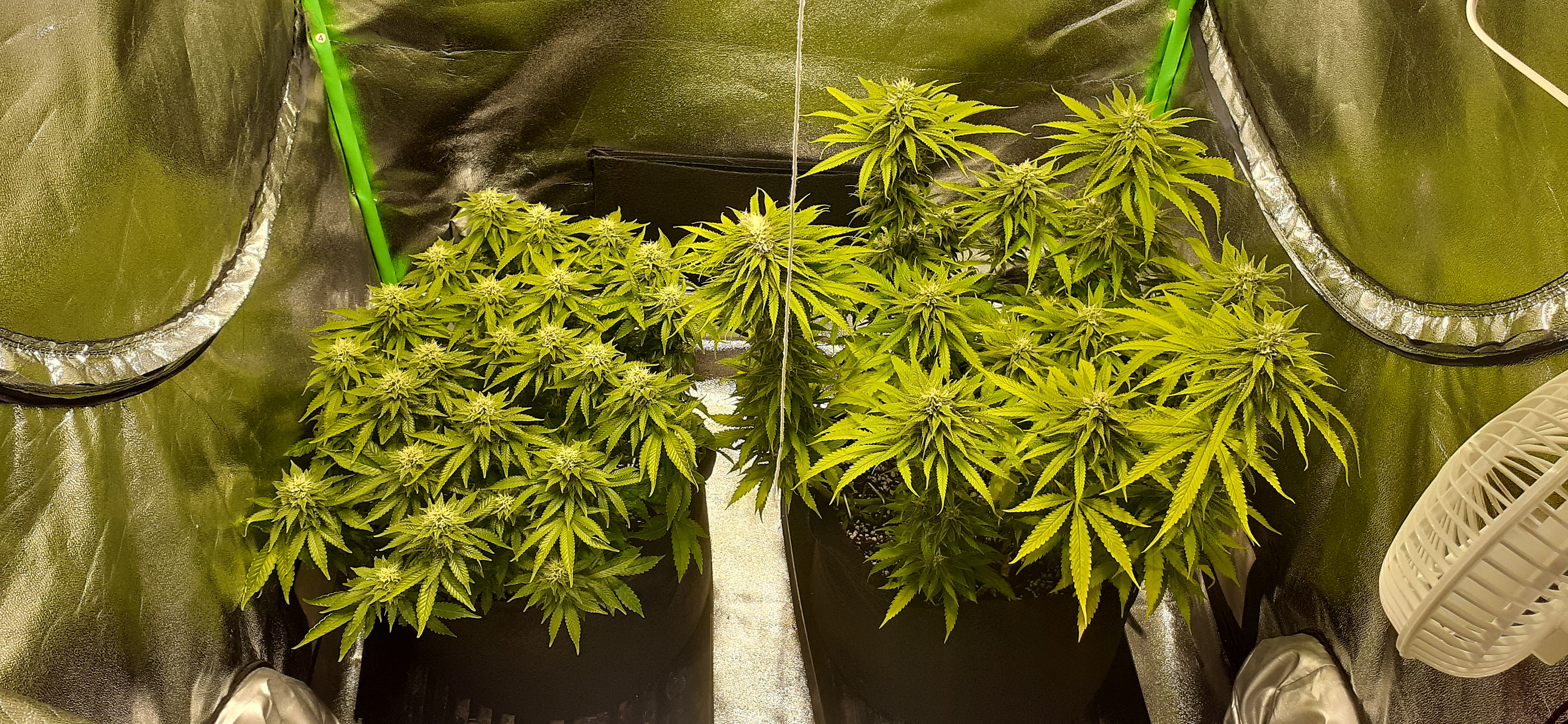 Hey guys. So i decided it would be cool to show my grow right now. With everything that has been going on i have not been as on top of my plants as i usually am so keep that in mind. I know i have slight nute deficiency but i already knew this grow was not going to be my best due to my dogs passing and my current health issues (actually going to have surgery on tuesday). one thing that is cool and the reason i wanted to show it off is it seems i have a plant with a mutation, possibly polyploidism, and i wanted to show it off. The smaller plant is Cherry Kush and the larger is GSC which has the polyploidism. Probably a month into flower but like i said with everything going on i have not kept track.