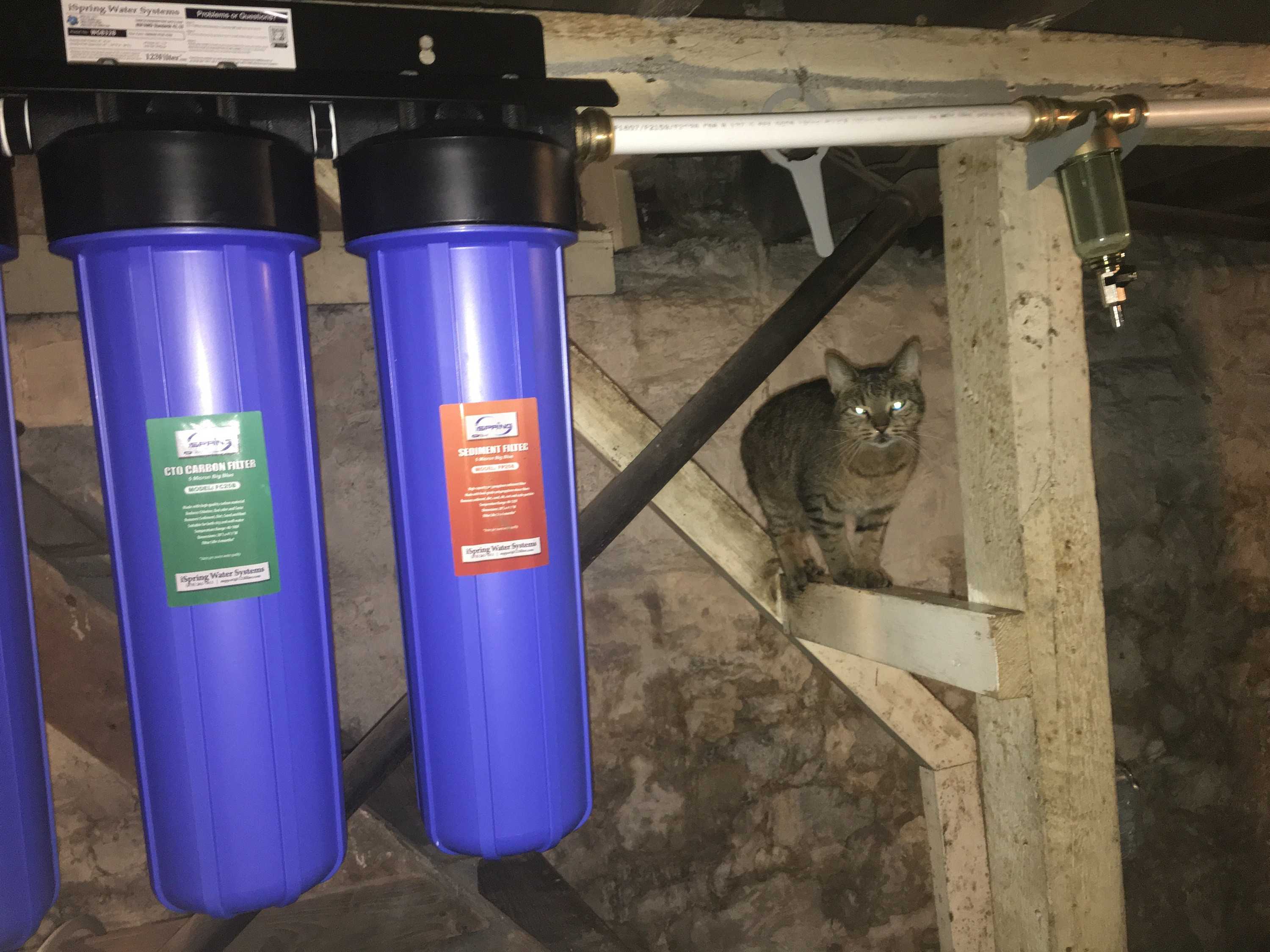 On the far right is the coarse sediment filter which comes with a 50 micron screen to stop sand particles. There is a drain for flushing out the bigger stuff. I've been checking most every day and I'm still finding stuff in it. No wonder the ancient pipes under the floor were so choked. At center is Jinger supervising. No, I didn't name her or choose that spelling. (It doesn't rhyme with stinger.) Above her whiny head is the filter wrench for the sediment filter.