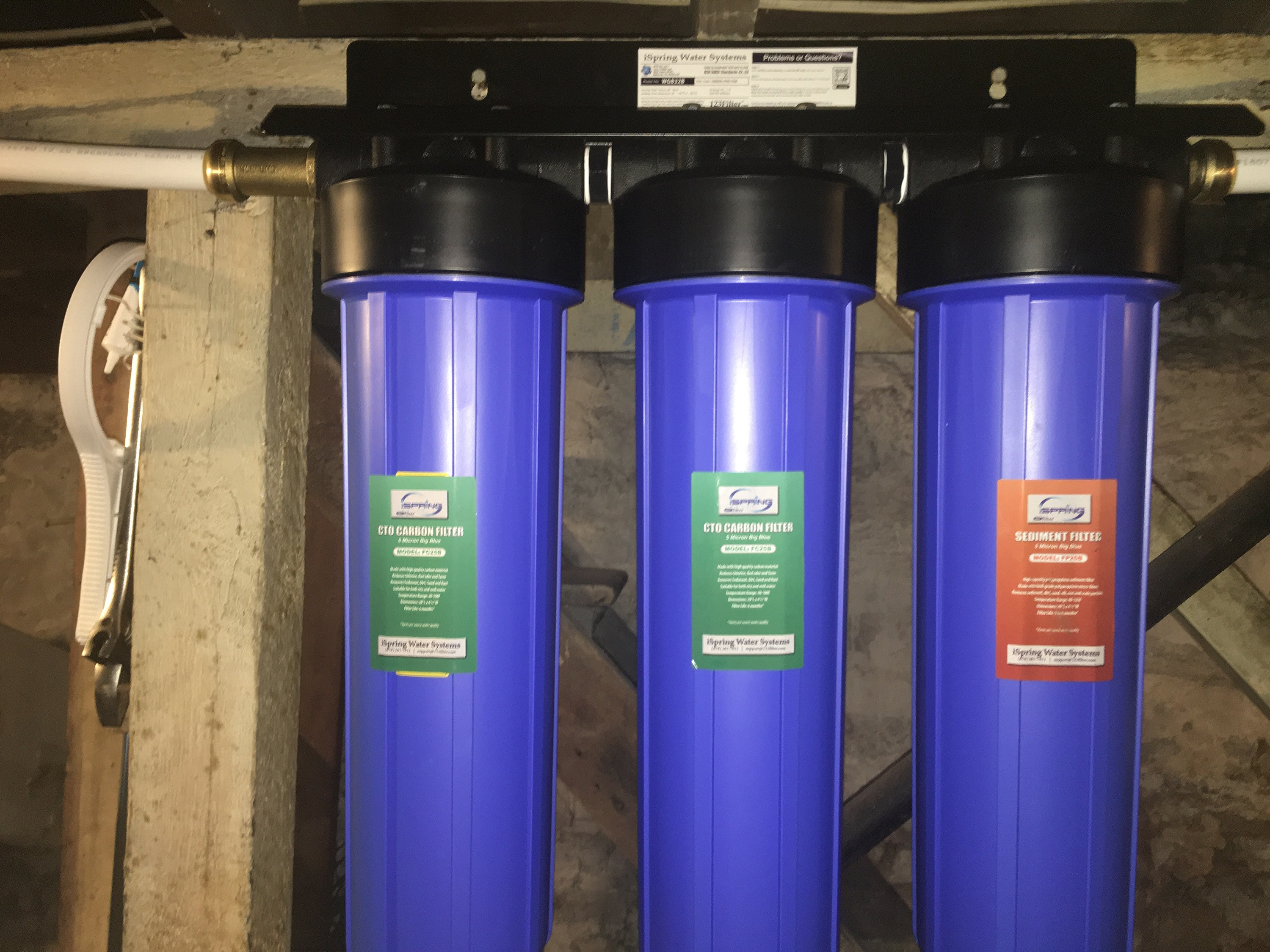 This is where the smaller stuff is dealt with. At right is a 5 micron sediment filter I believe is made from recycled polypropylene. The other two are carbon filters. I could later replace the leftmost one with a metals filter. It removes lead(good) but also removes iron and manganese and other minerals plants use. I will test for lead later and decide if it is necessary. At left hangs the filter wrench for these monsters plus some silicone grease for the o rings and a massive crescent wrench for adjust the jack posts for levelling the floors.