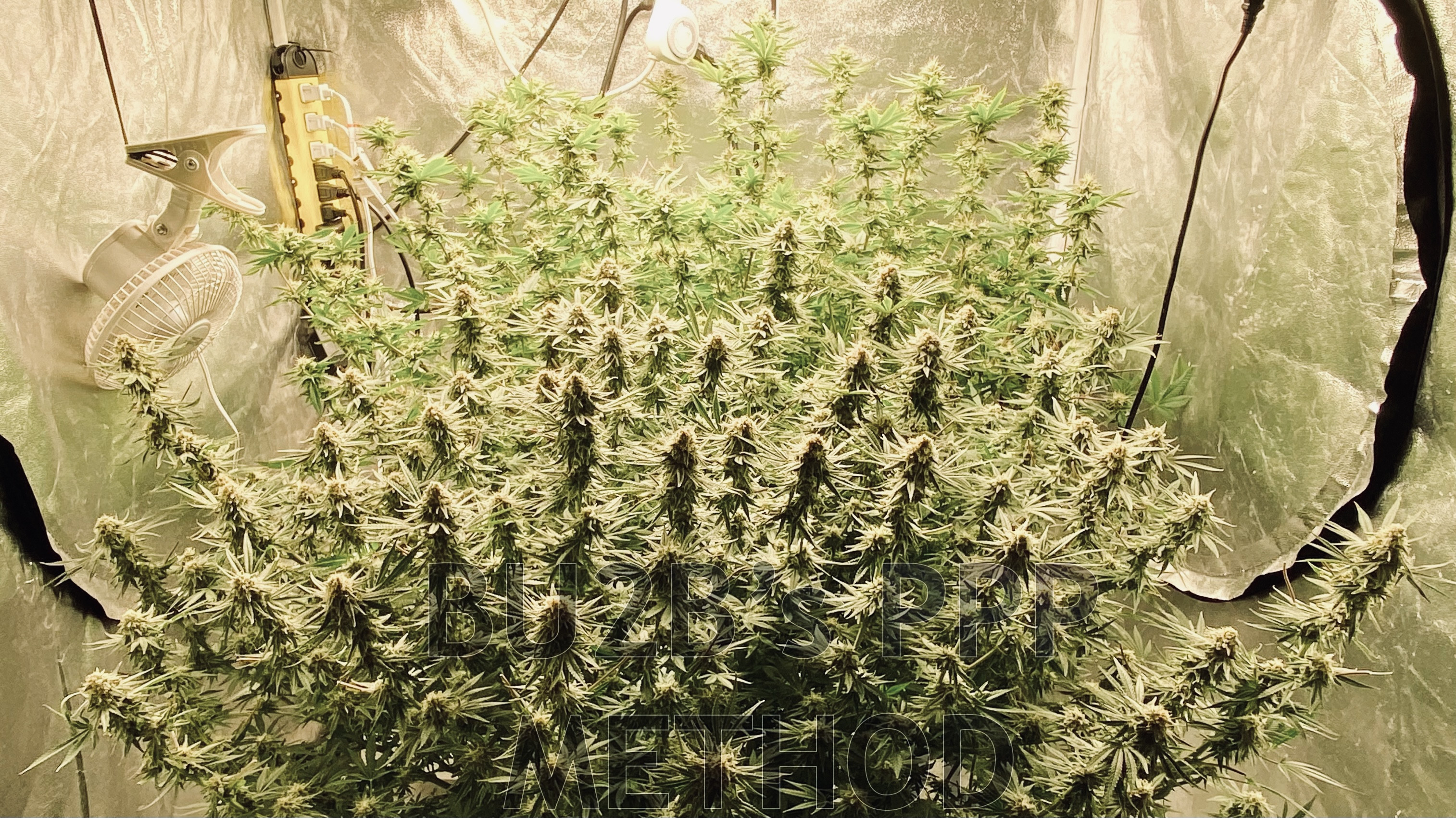 Method testing- I found 4 plants don't produce any significant advantage in flower production or weight of cured flowers over 2 if using this method (if grown in a 4x4 tent.) Just more work. With 4 plants in my tent, dried and cured harvest per plant averages about 6 ounces. Your final outcome is likely to be smaller due to limited size and the inability to open plants up during vegetation & flowering as you can with just two plants in your tent. The grow shown here produced 23 ounces, the following grow, with 2 plants produced 28.