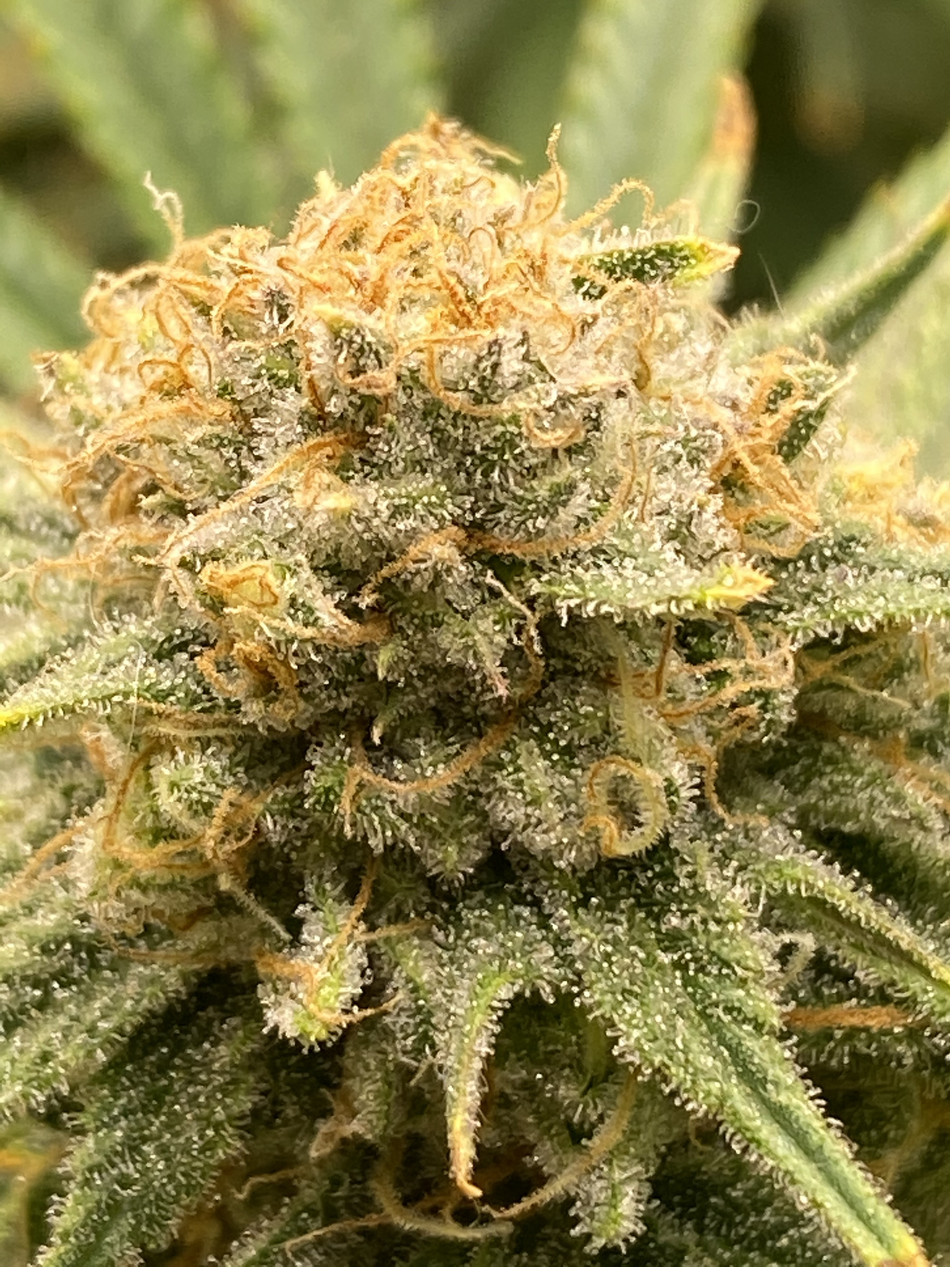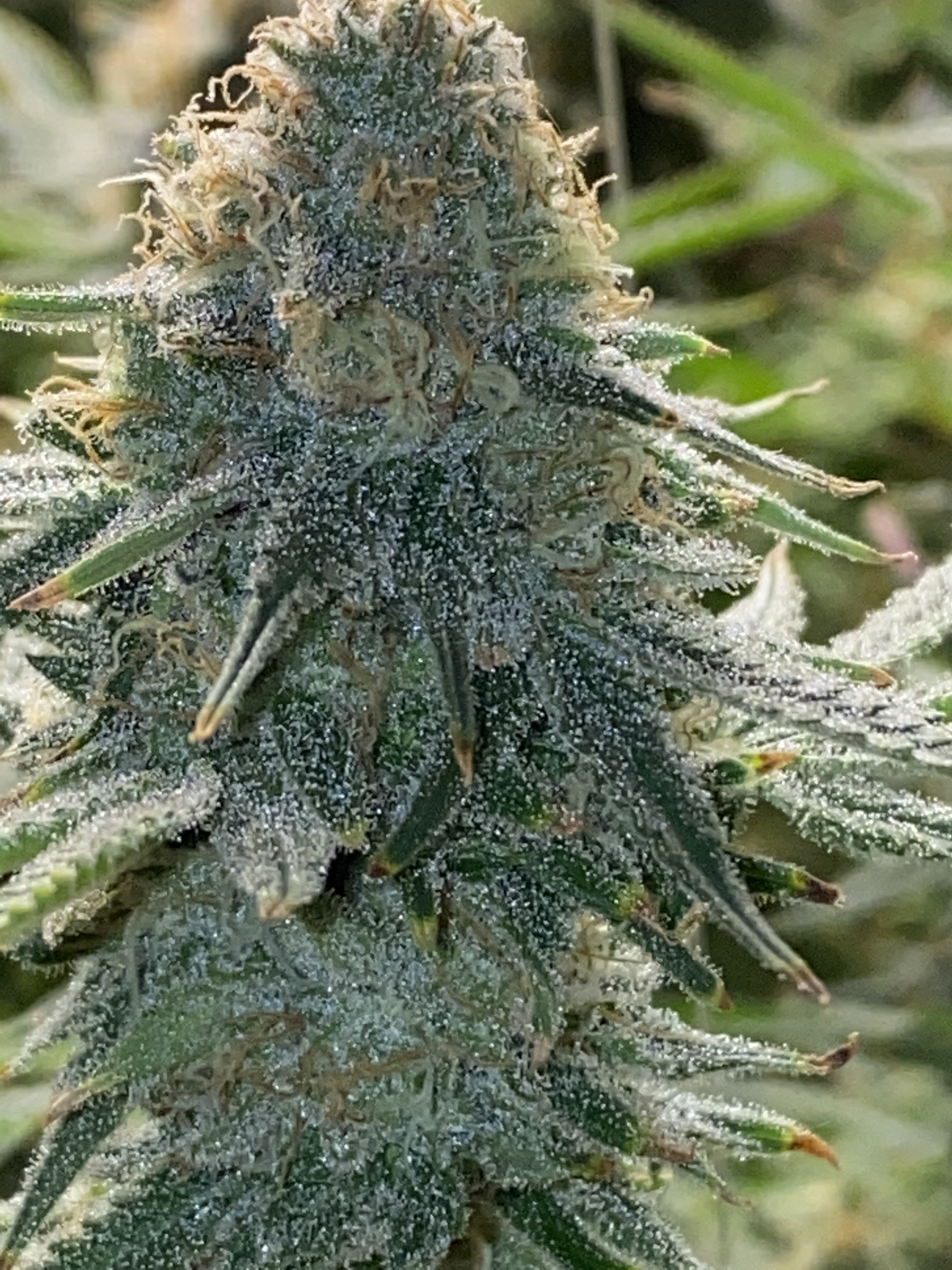 As your plant nears harvest your flowers are going to look similar to the one shown above. Lots of trichomes, most of them cloudy, maybe 30% amber or more (depending on your preferences) and pistils have changed color; for all practical purposes it looks good to go.