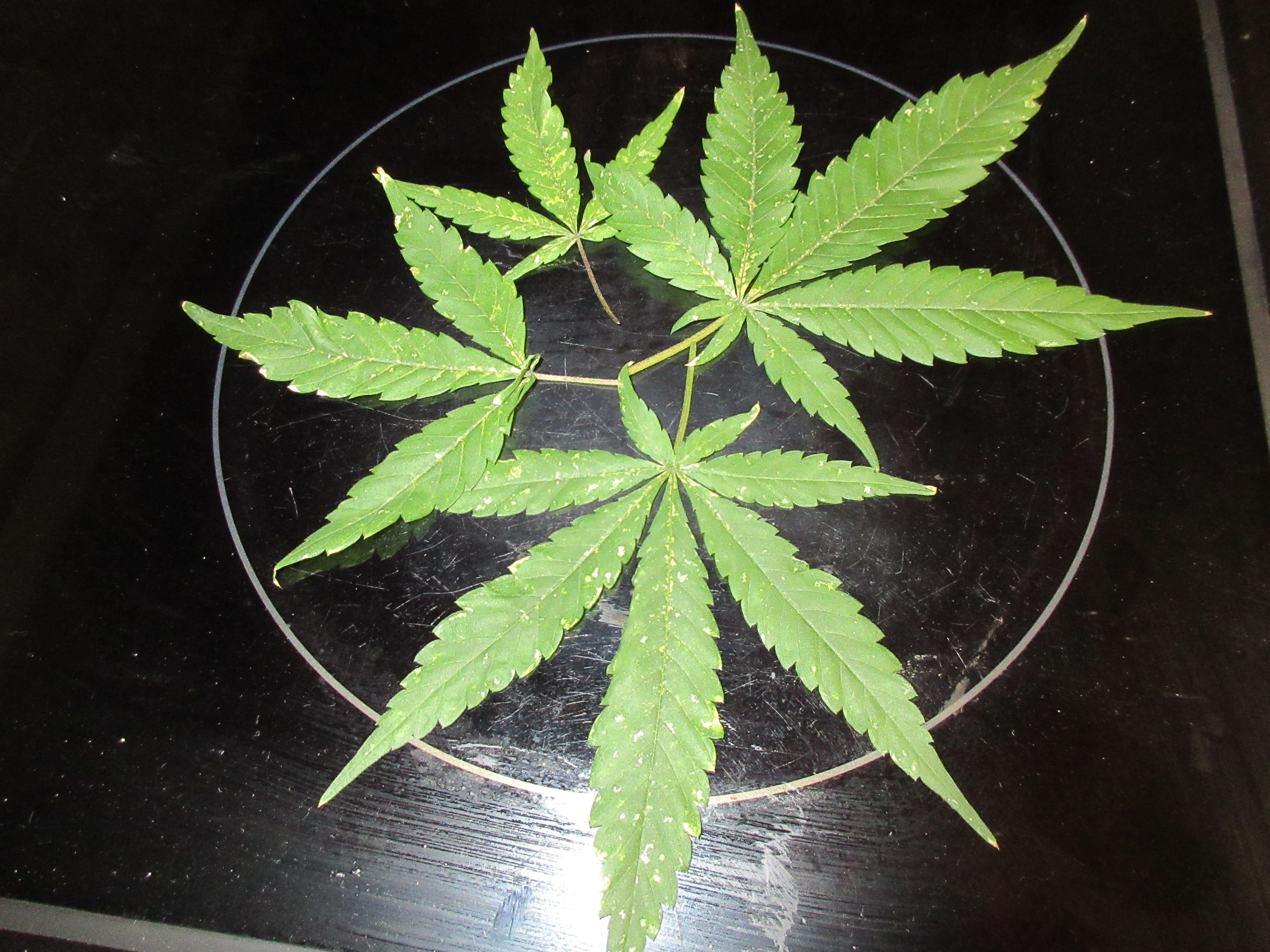 I have successfully taken and fully established five clones (10 weeks old) from my Durban Poison plant. I now want to switch them to bloom. However, I have recently noticed that some of the leaves on all the clones have specks on them - see photo1. I have checked for spider mites under magnification but can see no signs of bugs on either side of the affected leaves. Also, some of the unaffected/less affected leaves are curling and twisting - see photo 2. I have been very sparing on nutrients and water only when soil is dry.