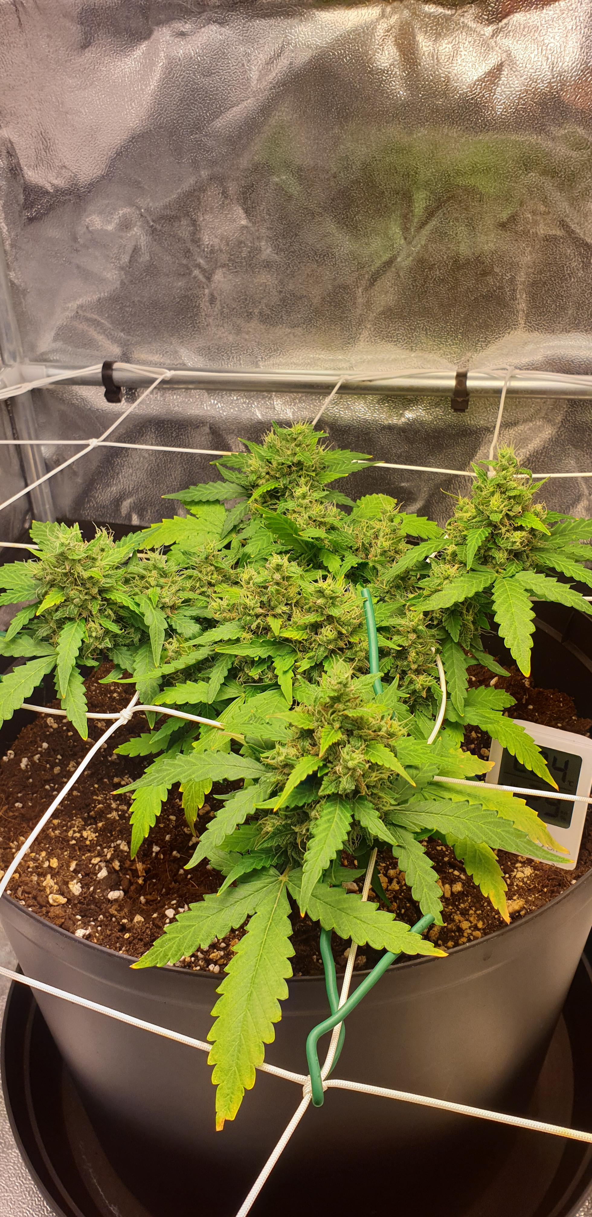 That scrog looks good for a short plant never did a scrog with auto just once with photos and i had a mess of work to keep up on the canopy so only did it once. She sure is a plump little gal reminds me of my 3 short stubbies i'm growing. They are photos though i trained to short and they were clones but they are fat little stubby colas like golf ball size buds so i'm happy like you. I believe i did my last water/molas feed 2 days ago i'm just gonna let them dry out a bit get that amber more in the trichs. Very pretty plant you got there.