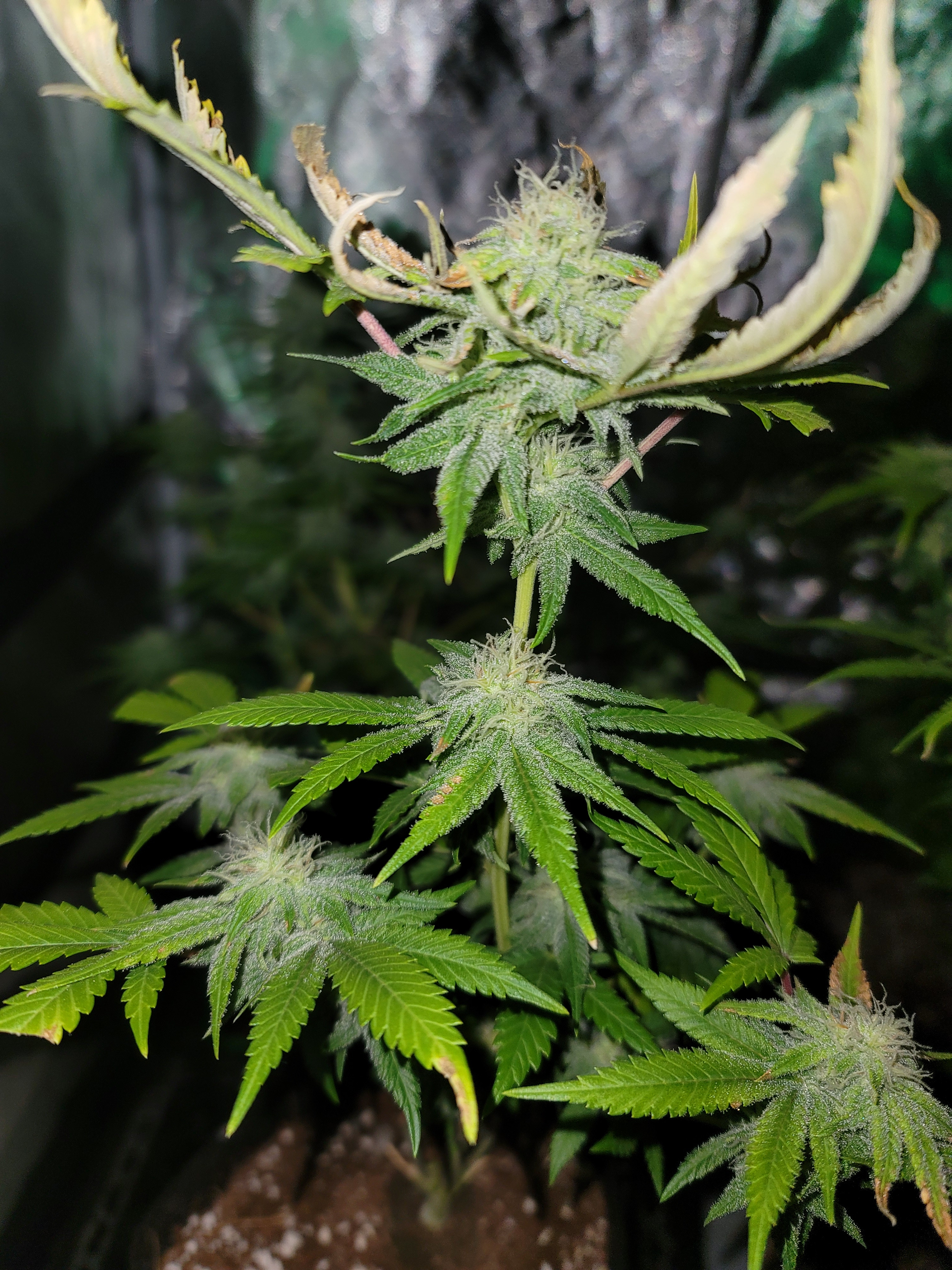This is a clone from a WW plant, in a 1 gallon pot, growing in coco and currently 5.5 weeks into flower, plant is healthy besides this discoloration and crispy leaves at the top. I thought my humidity was too low so I set my dehumidifier from 35% back to 50%. Then I thought it was underwatered and began to water intermediately- that didn't fix it. Anyone seen this behavior before?