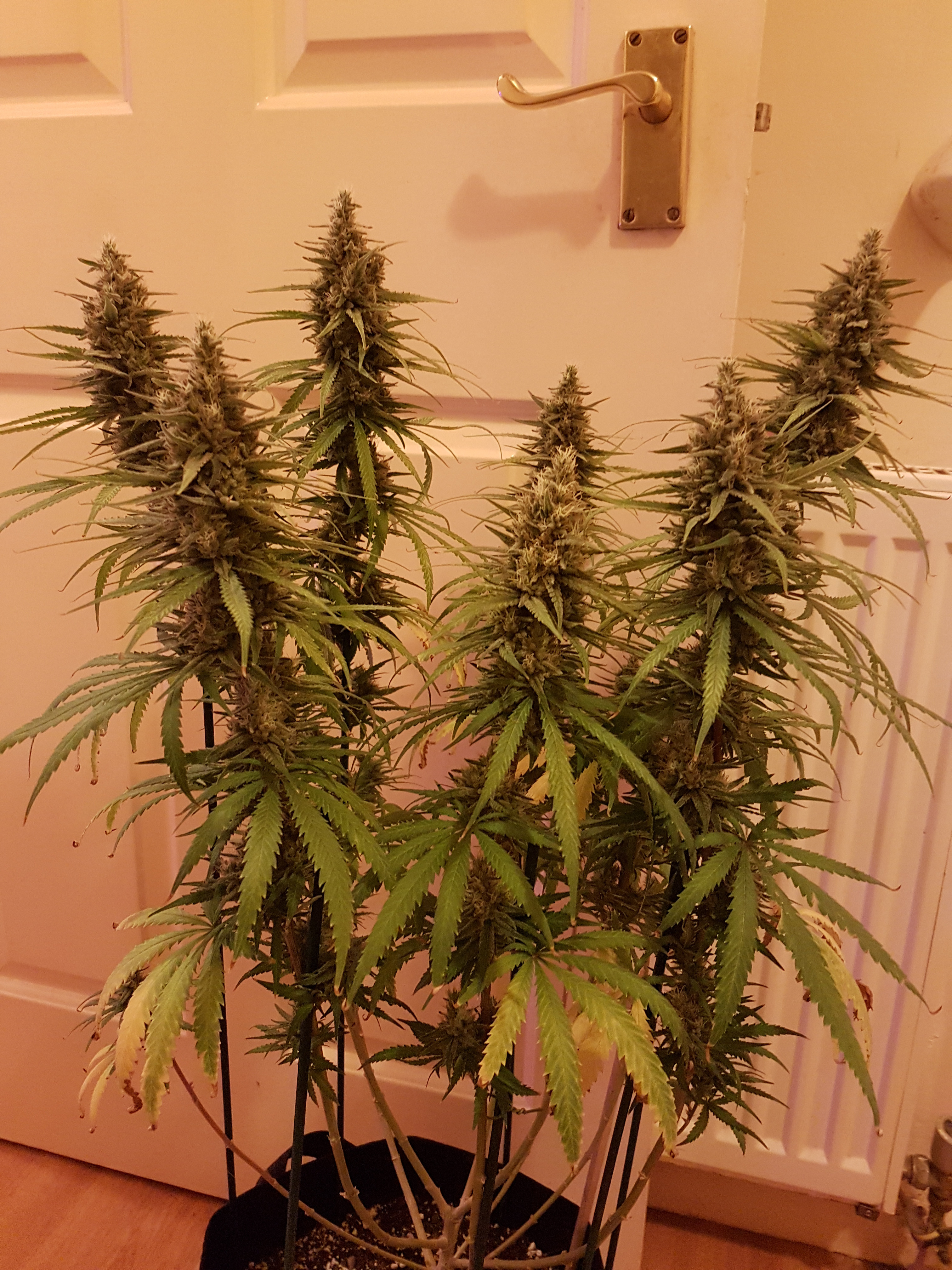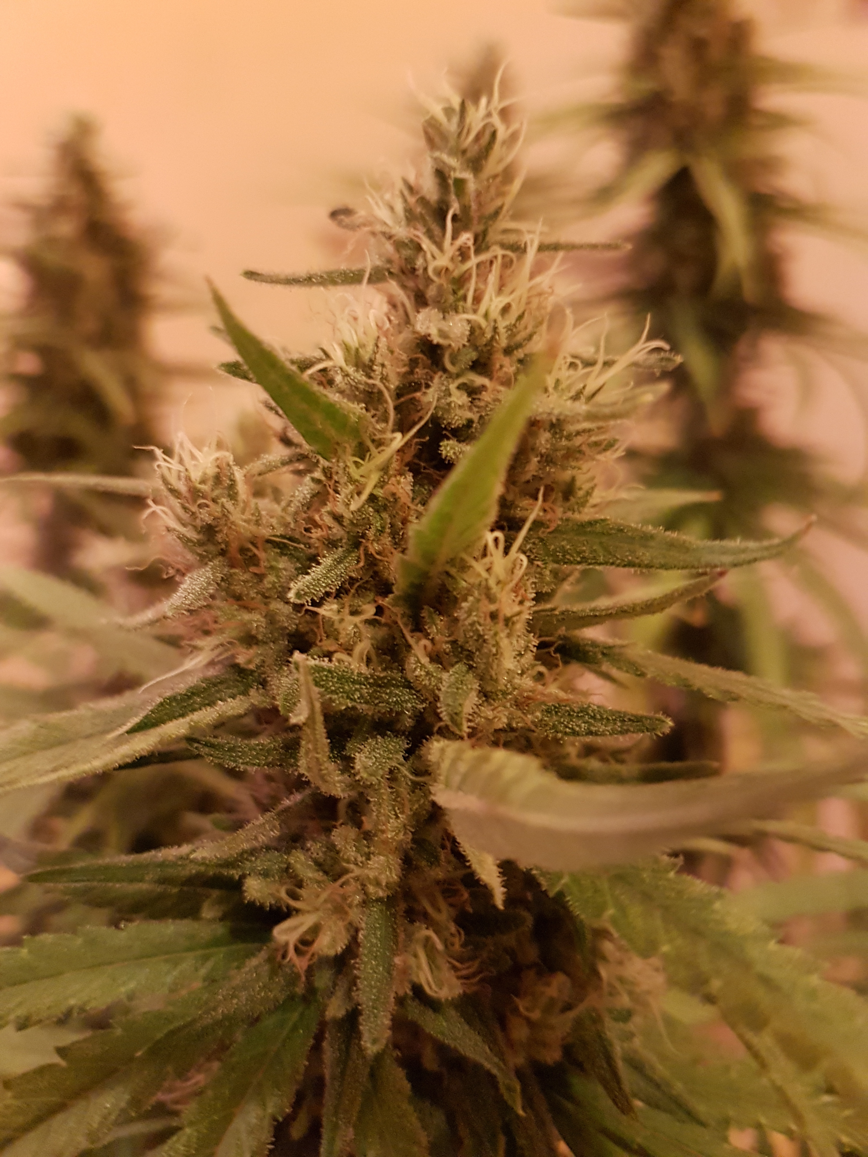 Hi all, one of my Fat banana plants seems to have had an explosion of foxtailing in the last 24hrs or so i think it was caused by temps hitting 34c few days ago. i have been opening up the tent during lights but we've also been using the heating a lot more due to a drop in outside temps. This has caused an occasional spike in temps recently so pretty sure that's the reason for the foxtailing I'm getting. I have signs of it on my other fat banana plant but no where near the scale i seem to have it on the tall one. The one fat banana with the least foxtailing will be getting harvested in the next day or 2 so although its a little disappointing to see it at this stage of the grow i'm not too bothered by it. The other one on the other hand I'm a little concerned with as she won't be ready for about another 4-5 days. The buds are dense but now with the foxtailing it feels much looser on the outer bud with a lot more white hairs than i had previously (was about 75% brown before). Am i better off harvesting it a little early now or should i just let it go and what will be will be? Any suggestions on what is best to do would be appreciated. To me the buds look ugly now and have lost there neat and tidy conical look that they had. I've included a couple of pics of the plant in question. Trichomes are about 95% cloudy and a small amount of amber but does still have the odd clear one.