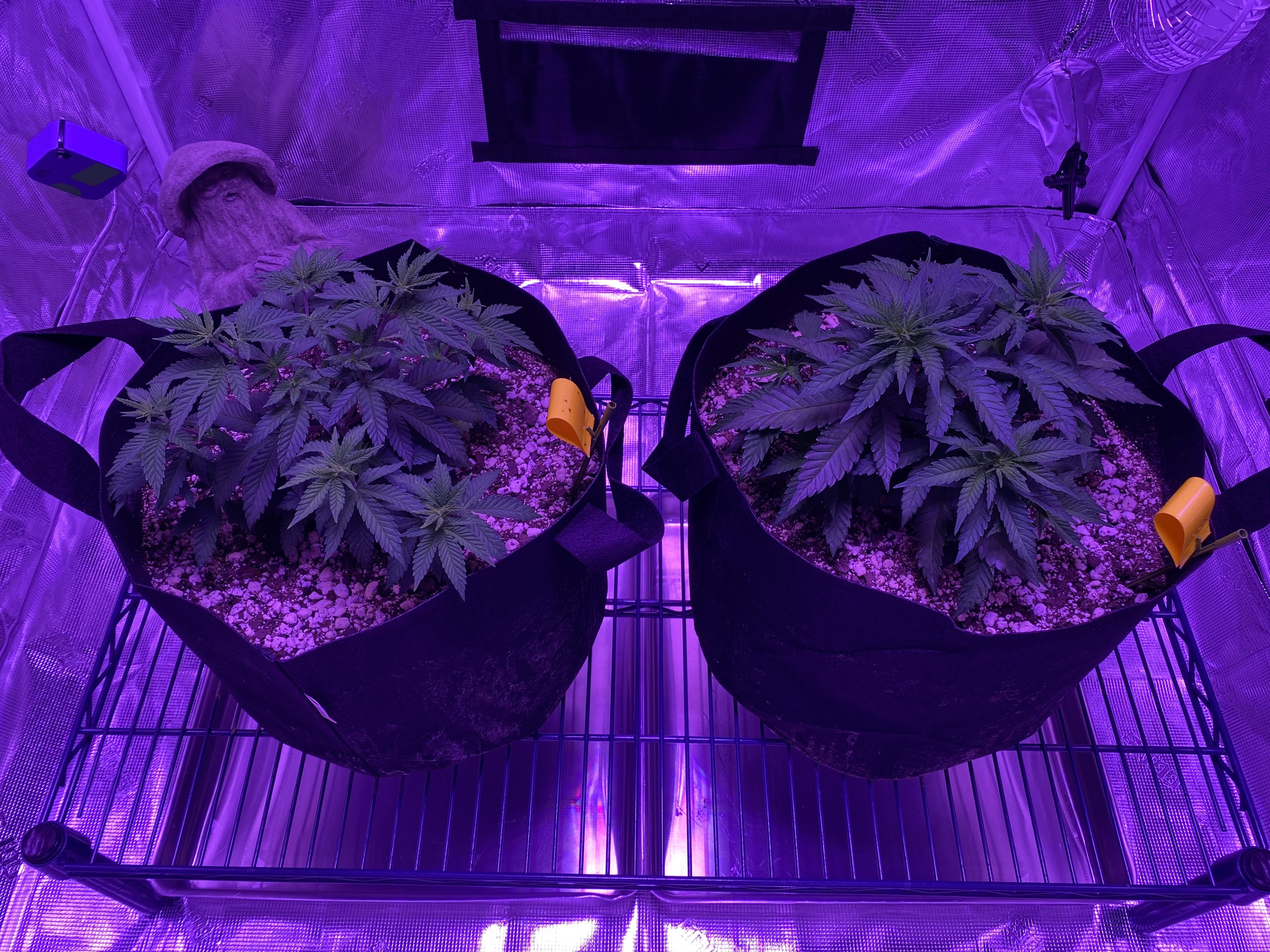 Hi everyone. I have two Girl Scout Cookies photos that are about 5 or 6 weeks old from seed. They are growing in FFOF with perlite using the FF dirty dozen nutes. I don’t know why, but they seem to have very different structures. Lefty is much more spread out with smaller leaves and more growth sites. Righty is more compact and stout with fewer growth sites but much larger and more compact leaves.
