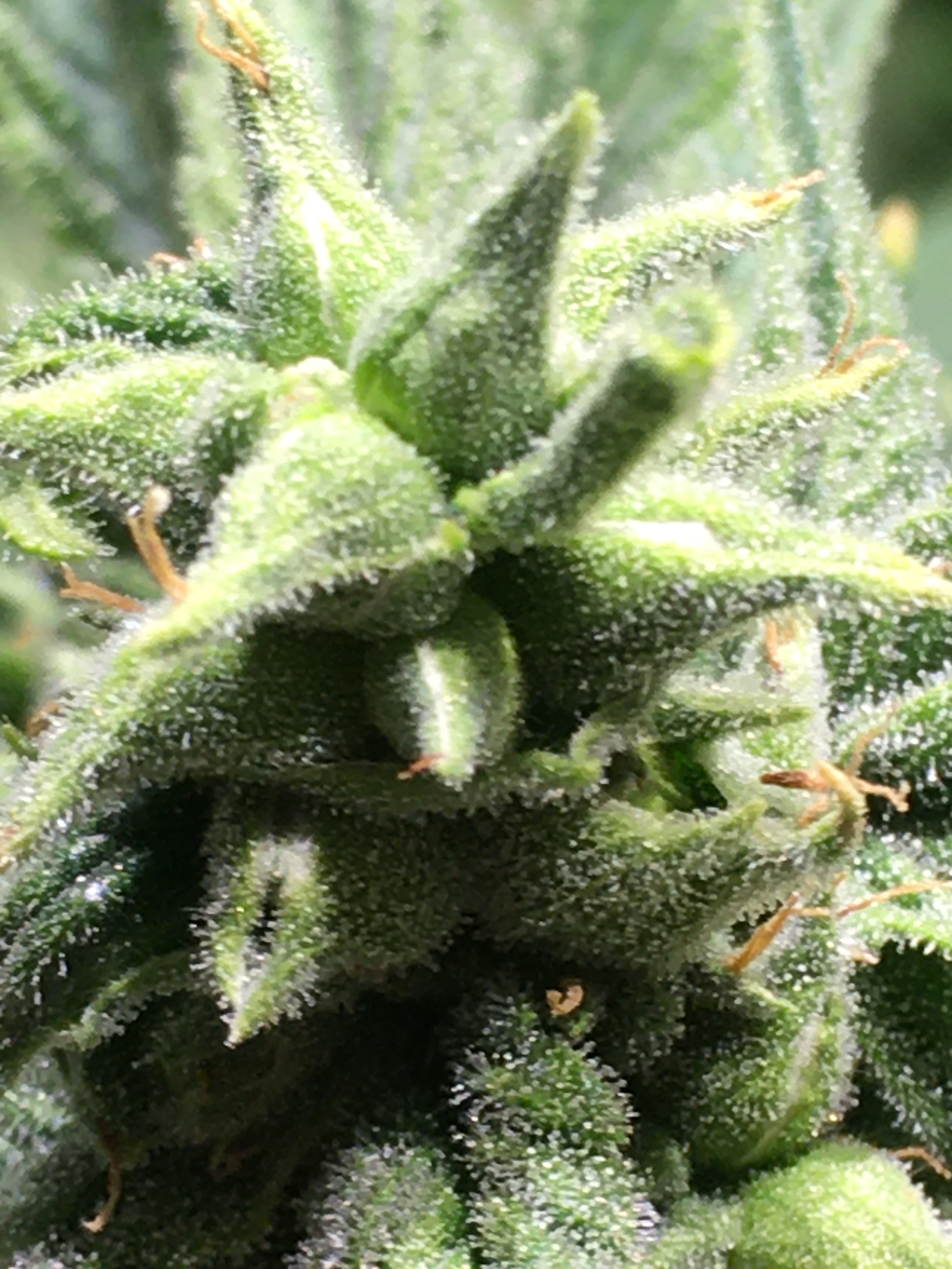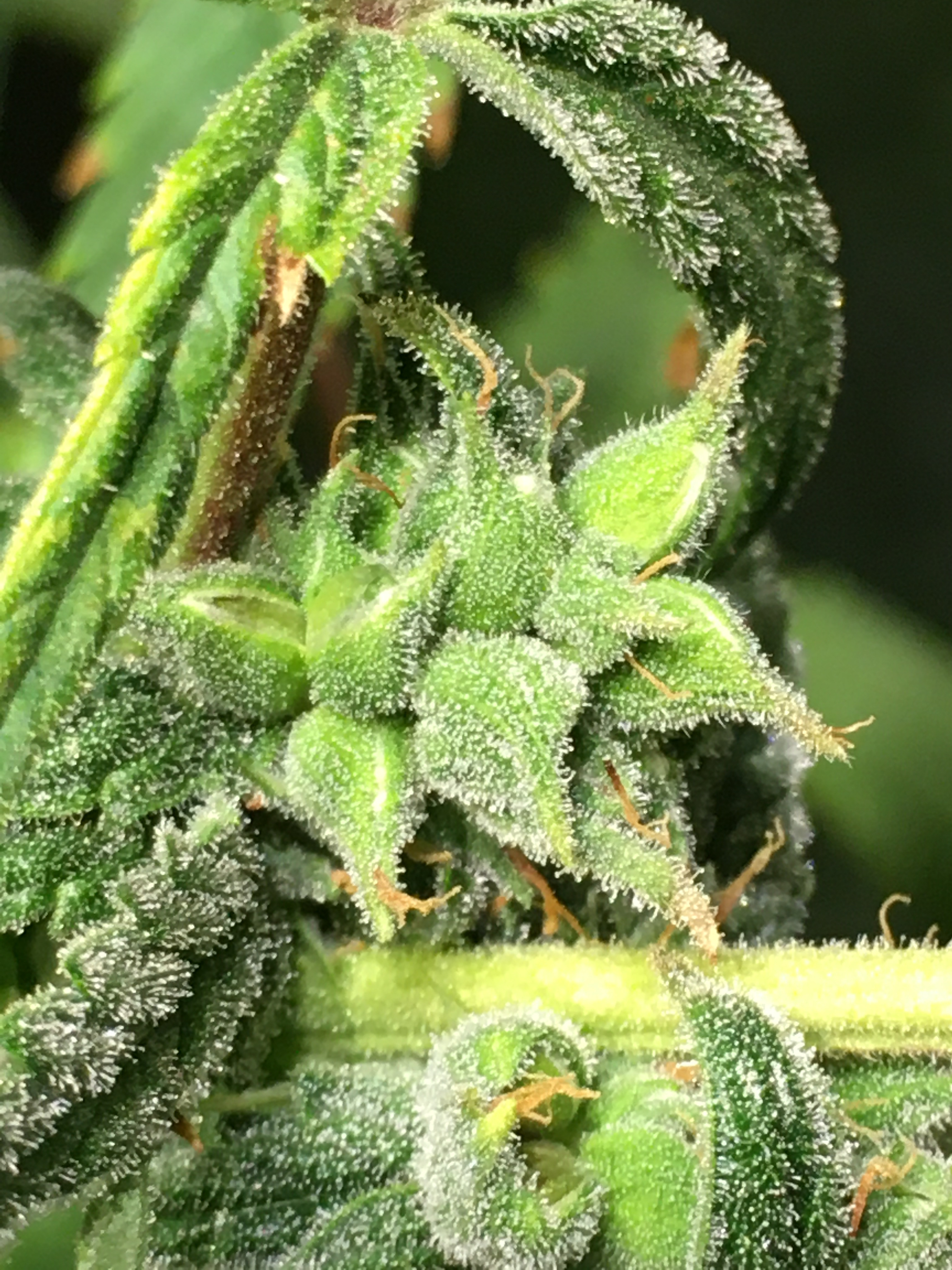 Week 7! Maybe only two more to go? GTH now smells very peppery with only the girls in here. Bud porn is a little out of focus but one shot does show how the bracts are stretching and splitting. I've employed a yoyo that was never taken out of the tent to hold up one of the branches. Most others are laying over from the weight of the seeded bud. Another tent like this one and another light like this tent uses are on the way! I plan to grow out my feminized stuff in coco with space for manifolding and all that good stuff that gets you baseball bat colas if you do it right. Cindy 99 will be next here. I can't justify waiting any longer, so another seeded grow with a sativa-dominant monster is coming.