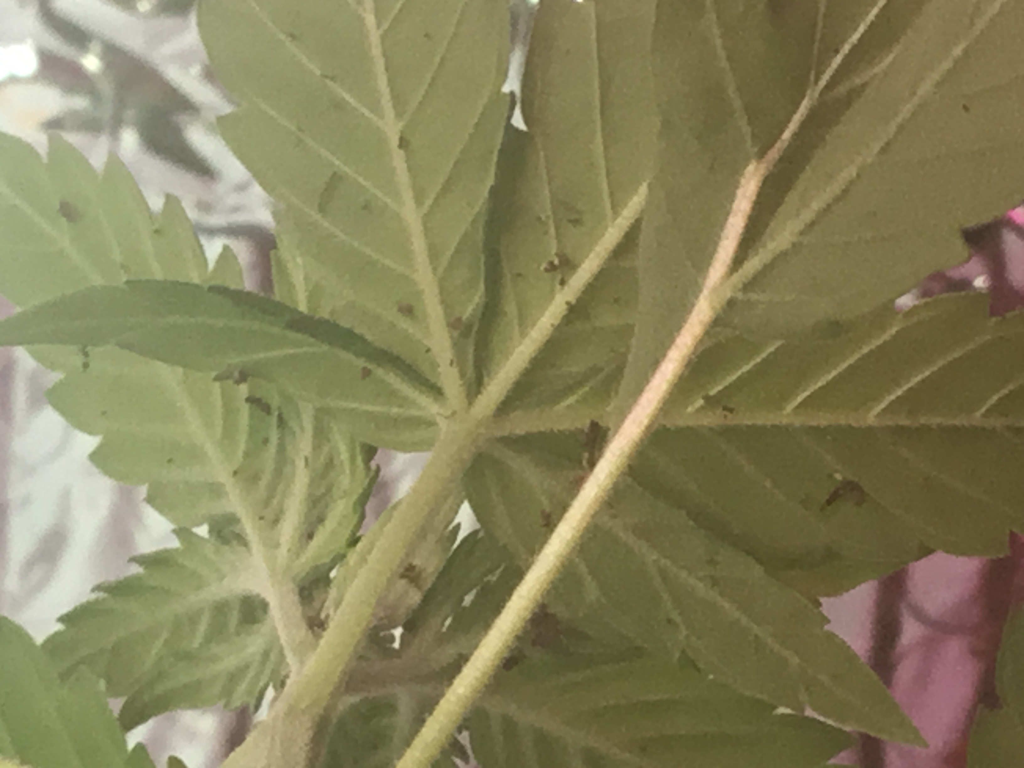 This is my first indoor grow after my first outdoor grow last summer I only bought 1 clone and a pack of seeds to try my hand at indoor I have limited space so decided on 4 plants 1 mango kush clone 2 banana mango from good seed and a chocolate from bag seed right away one banana mango started to shine while the mango kush thrived sadly the other banana mango and chocolope we’re struggling significantly to the point they needed support to stand but were still getting new growth though slowly today I decided to kill them if they didn’t stand after removing support 1 did the banana mango runt but the chocolope fell so before killing I decided to check the roots as I turned it over I noticed right away small black objects on the bottom of the leaves after light scraping 1 fell off it’s very hard I immediately checked my other 3 plants and saw 2 very very small black spots on the other struggling plant my questions are what is going on and should I be worried about my 2 healthy plants below is a picture of the black dots