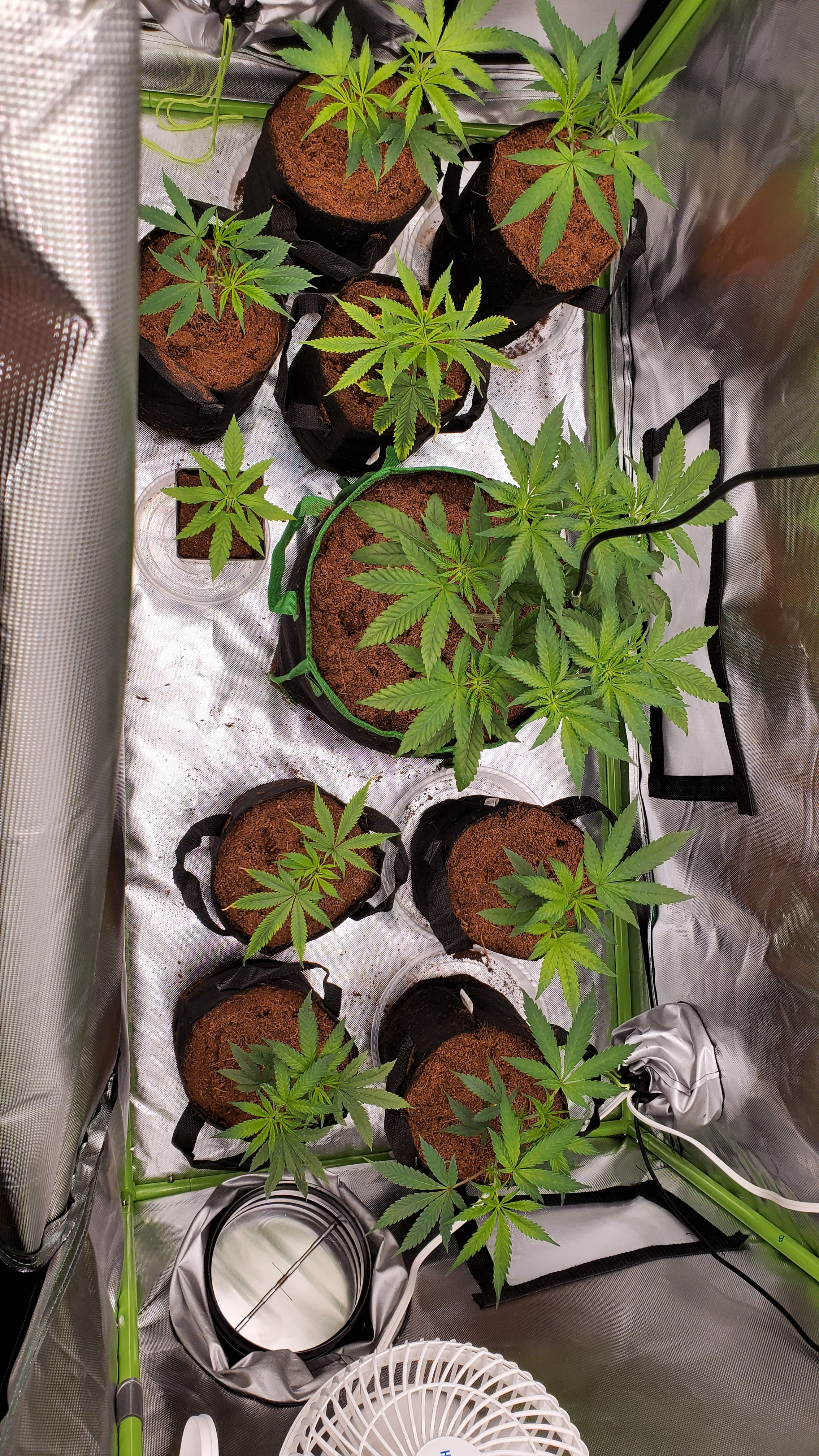 Currently running Cherry Vanilla Skunk by Dynasty Genetics (3gallon) and some Clones taken from my Durban Poison S1 by CSI humboldt. The small seedling is a bag seed experiment unknown Genetics. All under a Custom light i put together with 4 HLG QBs paired with 8 Samsung photoboosting strips by Pacific Lighting Company. 100% coco fed Jacks 321, Power Si, Tribus, Real Growers ReCharge, and Blackstrap Molasses in RO water. Temp and humidity controlled by AC Infinity T6 automatic inline duct fan