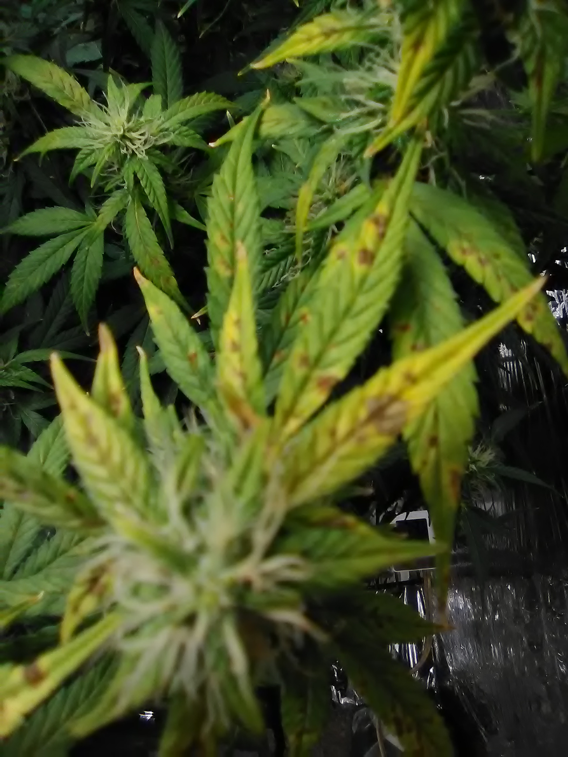 Its a white widow auto around week 4 of flower getting brown spots it seems to be only on the top leaves I am thinking its a calcium problem or a ph problem could be both been watering with ph at 6.0 and no calmag for a month or so. Just watered with calmag and ph at 6.0- 2 days ago hoping that will help should I up my ph to 6.5 and give more calmag at next watering or is this something else altogether ..