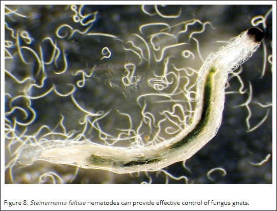 6. Top dress houseplants with Beneficial Nematodes to destroy the larvae stage. Nematodes are microscopic round worms that penetrate fungus gnat larvae, as well as harmful lawn and garden grubs, fleas, and other soil-borne pests (they do not harm earthworms), then release a bacterium that consumes the pest from the inside out. The long-lasting nematodes are safe for use around pets, plants, and your family.