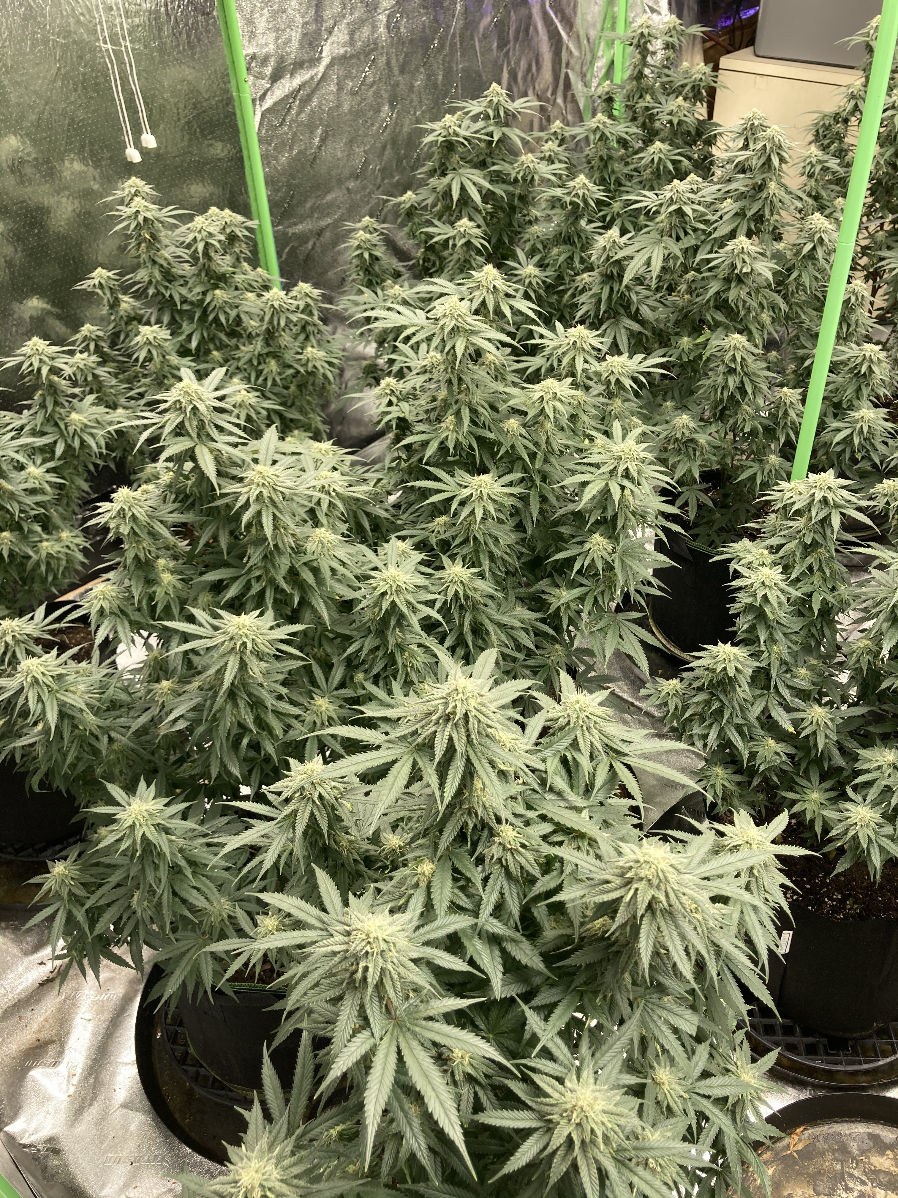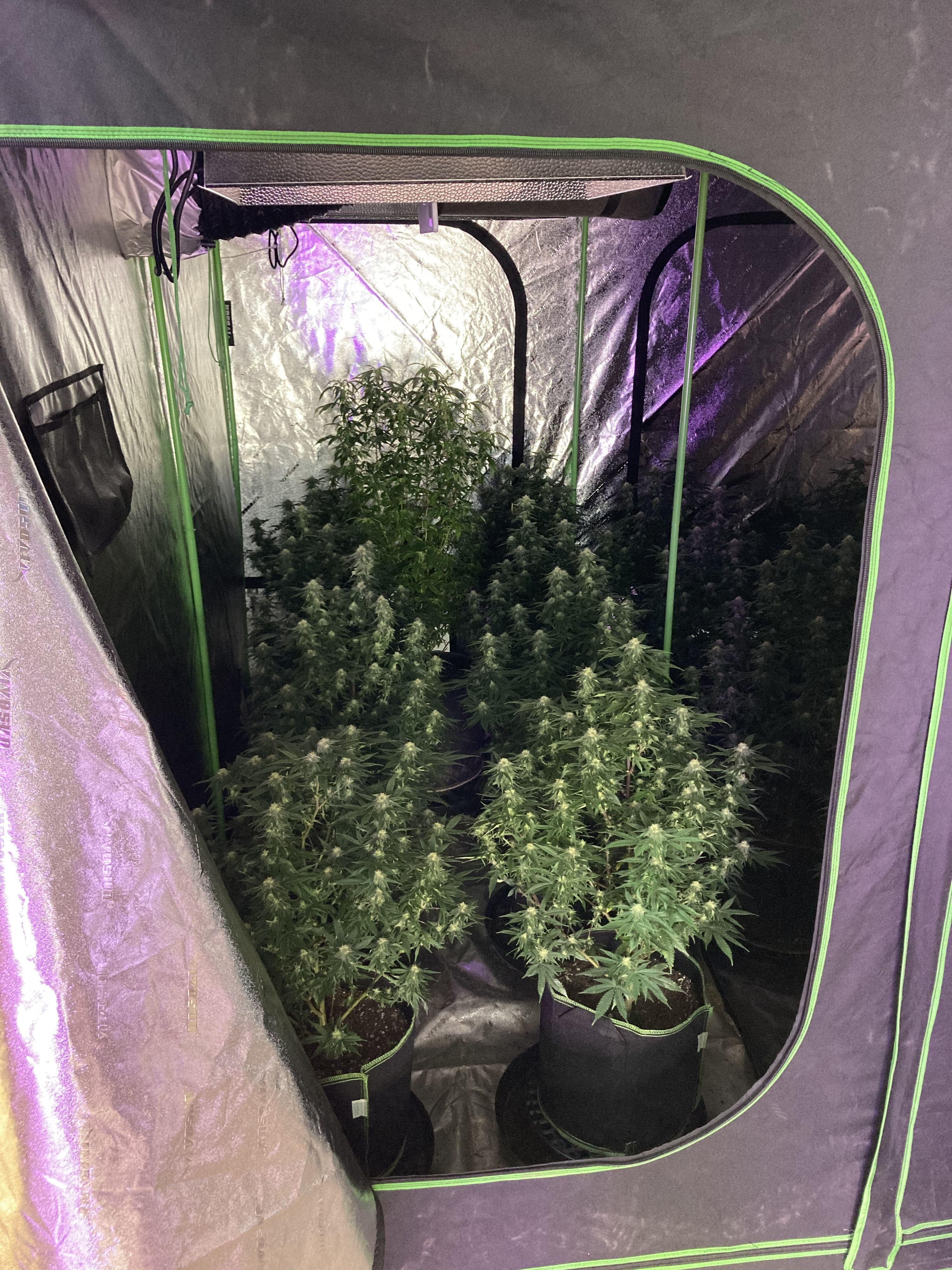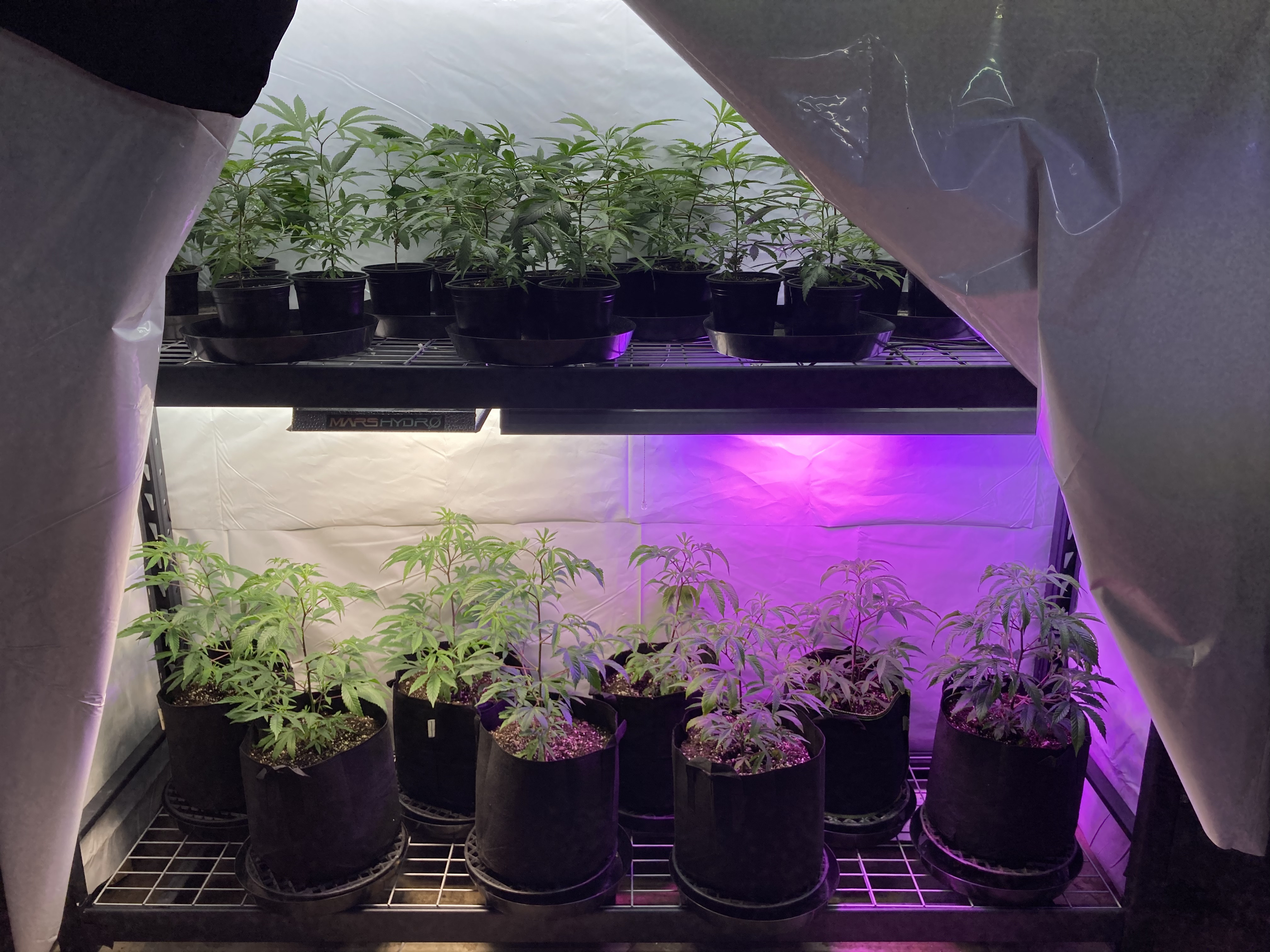 The dimming feature on the Mars Hydro lights is huge I can dim my lights and still treat for WPM. I use mammoth canna control and plant therapy to control WPM. It simulates a cloudy day by dimming the lights. And the plants still respond to the reduced light. The shelf is the 90 inch tall 90 inch wide hope depot garage shelving unit. And using panda black and white greenhouse plastic. It’s thick and tough and the white side is very reflective.
