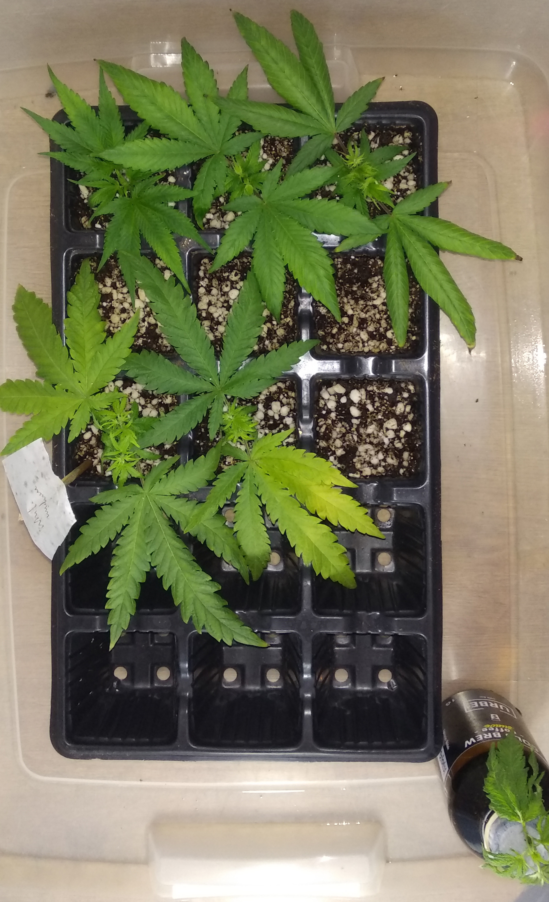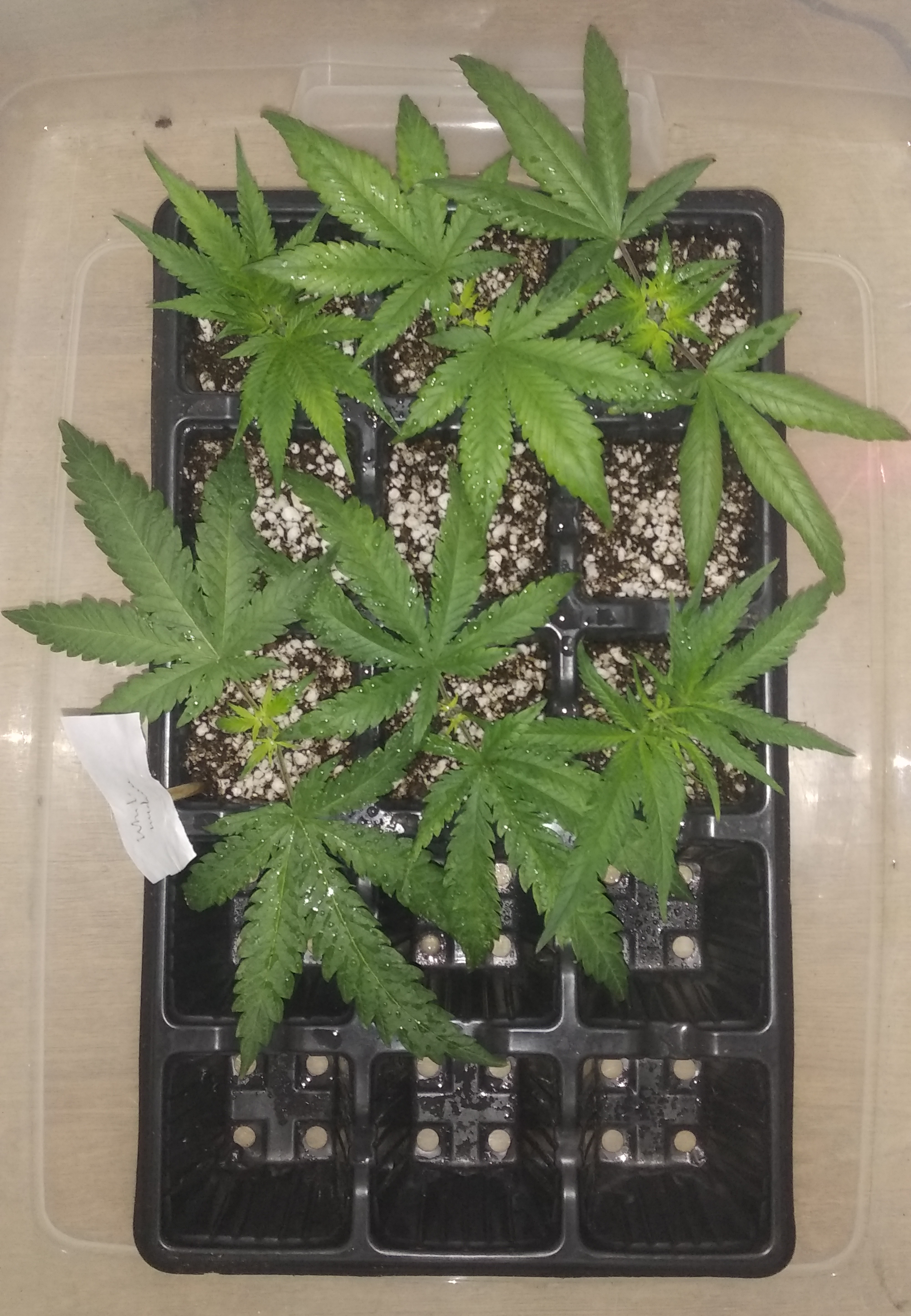 About two weeks ago I topped my photoperiod plants and attempted to make several clones from the cuttings, including 2 terminal cuttings and 4 subterminal cuttings. All of them were cut with a sharp scissor and quickly placed into a rooting solution (basically some micronutrients and an algae extract) for a few minutes, as per official instructions, and then placed into a water-saturated substrate composed of peat moss and perlite. These planted cuttings were then placed inside a large transparent plastic box with some holes in it and sprayed with water to increase humidity. A small LED lamp was placed on top of the box and plugged into an 18-6 hour timer.