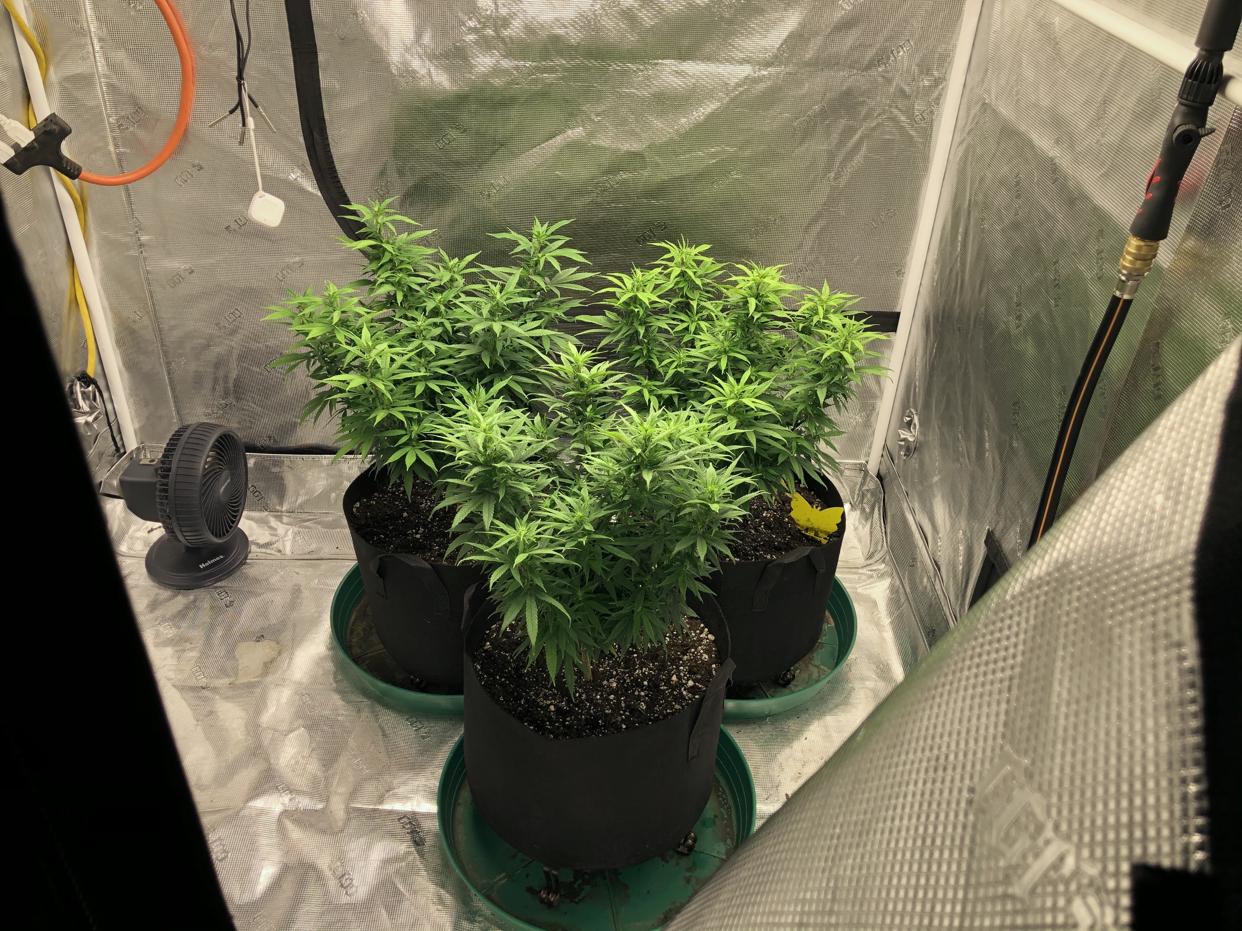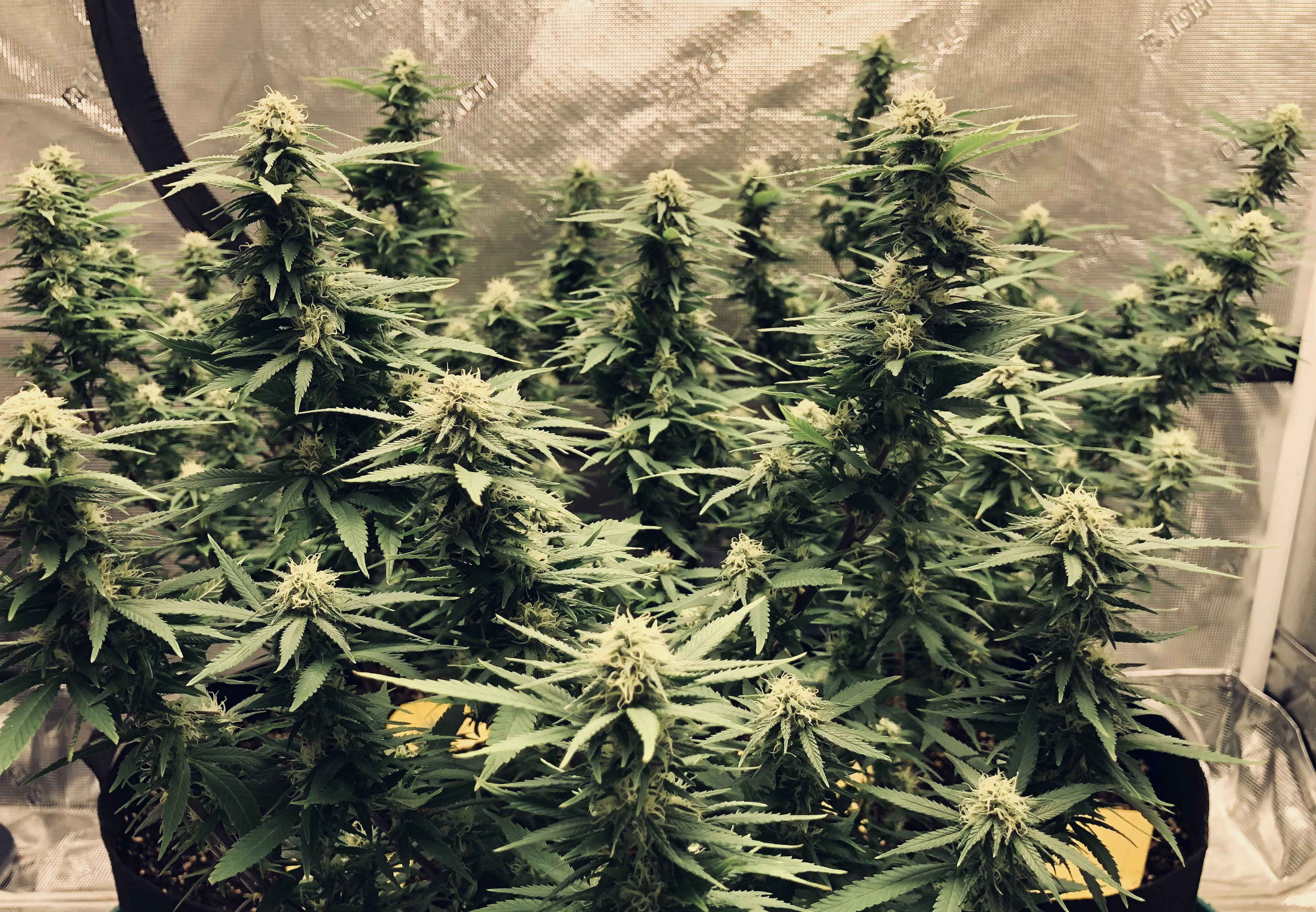 This was Sunday. It’s easier to see the change in real life. The yellowing is mostly up high, but oddly on the rear left plant, half of it remains darker green (the half to the right). The smallest of the 3 plants is at rear right and has the most yellowing. It seems I have 2 phenos and that yellower one is twin to the one I moved indoors to be a mother and that one has never changed in color (beautiful dark green) with all 4 getting the same soil treatment.