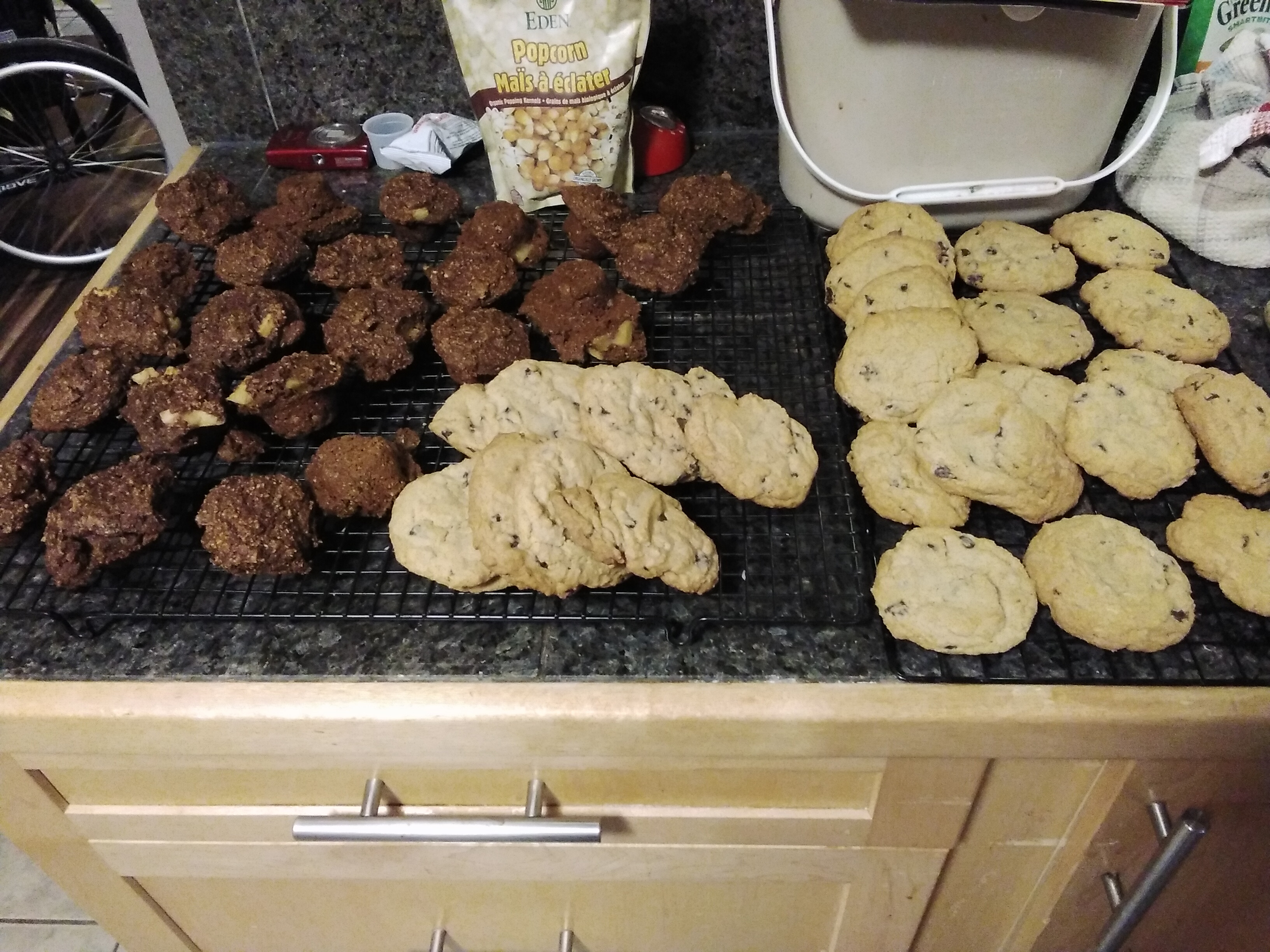 Double batch of chocolate chip cookies - chocolate is made from stevia - no sugar. Not that it really matters the batter has all the sugsrs in it it needs - so - being diabetic there are times when my blood sugar goes too low and I need help to bring it up - so off to the freezer for the lot.