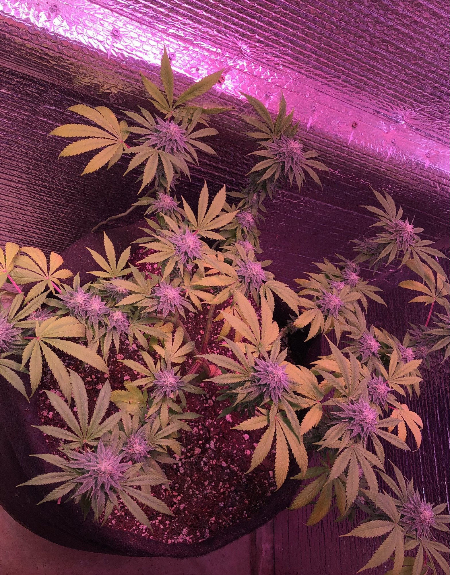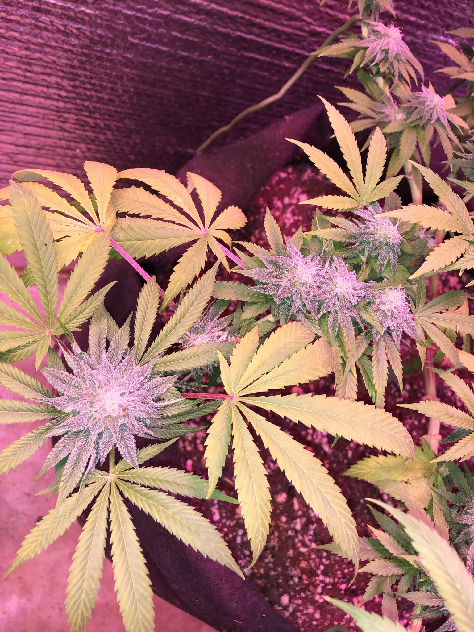 This plant is White Widow, but the last one was Fruit Spirit and the one before was Durban Poison and they all did the same thing (so far with the WW). I'm growing in Big Rootz under a single Viparspectra 1000 in the veg tent at 18/6. They get the FoxFarm trio all the way through flowering. The flowering chamber is 2 x 4 x 9' high and it has 2 Vipar 600s in it. I keep my pH always varying between 6.2 and about 6.9 and the temp stays between about 68 - 72 these days, abou 45% RH. Any help would be much appreciated!