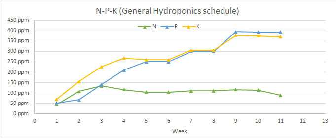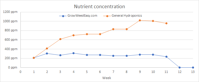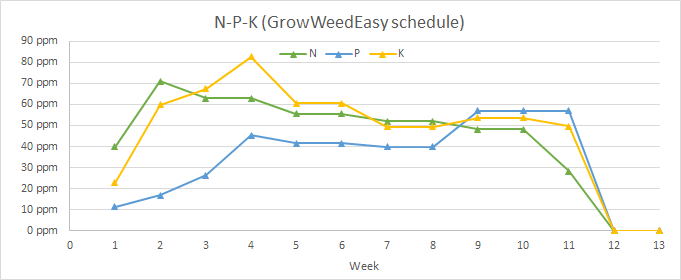 The GrowWeedEasy website has a guide to using the General Hydroponics Flora Trio + CaliMagic that consistently uses less nutrients than most other schedules and guides. I made some calculations based on both their table for a soilless grow and the official recommended General Hydroponics' table, and found that whereas the GH schedule is consistent with what most growers recommend — that is, to increase the amount of nutrients as the plant develops, reaching as far as 1000 ppm as it approaches late blooming —, the GWE schedule keeps it roughly constant throughout most of the process at around a mere 300 ppm. Attached below are the charts for the total nutrient concentration (N, P, K, Mg, Ca, S, Zn, Mn, Fe, B, Cu, Mo) for both schedules, as well as their NPK concentration.