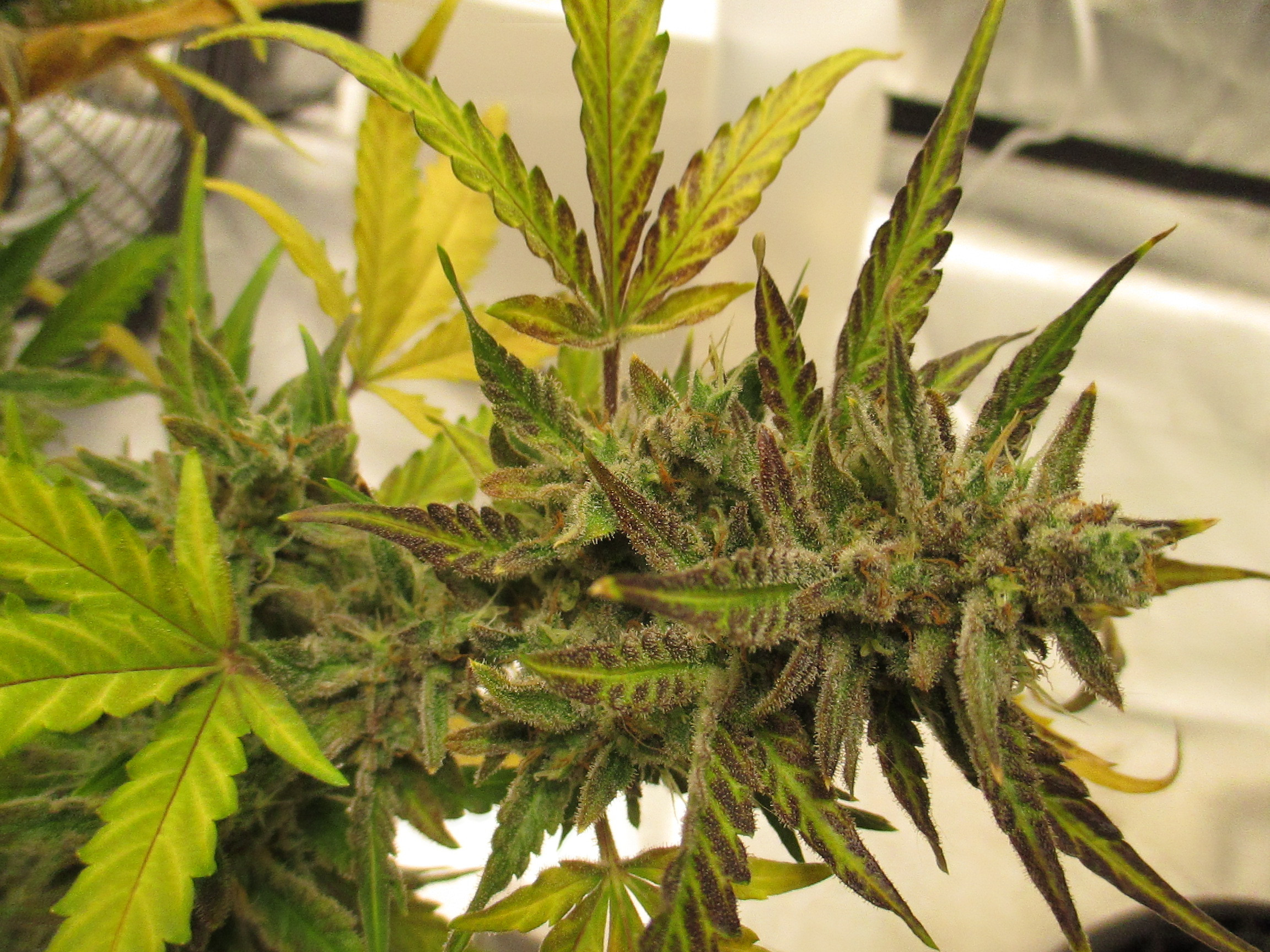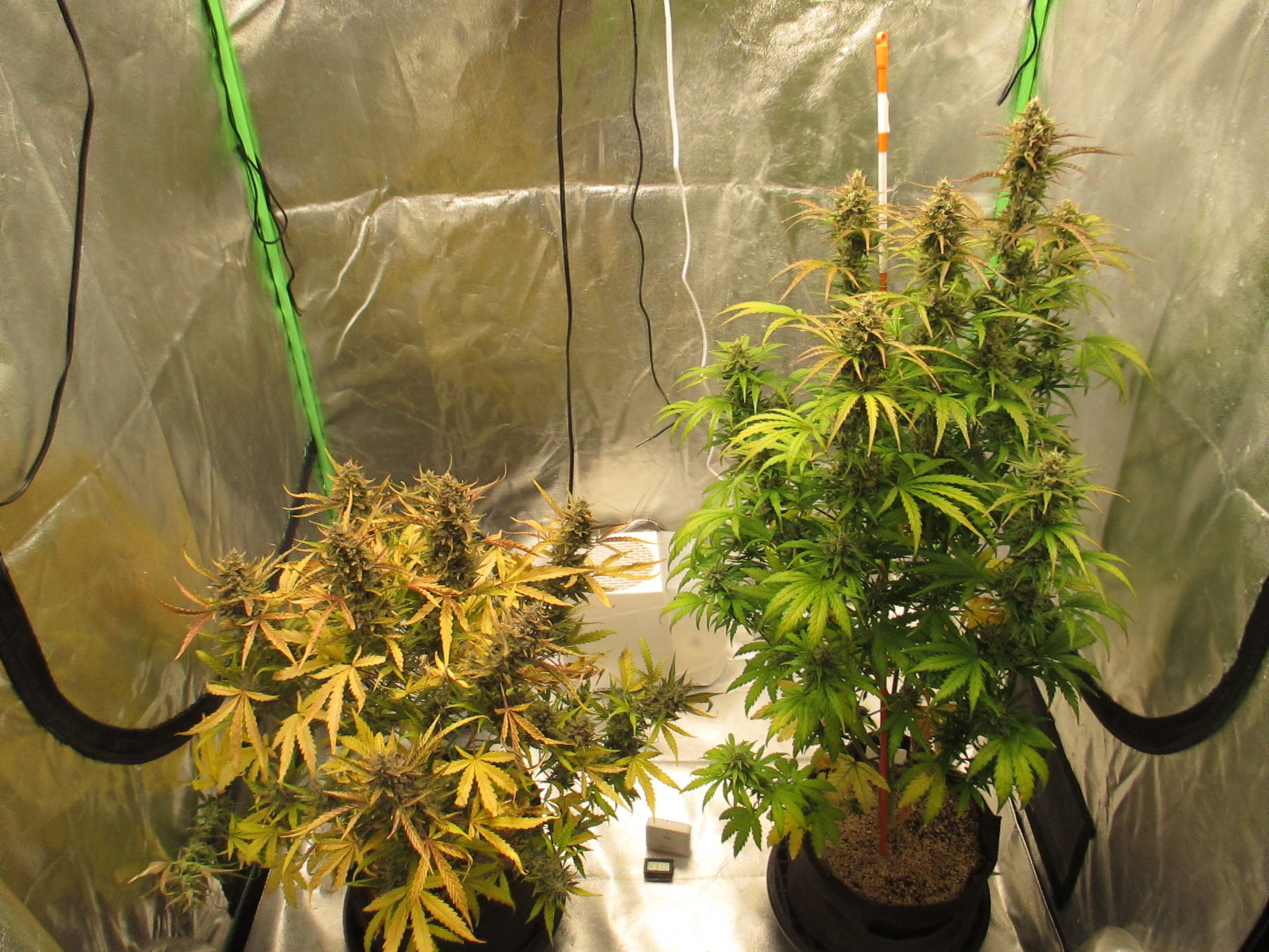 Been More Busy This Grow So i Have not Been Able to Maintain perfection had a few temp Swings but they showed no sign of stress the small one started yellowing awhile ago i gave it more calimagic it slowed down for awhile but it finally went full yellow also am concerned about the purplish color i did put in a new light but i am unsure if that would cause that reaction only reason i consider it is cause the one plant is going purple on top but does not explain the smaller one both are auto flowers. They Are Really Close to being done i flushed a day ago