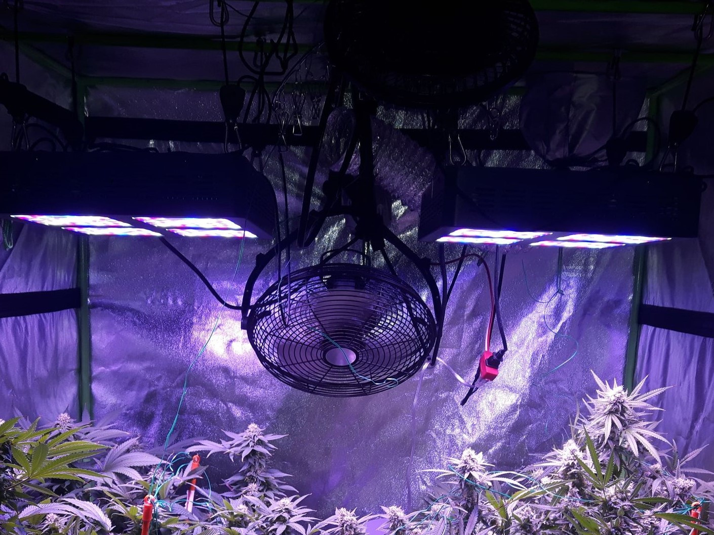 4x4 tent, Platinum LED P4-XML2, four Patio Pickers. Vegging Super Lemon Haze, Durban Poison and two Tangie x Blueberry crosses.
