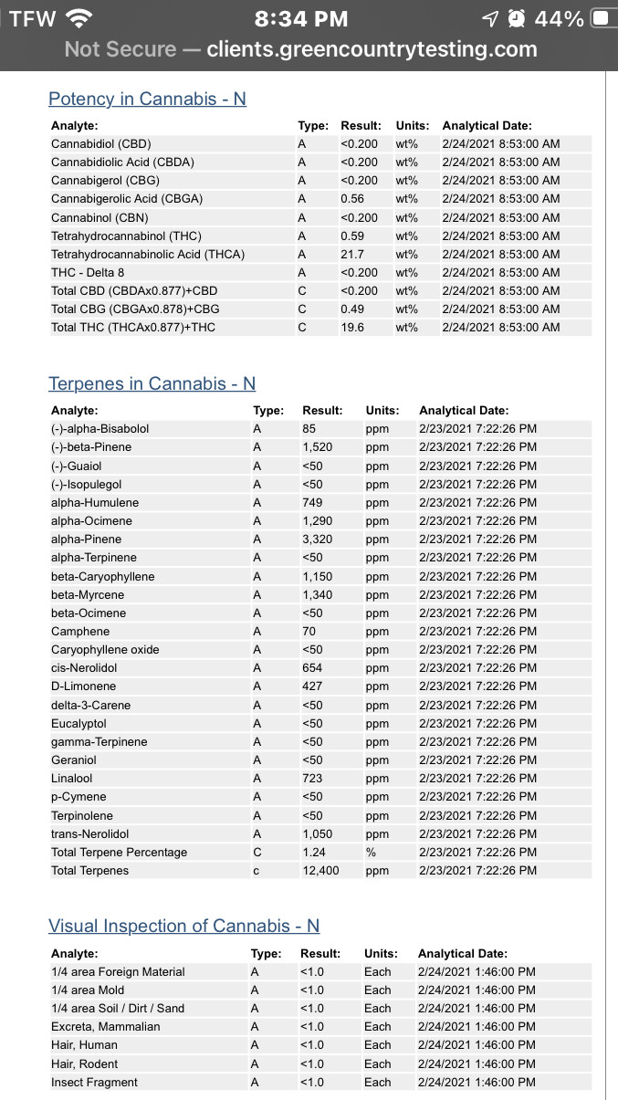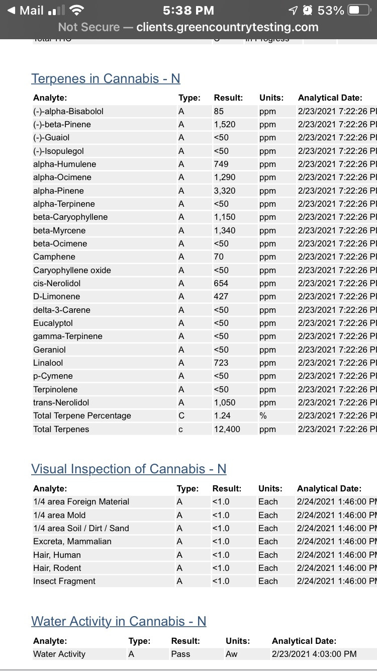 This is interesting. I thought about doing this but I haven't really looked into it in detail. Do they give you a %THC as well and list the cannabinoids? It definitely shows your terpenes. No rat hairs or bug parts either so at least your running a clean shop