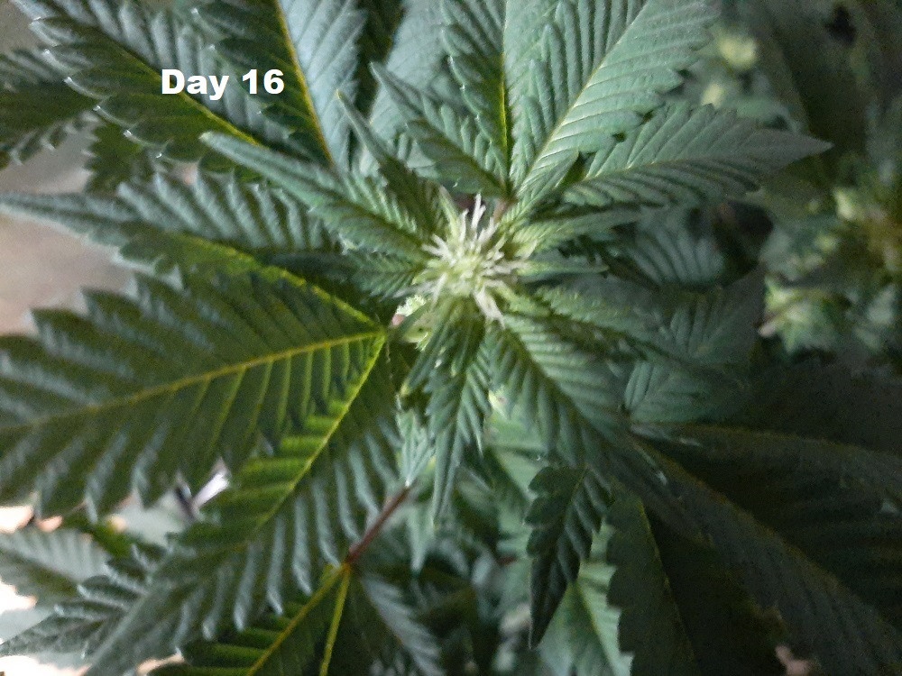 This is day 16 of bloom, the plants were 13 inches when I flipped them and are now 23 inches. They have also started to produce buds. I really didn't expect them to grow this tall, this fast. If they continue at this pace I will have to some how raise my light. Tallest plant is only 16 inches from the light now... Still having fun with them though...