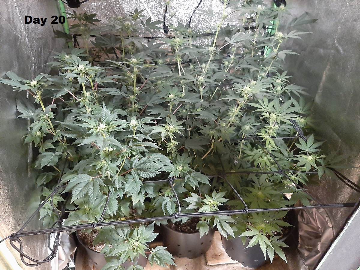 This is day 20 of bloom. It doesn't look like the plants have slowed down their stretch yet, hopefully they will soon. Buds are starting to develop nicely and the leaves are still a dark shade of green. All girls for sure... Really getting crowded in the tent...
