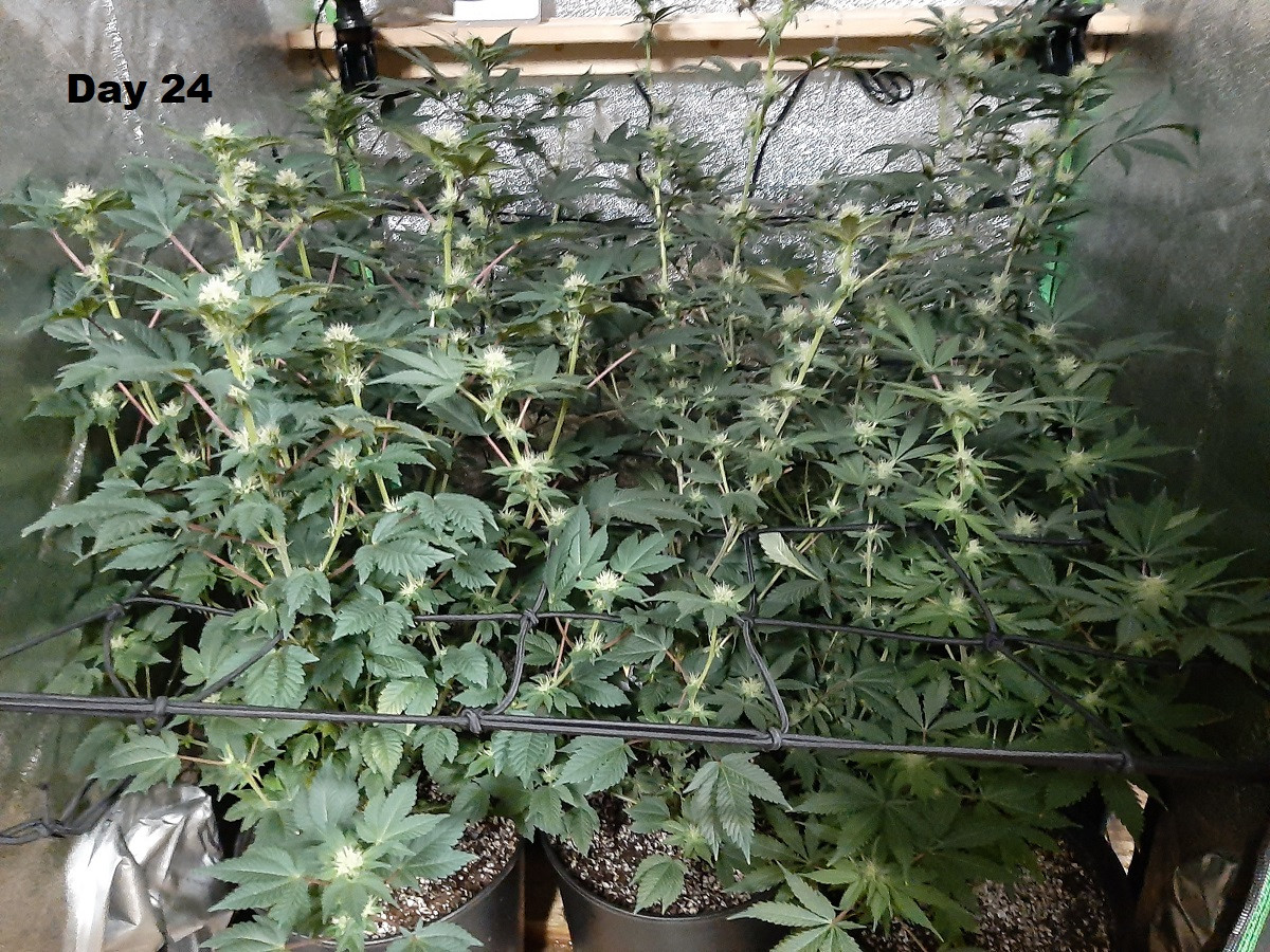 Day 24 of bloom. The tent is filling up fast but I do have a lot of bud sites starting to show nicely. Approximately how much longer do I have to go before I can expect them to be ready for harvest??? I think that it might be time to do a lot of defoliating???