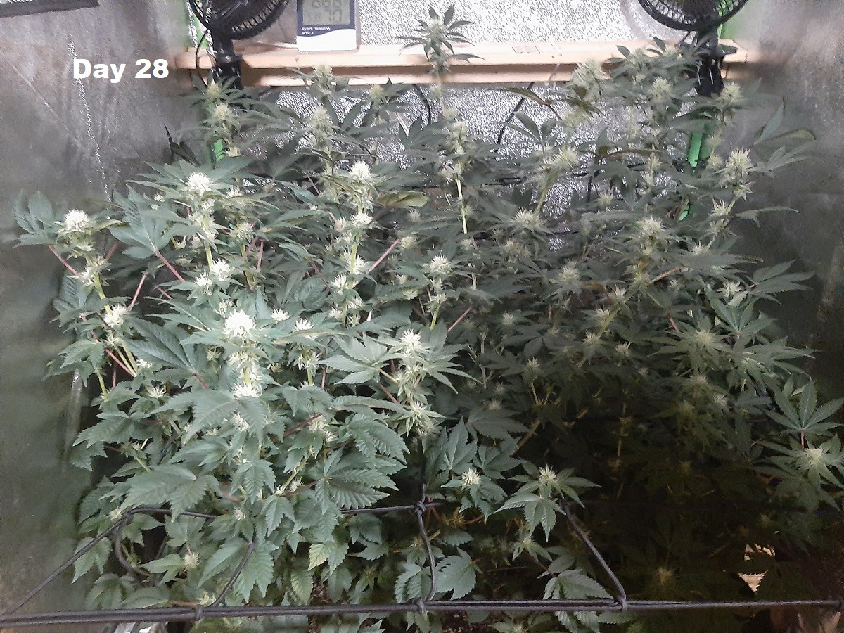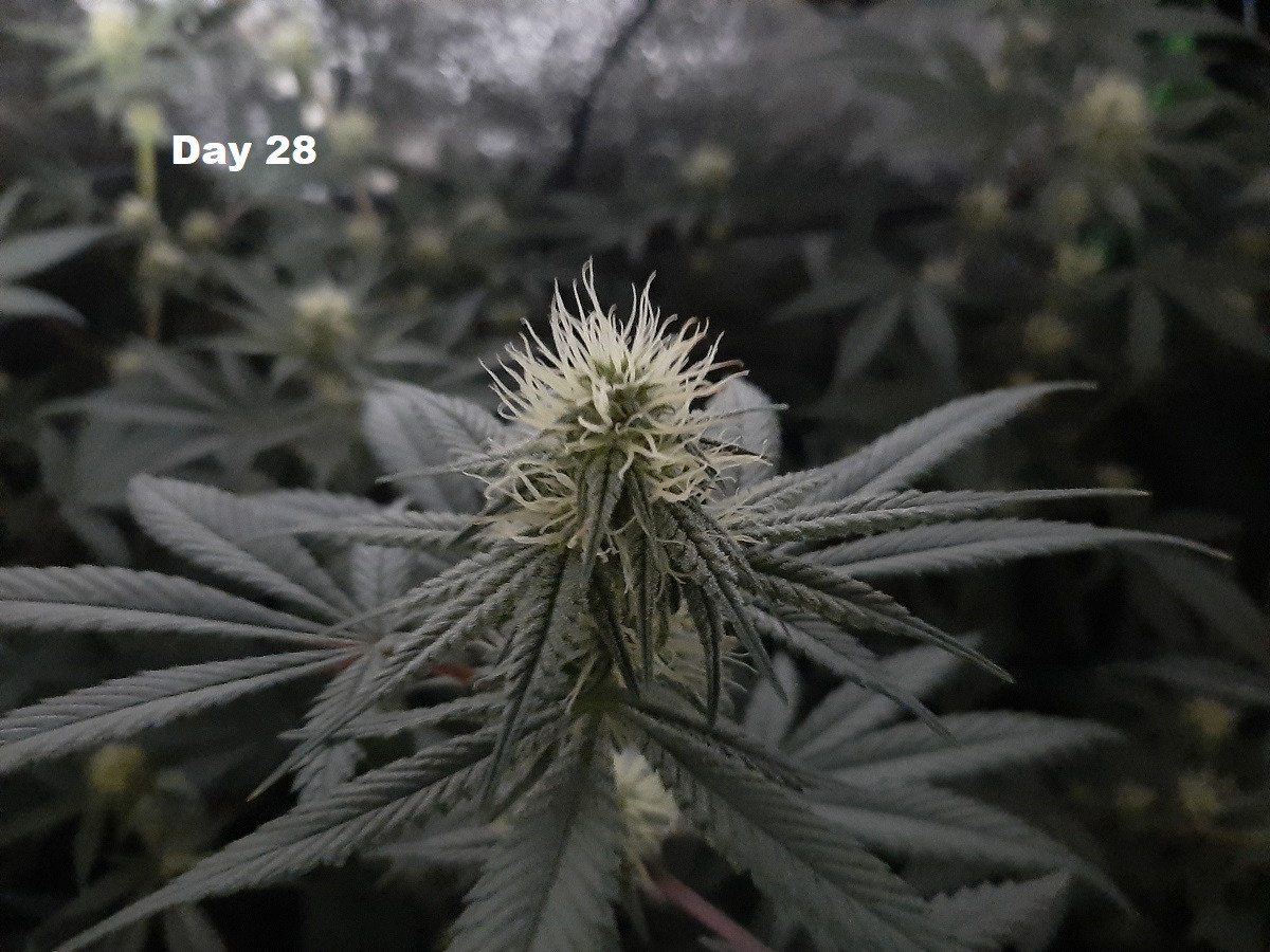Day 28 of bloom. It looks like the stretch is slowing down, the plants seem to be putting more energy into producing buds. You can actually see some resin forming on the lower part of the buds...