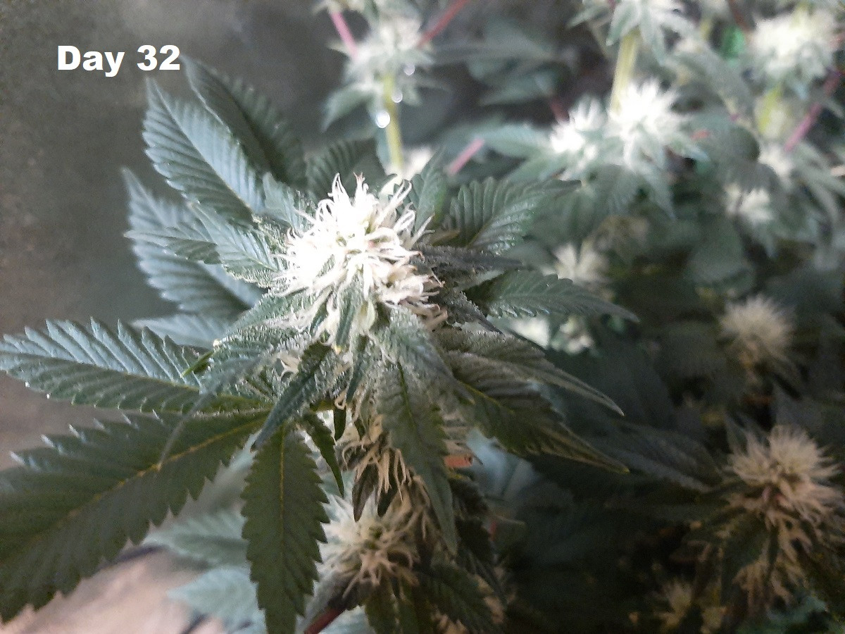 Day 32 of bloom, it looks like the stretch is over and the buds are starting to fatten up nicely. I don't know what kind of harvest that I am going to get but for a first time grower it looks good to me... The plants are really sucking up a lot of water, 2 litres twice a week per plant, humidity at 50% and temp at 78 F. Should I be about half way to harvest???