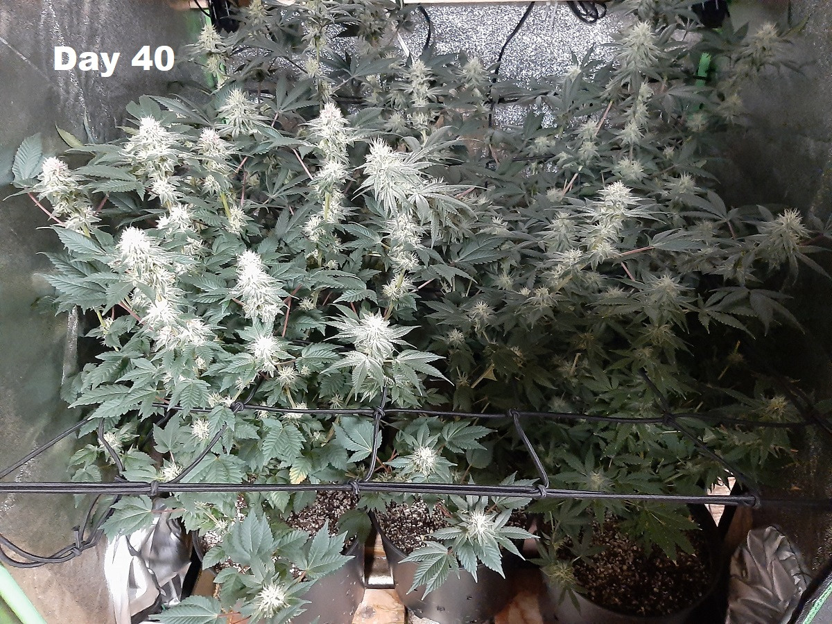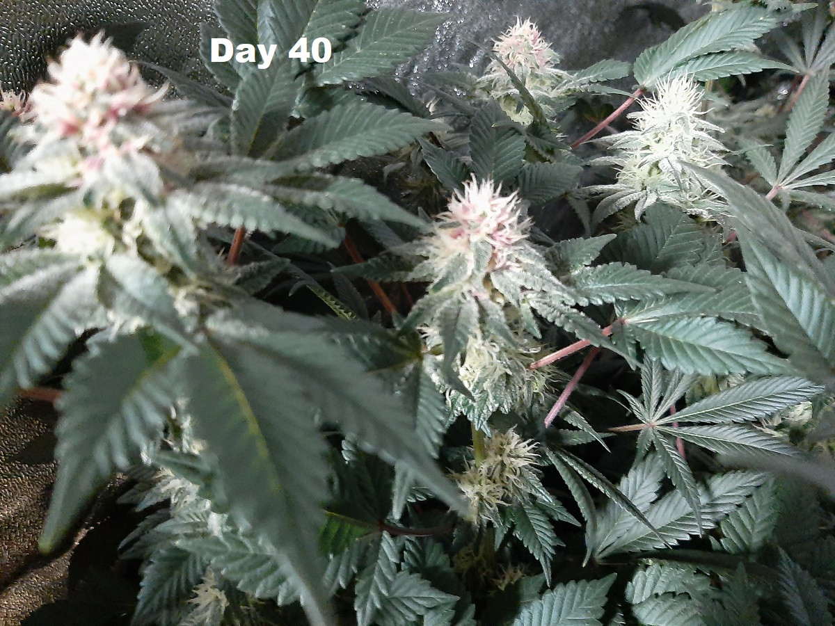 Day 40 of bloom, buds are continuing to fatten up and are starting to get very sticky. Some of the buds are starting to get a red tint to them... Have to check my watering every couple of days, taking a lot of water. Approximately 20 days to harvest