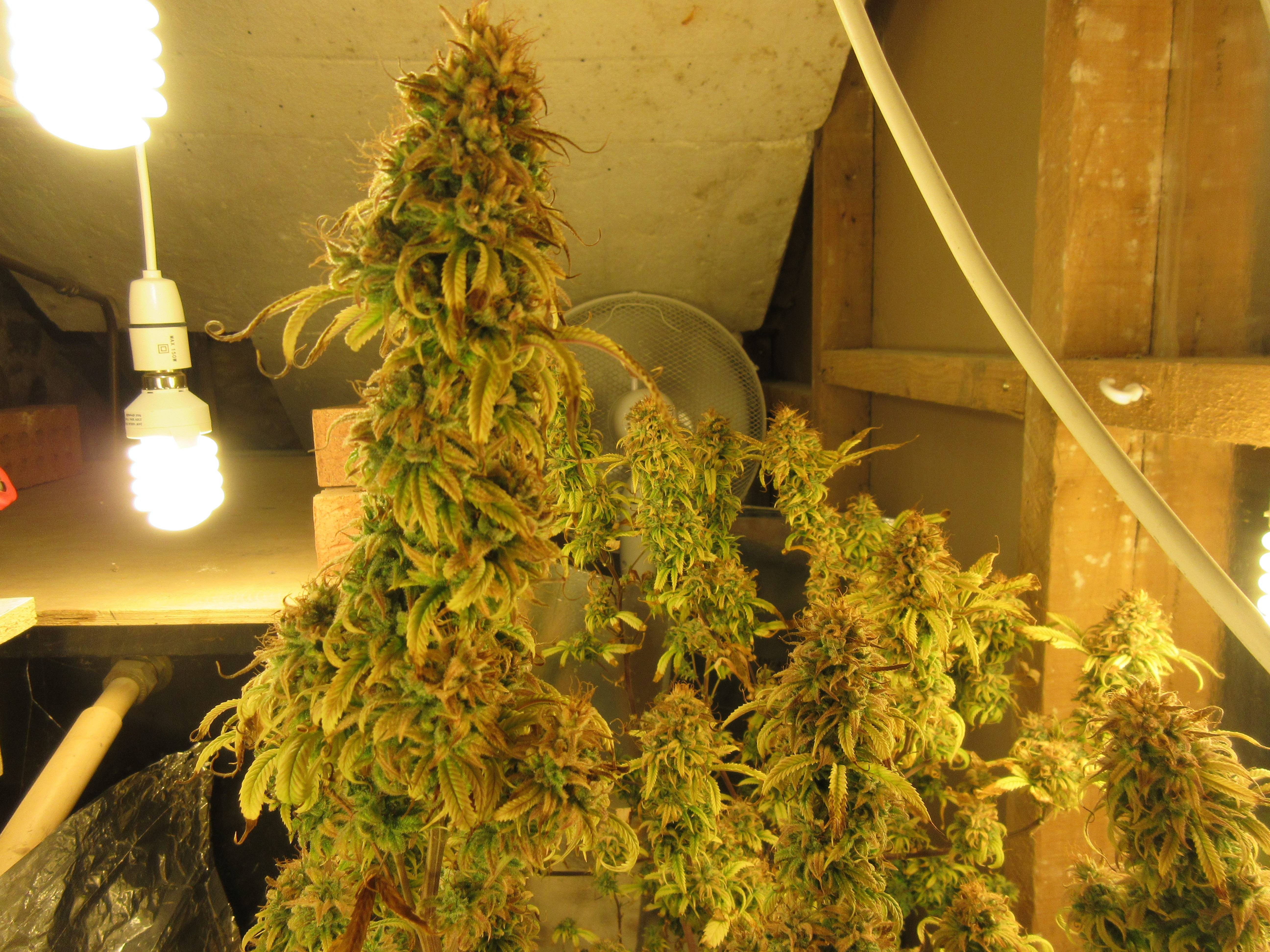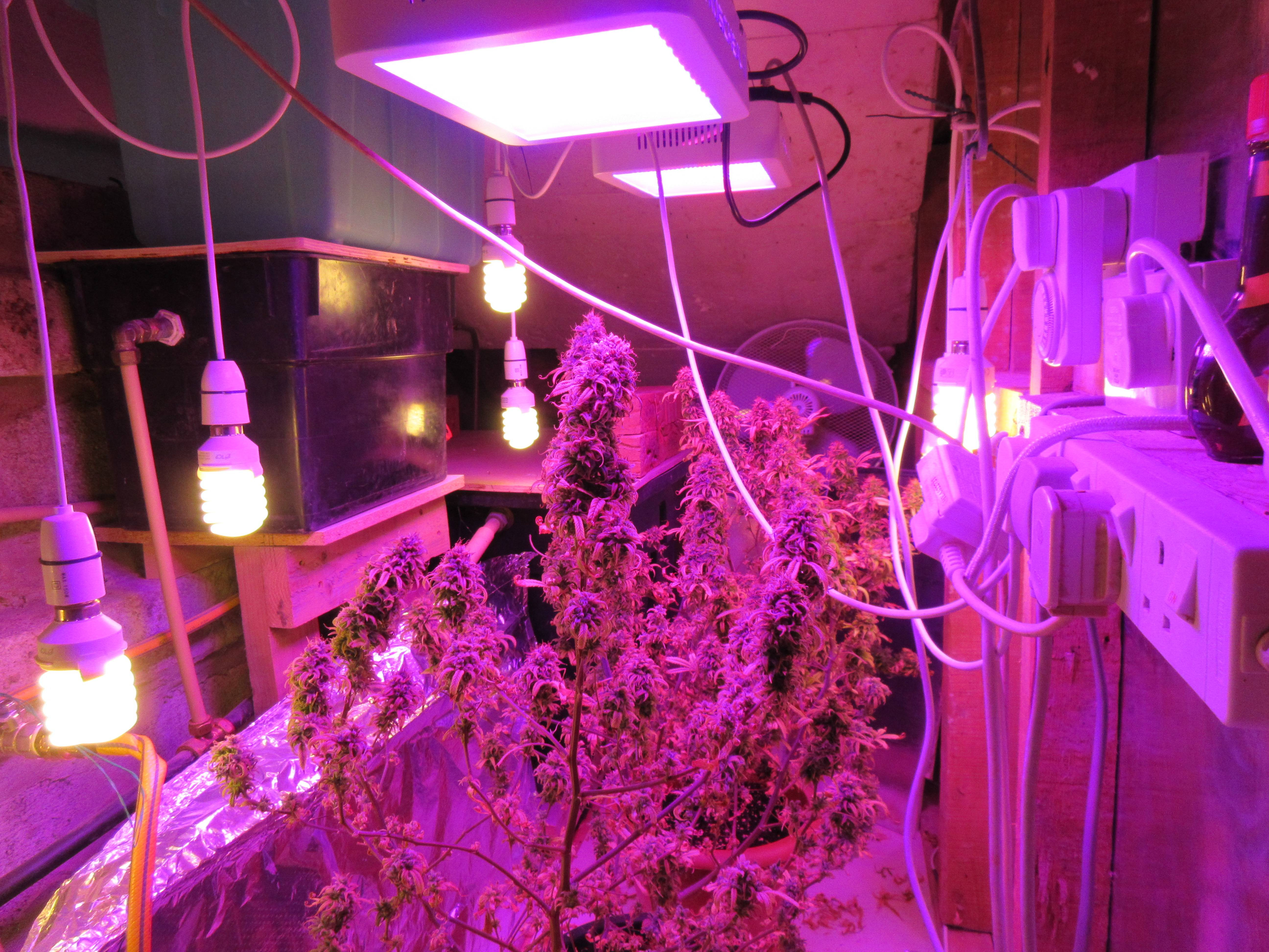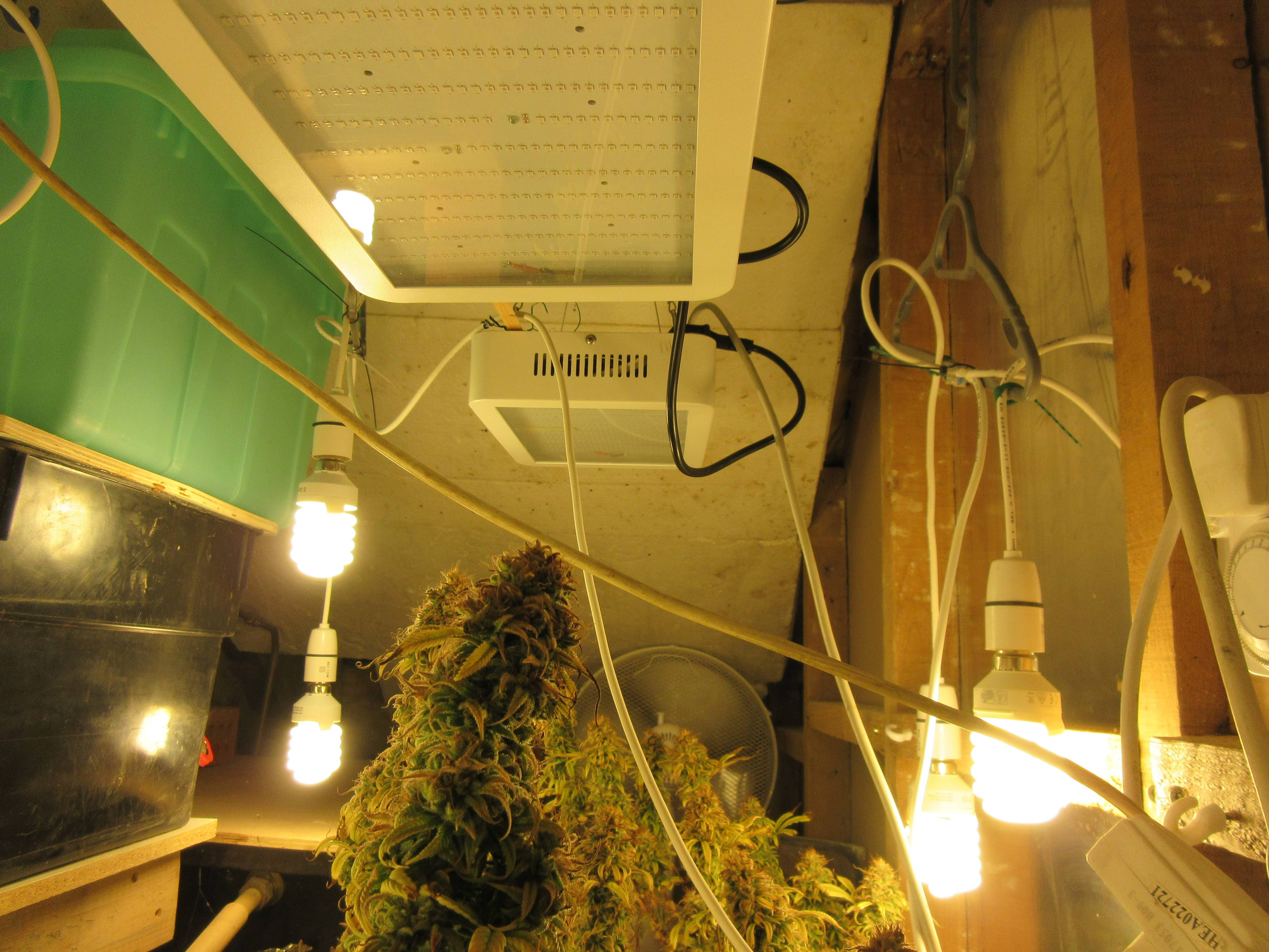 @DaGreenBlazer: I grew the mother plant under one LED advertised as 600/1200W, but who knows its true output, and 4 CFLs. The veg. stage was with LED switched to Veg and the flowering stage with LEDs switched to both Veg. and Bloom. For the 3 clones I bought a second LED and added 4 more CFLs. I used daylight CFLs for veg. and warm white for bloom. The mother plant was my first grow and fared much better, being greener for longer and gave me about 30% amber before harvesting at 11 weeks. The clones grew vigorously at first but then slowed down and leaves started turning yellow. Unfortunately I don't know if they were over or under fed with nutrients. I erred on the side of caution and fed very lightly or so I thought.