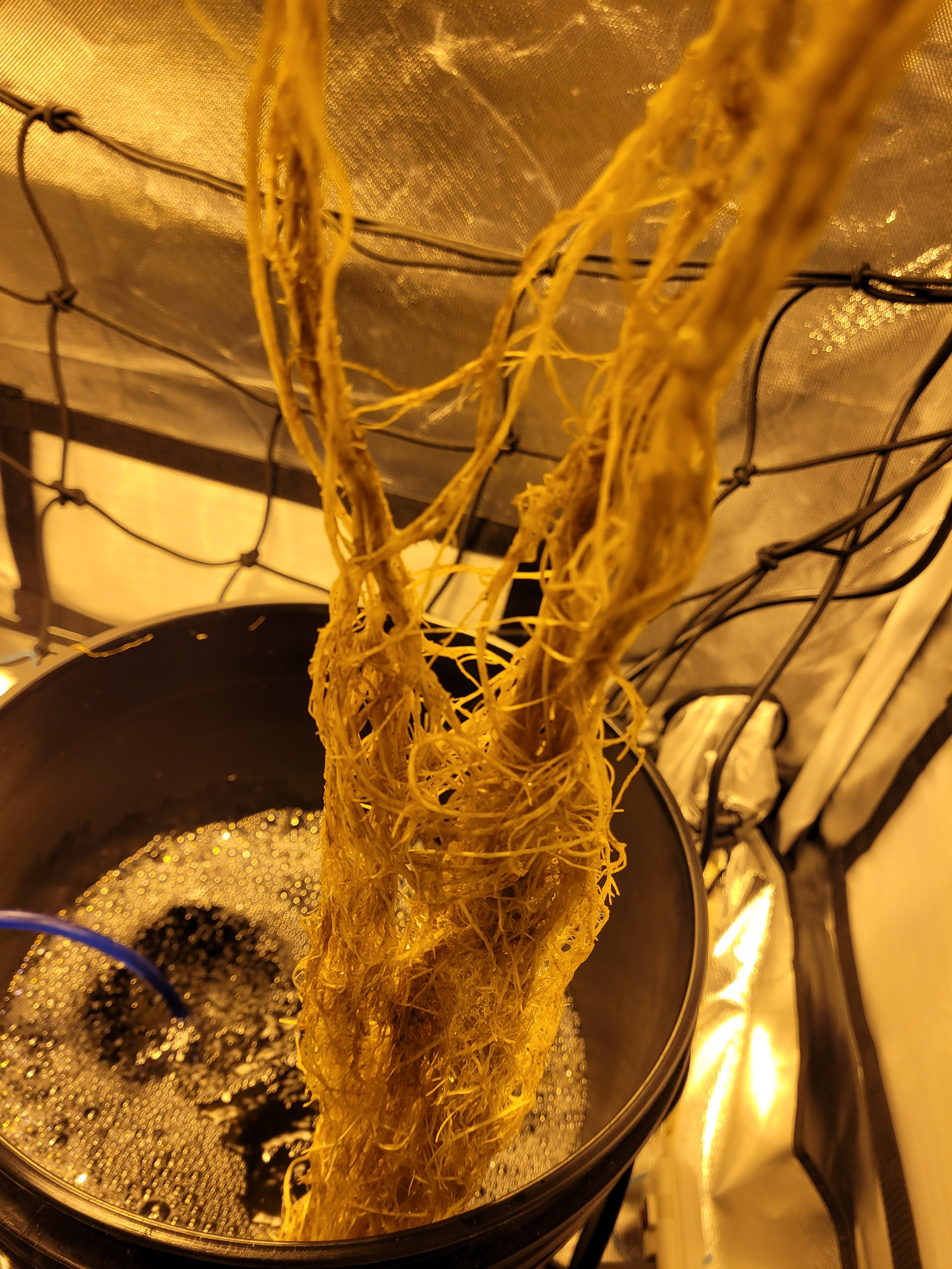 They do look a little slimy, but not sure its rot. I look for little side roots coming out from a main root, if they are brown but stick out, I blame it on the color of the nutrients. If the roots are slicked down and brown, and no little side roots sticking out then I assume its in a bad way and increase Hydroguard, clears it up pretty quick. The lights for my auto topoff system in the tote concerned me, but the blueish green color does not seem to affect the roots.