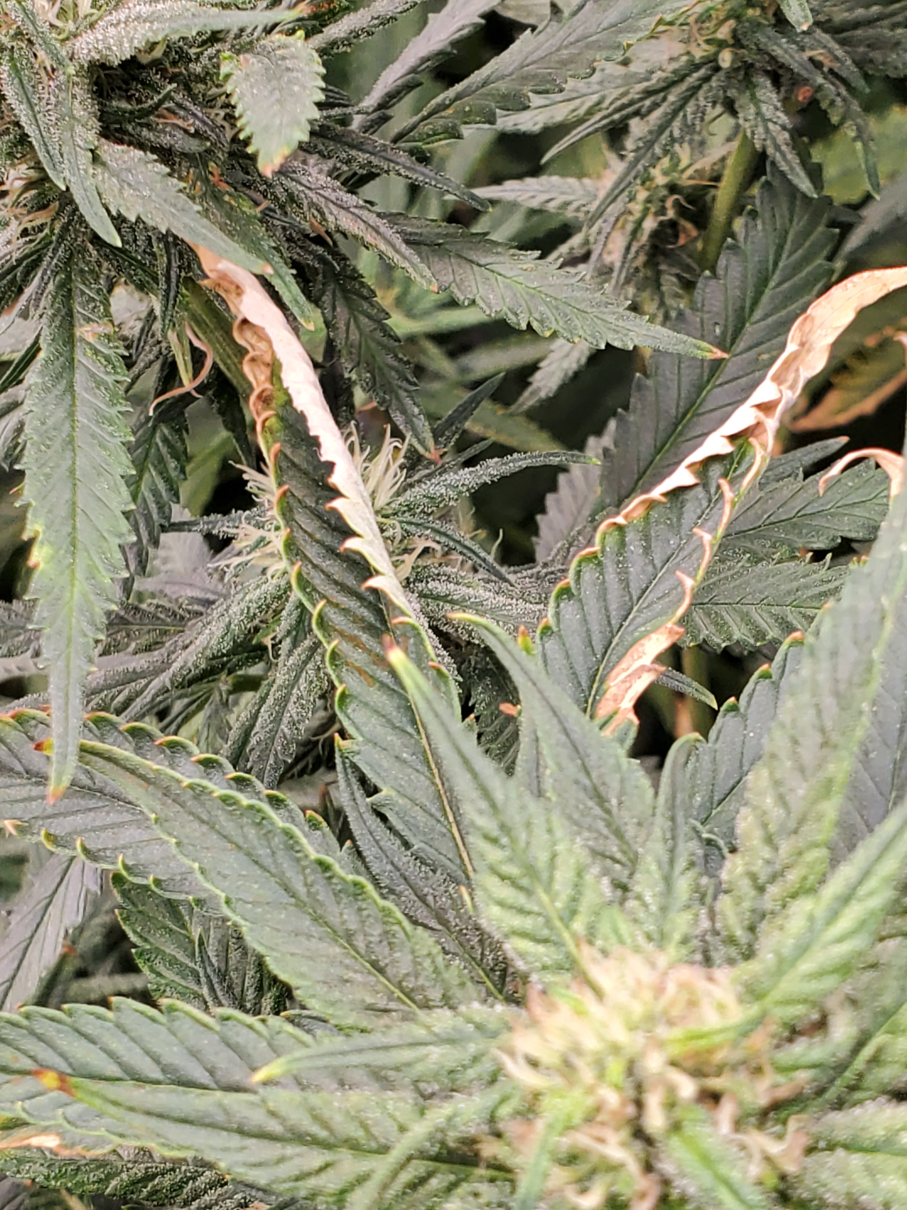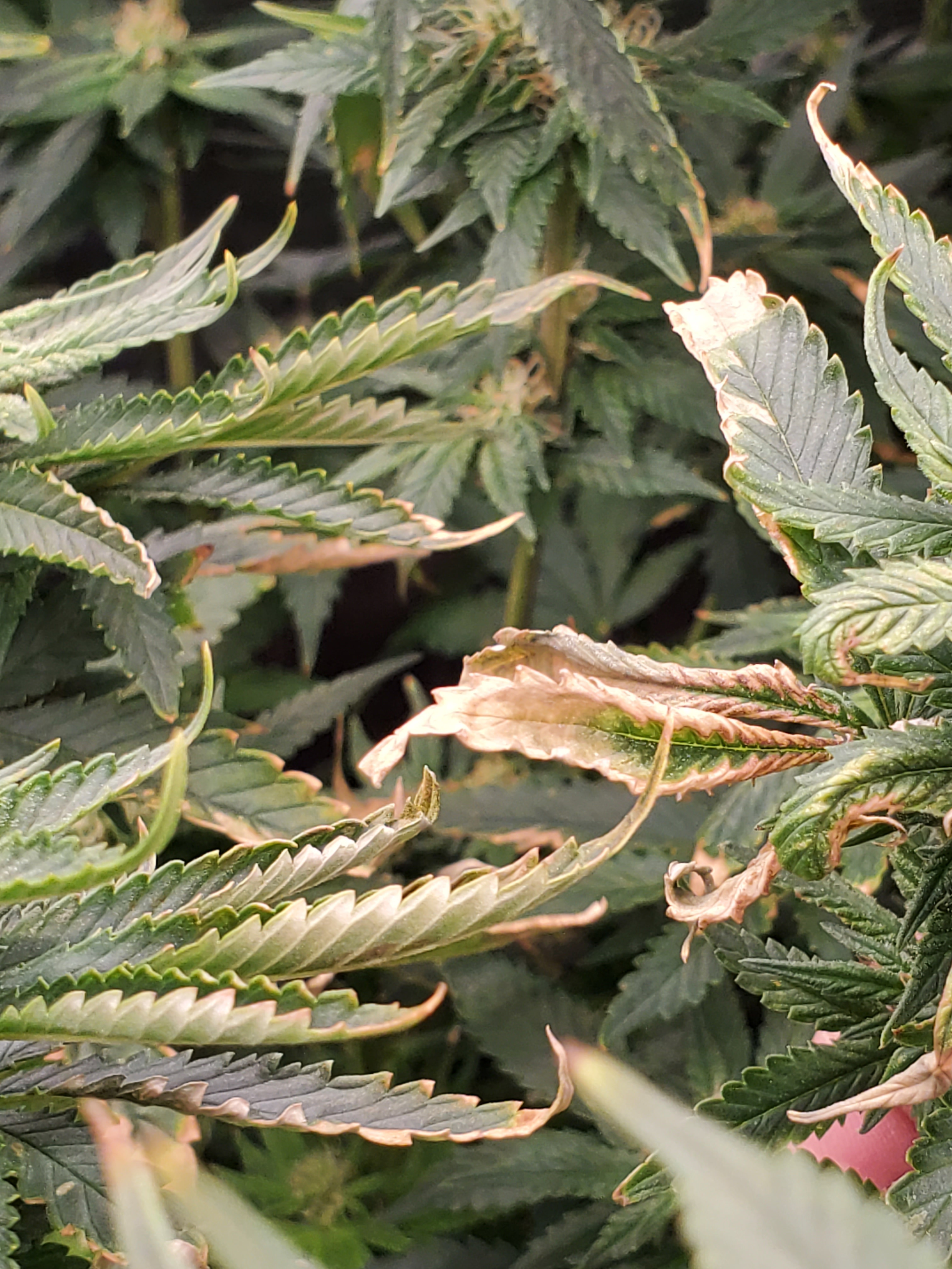 The browning leaves got worse and not just tips. Also canned leaves again. I still see no pests, my ppf is 900-970 across canopy,, so I'm assuming temp or maybe windsurf aswell. I lowered the temp of flower tents to a max of 80°f and adjusted fans to just the slightest leaf rustle.. If it still continues maybe try to continue feeding just water..