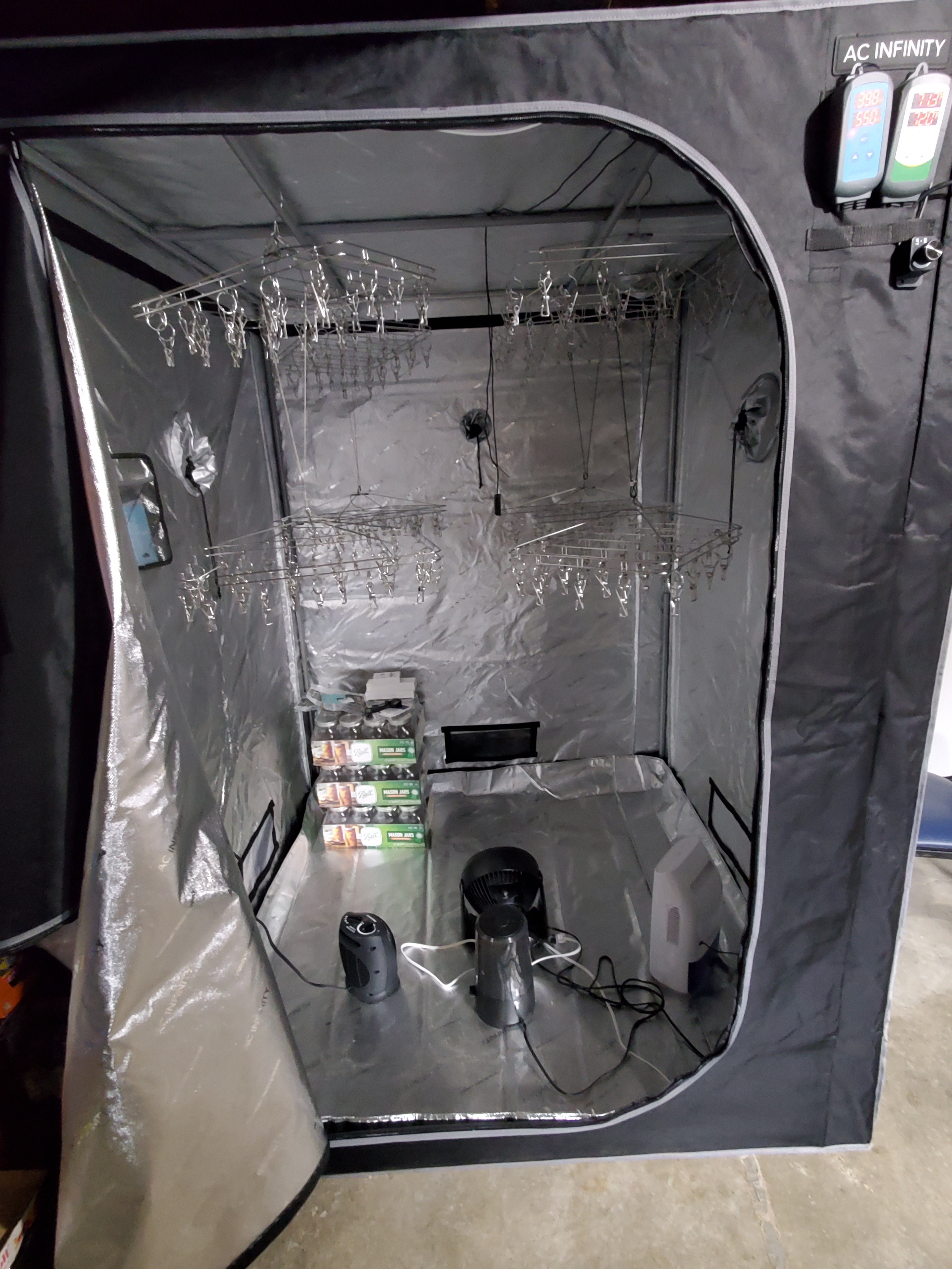 Also set up my drying chamber. The stack in the corner is quart size wide mouth mason jars, boveda 62% rh packs, labels and 3 dozen mini humidistats. The setup in the middle obviously is a fan, heater, humidifier and dehumidifier. I have the exhaust fan if it gets too hot. The tent is a 5x5 2000D canvas tent and the hanging racks each have 28 clips for a total of 224 clips. Hopefully this is big enough.