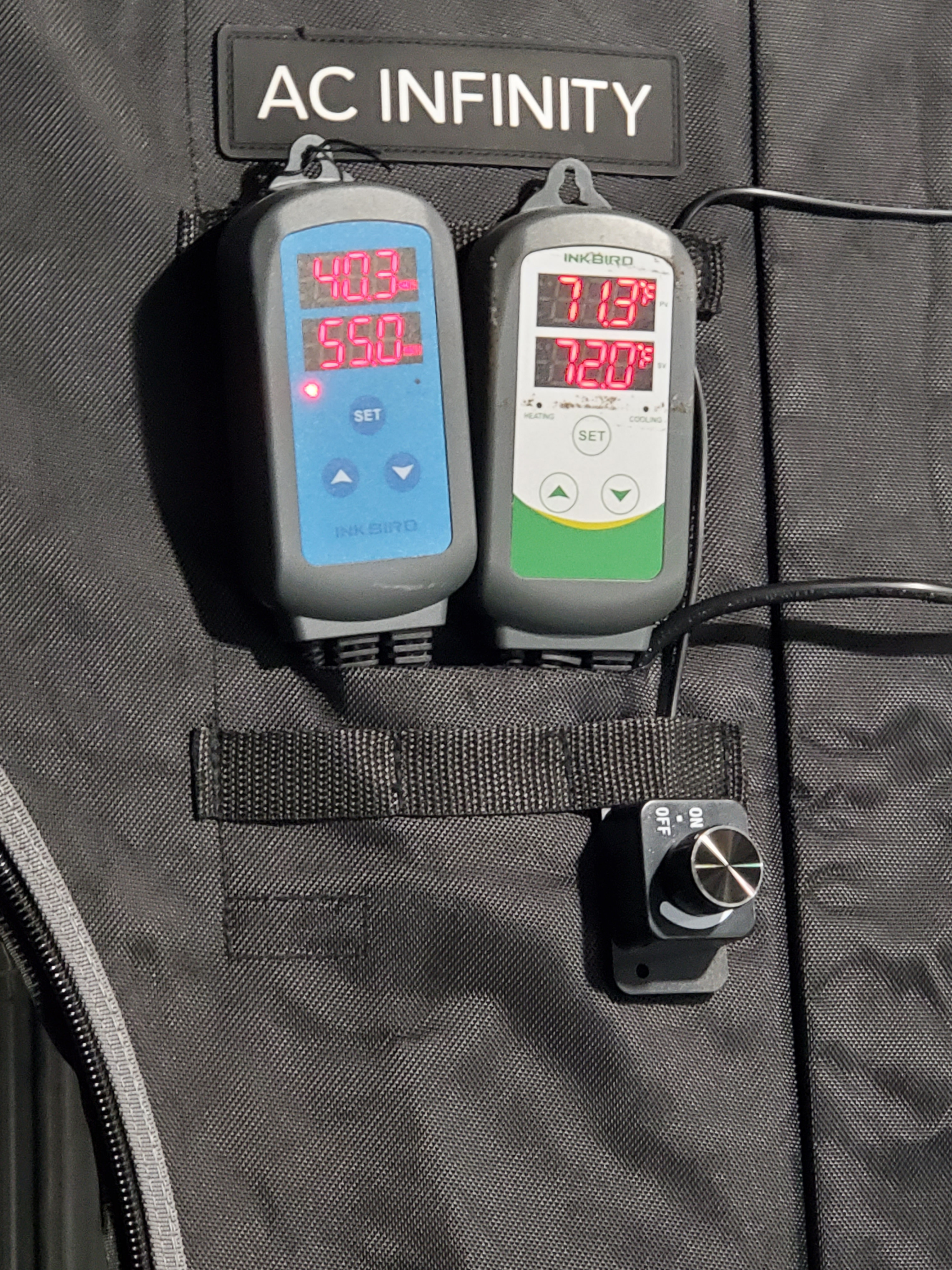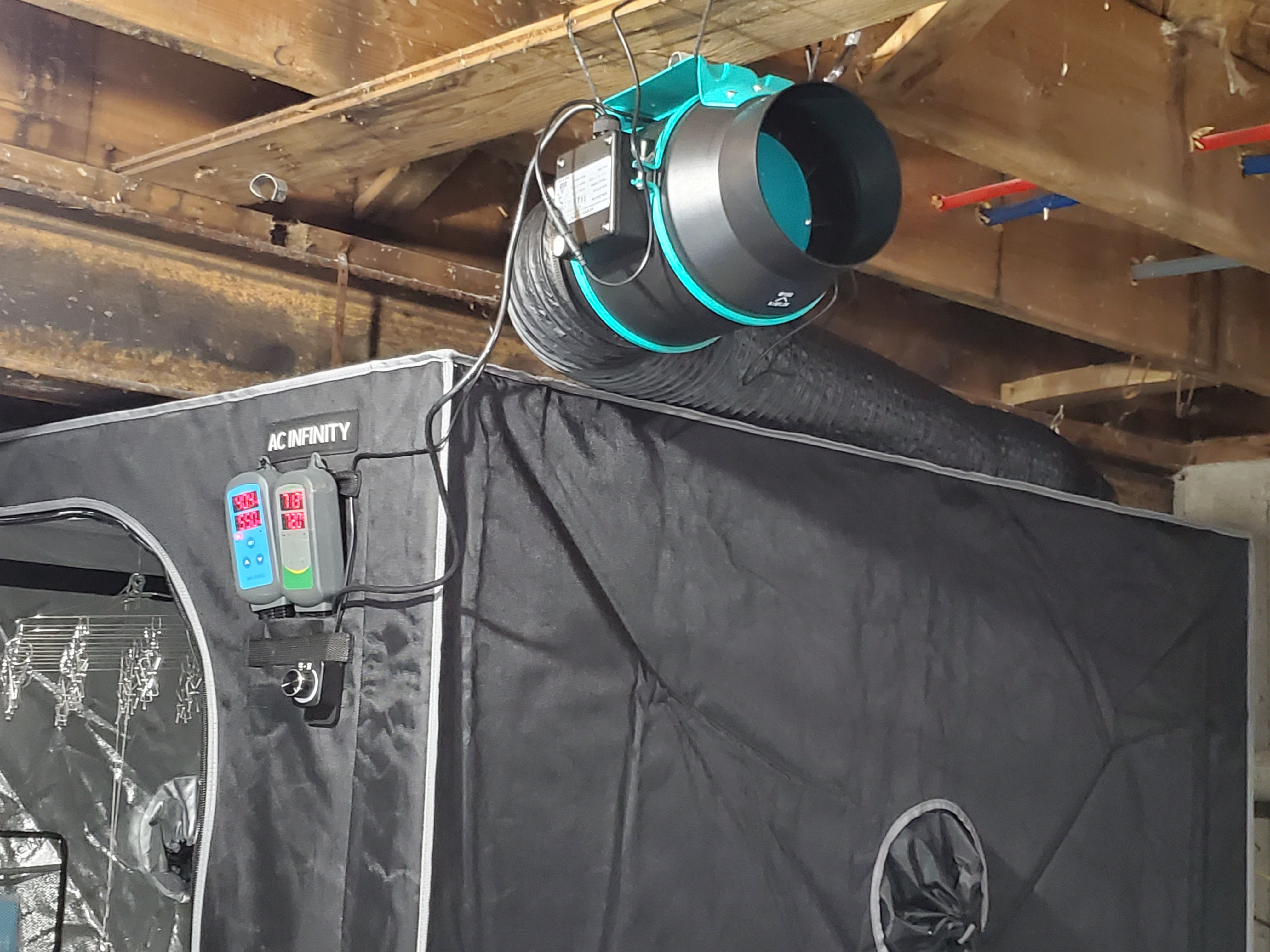 Cycle fans: cloudline 6" exhaust fans with temp and humidity controls to cycle air between lung and growth tents.