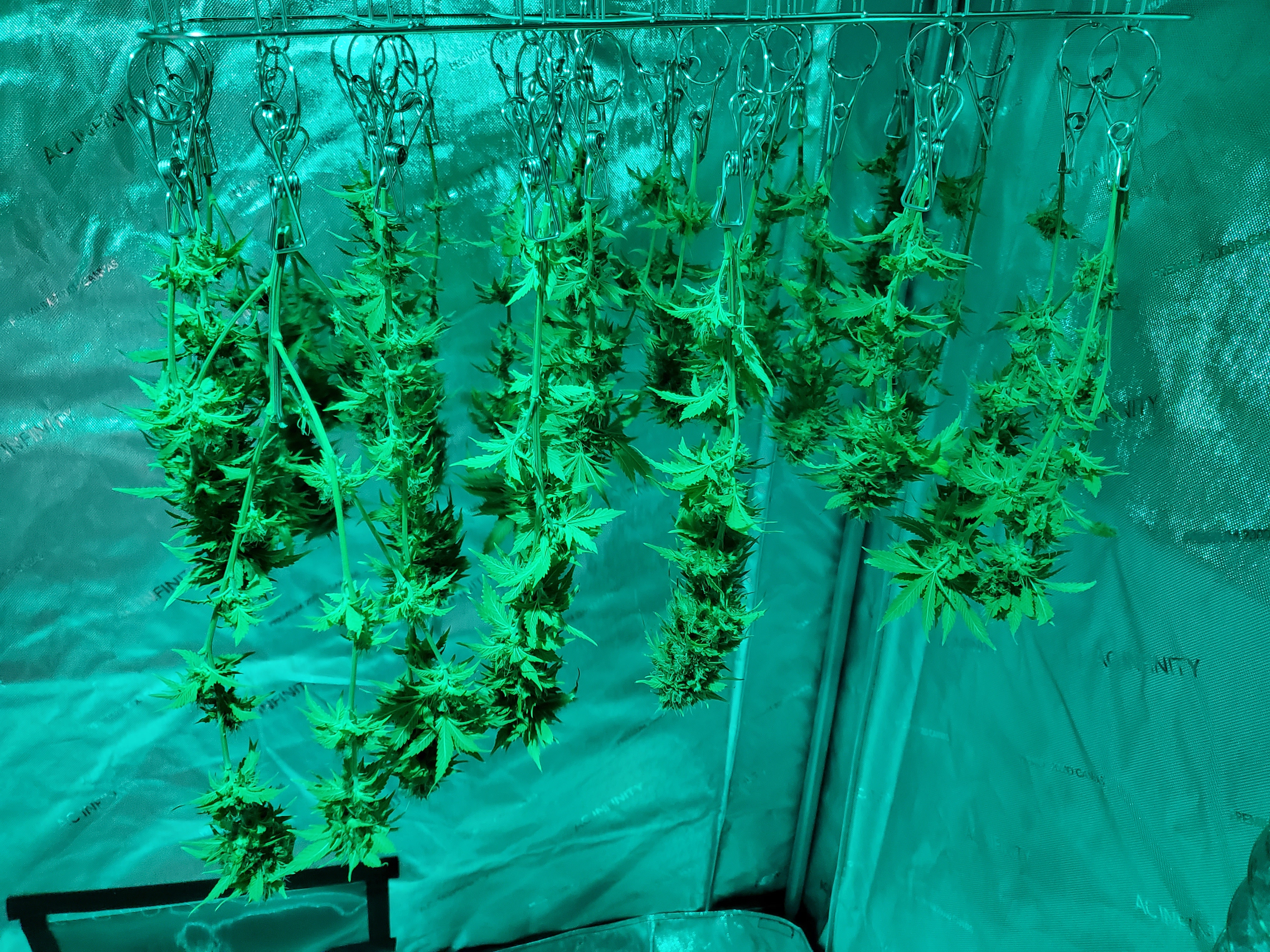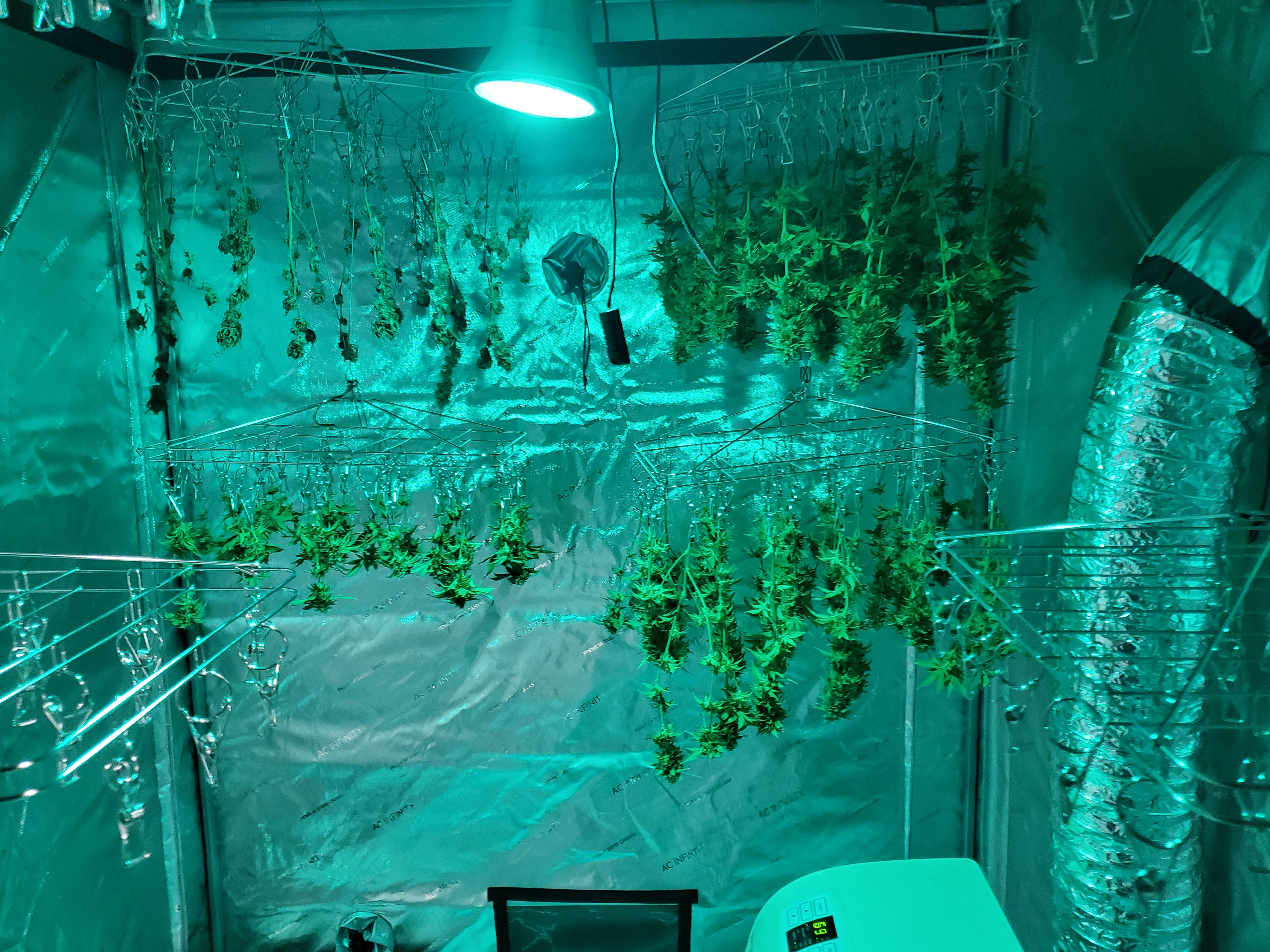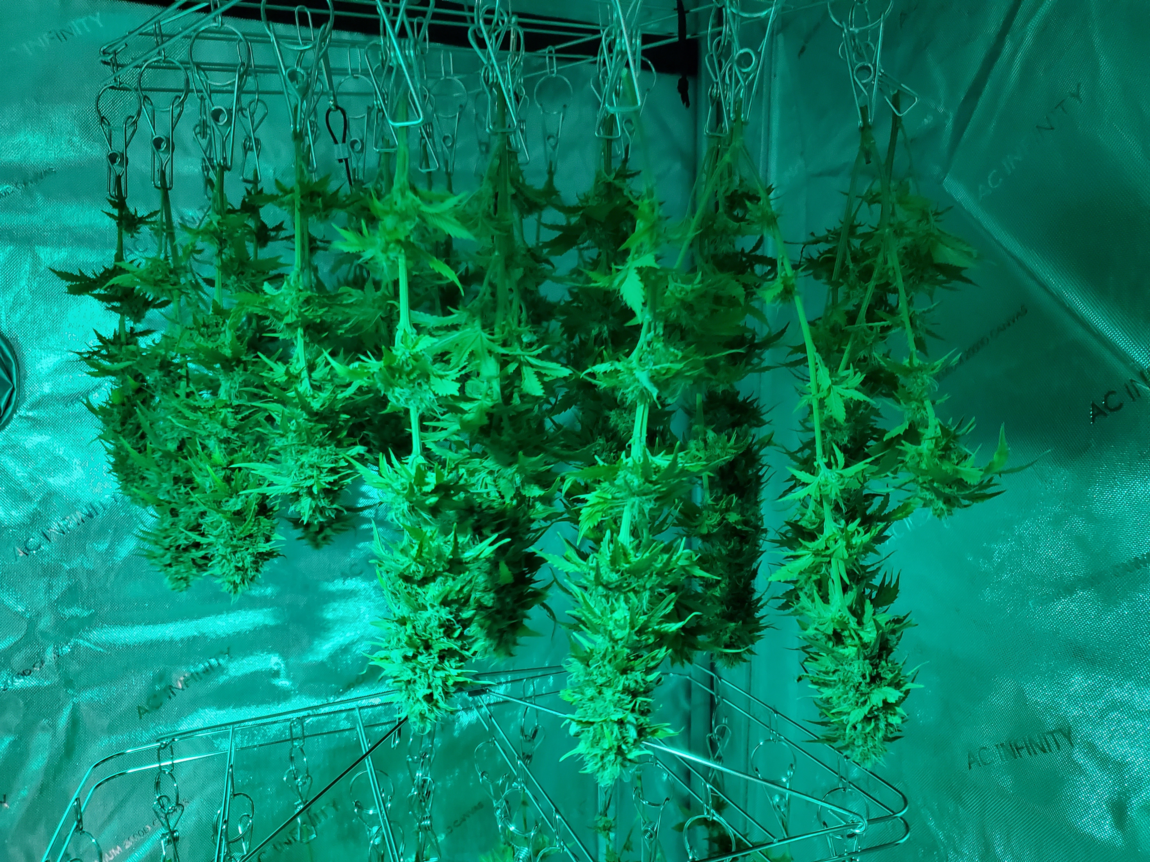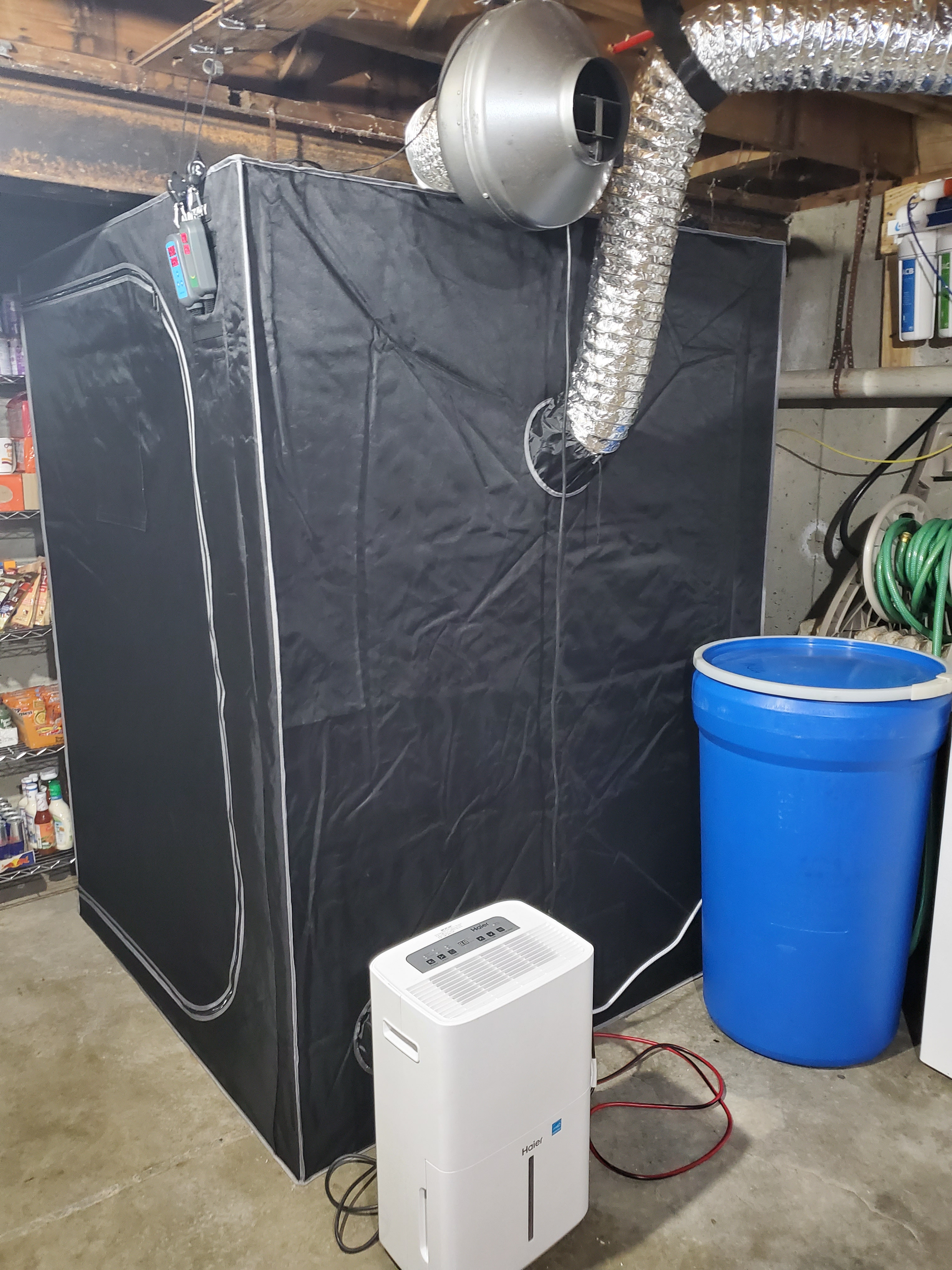 Ok so alot has happened the last two weeks! First off I had to do some tweaking to get the drying chamber working. After trying 3 different small dehumidifiers that didn't work worth crap I bought another large 50qt basement one. Wich I tried putting in the tent but that just caused a constant battle between the portable ac and dehumidifier so now I'm dehumidifier the entire basement and cycling air through tent when humidity gets high. Plus oh ya I had to place a second ac in the chamber aswell. But working now. Temp kept between 65 and 70, humidity between 55 and 58%. Also placed a green 100w led in there for inspections.