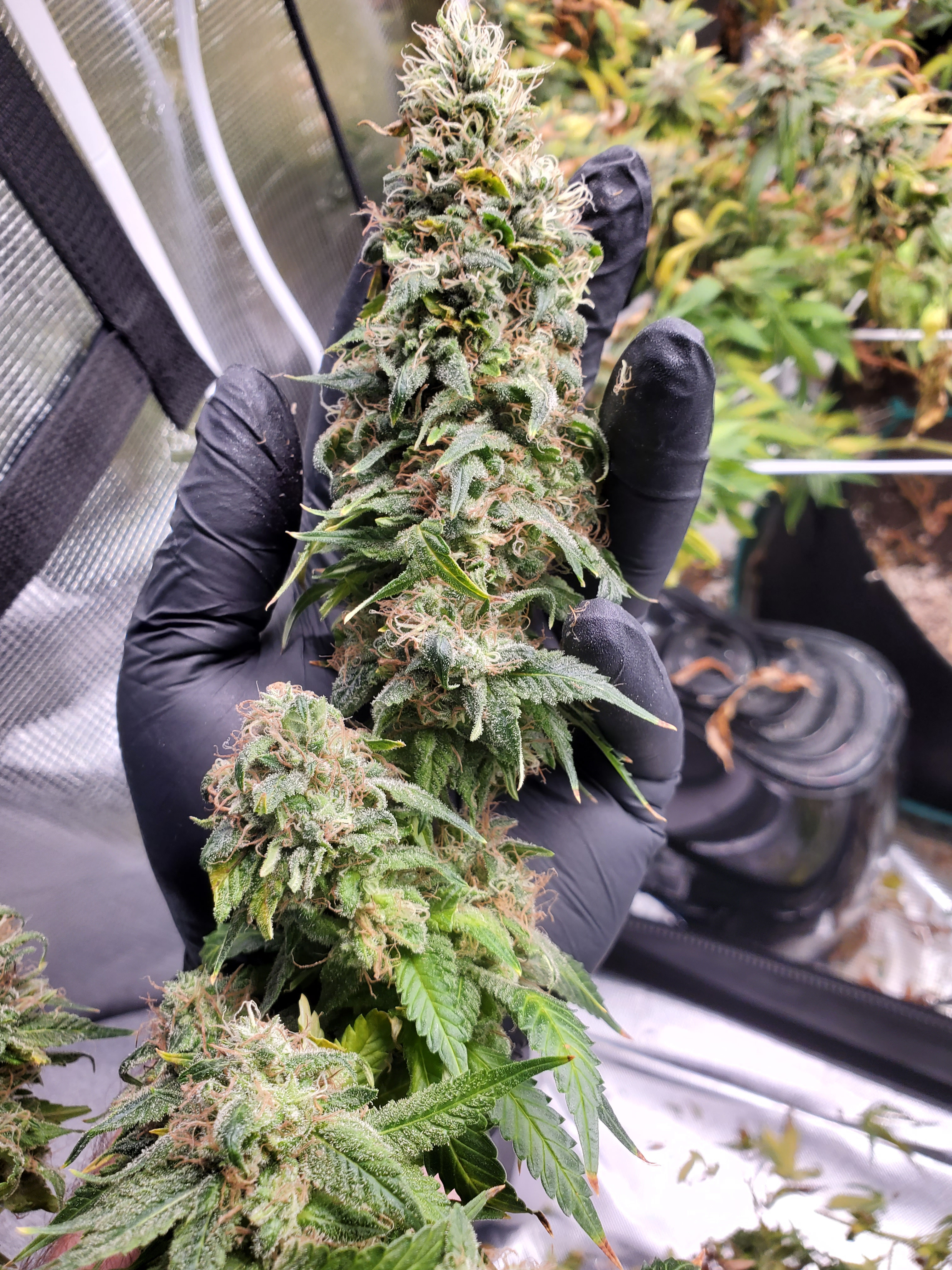 Harvest & Smoke report: Overall weight was 28.5oz from both tents.. I didn't remember to mark racks with what tent they came from so couldn't tell each tents individual harvest weight.. I dried till my moisture reader read 10% remaining. Trimmed and jarred in wide mouth quarts with 62% bovida packs and mini humidistat. Cured for 30 days and smoked.... The moisture meter is off. Joints repeatedly needing to be relit. I hear that Ash is supposed to be perfectly grey ideally. Mine had about 20% black so maybe I'll try a flush next time. Didn't do one at all this time. Also had alot of variance in buds of same strain due to starting all from seed instead of starting seeds and picking a mother for clones. This lead to different flavor profiles, nutrient needs, bud formation etc. Though they both did taste frickin delicious! And after a longer cure they are now burning even and long. I fixed the varying genetics problem on current grow.