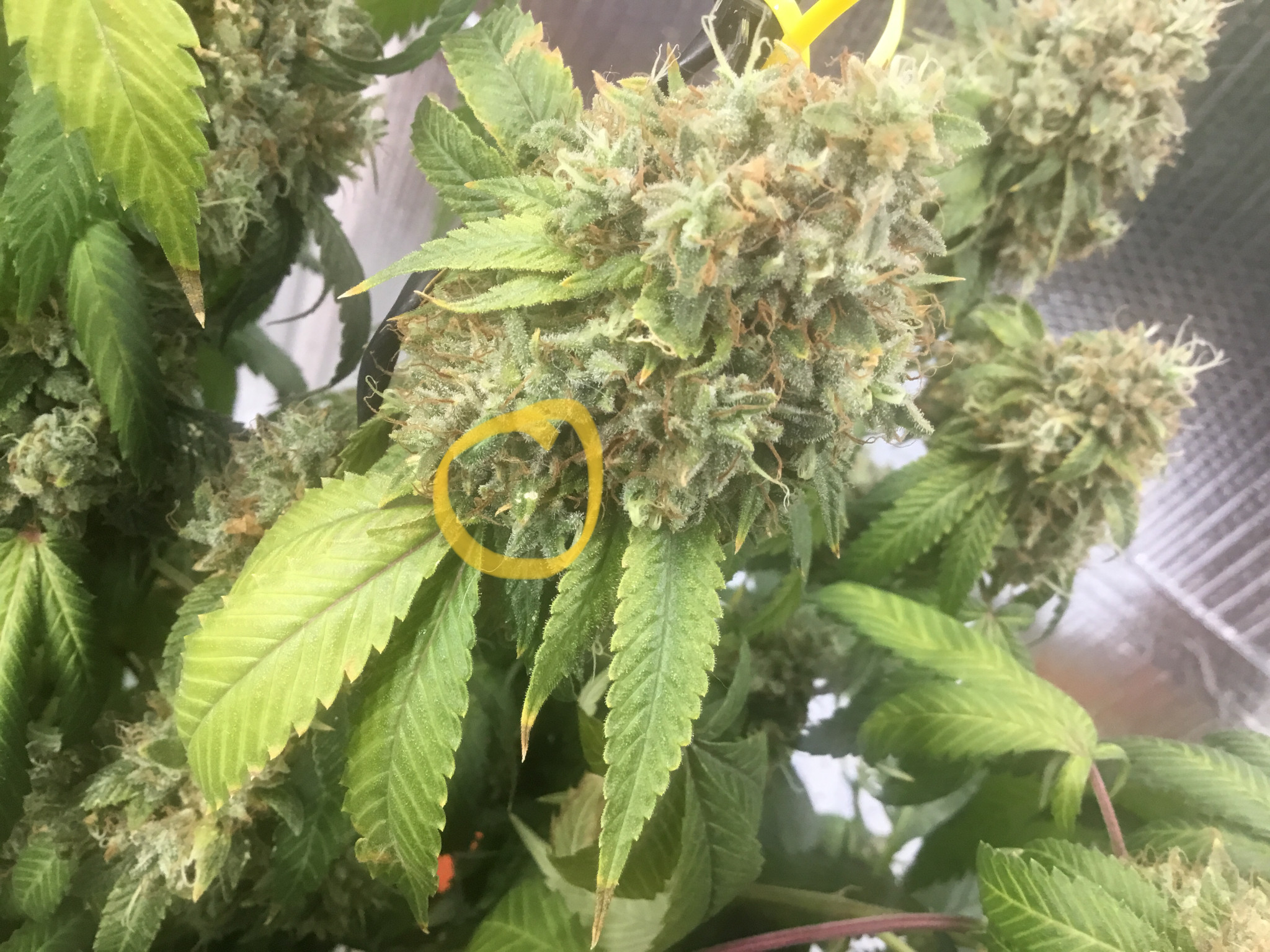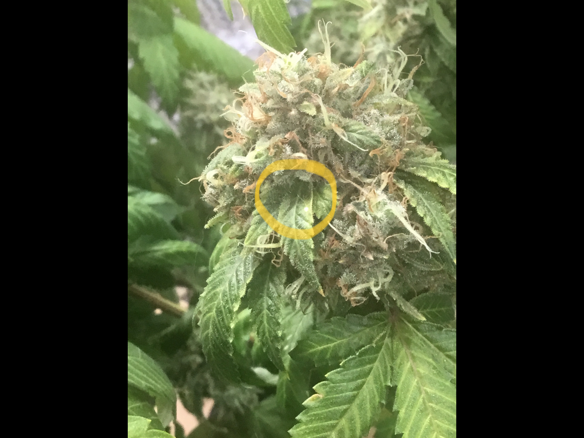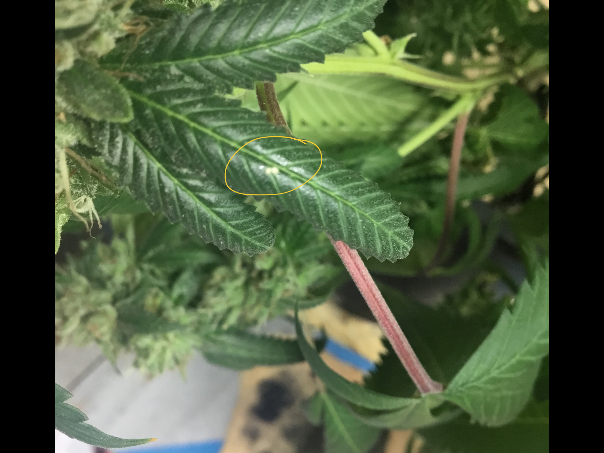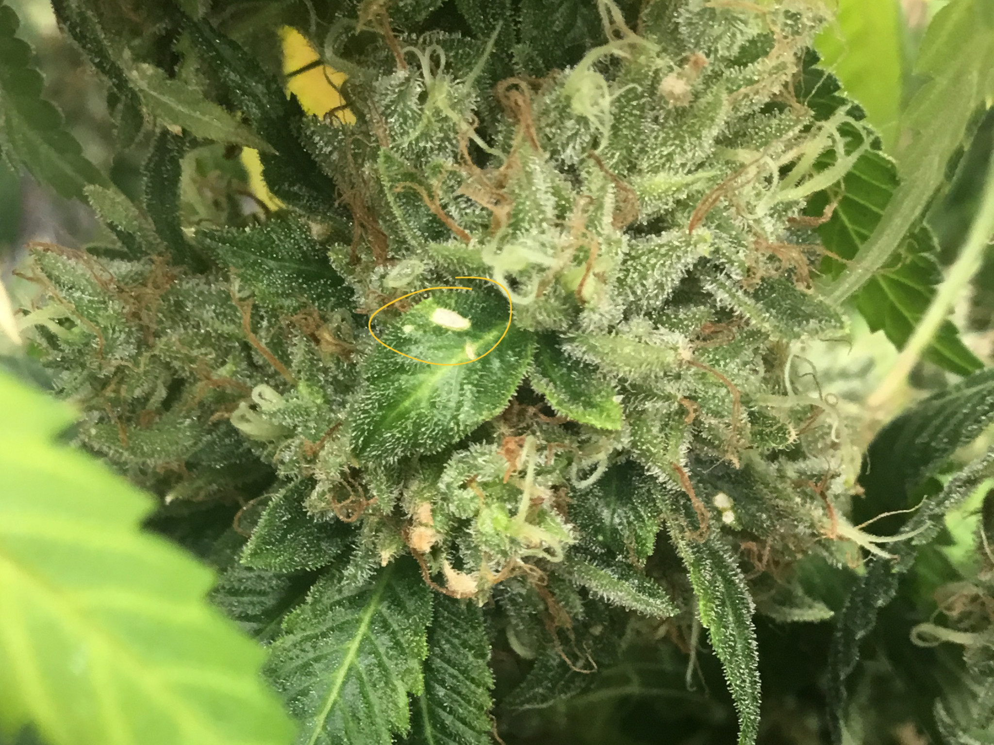 ID:	502078 This is my first grow at the start I was over protective and thought everything was a disaster then I got tired of wasting energy on false alarms and got lax 2 of my plants hermied so the over protectiveness kicked in again I’ve been monitoring my one main plant like a mother hen which is how I found this issue so quick I was looking over the plant and saw a sugar leaf with what looked like a drop of glinting milk on it I panicked and tore it off then I realized the leaf next to it had a tiny tiny spot too I ripped that off too I then caught a breath and examined my plant thoroughly I found 3-4 other spots very similar I looked it up and think it might be thrips or possibly powdery mold right now it seems to be mostly localized around the cola closest to my fan which is what makes me think it’s less likely mold (the only reason I’m even considering mold is well I don’t have a dehumidifier my areas very dry in winter and I planned to be done before spring showers hit basing timeline on the strains flowering time which I now know was silly newb mistakes) that said humidity hasn’t been super high 55-60% but how will thrips effect harvest this plant is so close it seems to be one of those that makes a last minute dash to ripen and I want to give it atleast 4-5 more days because I’m noticing drastic improvement daily now any advice is welcome currently I’m just planning to monitor and hope for the best if it progresses I’ll harvest a little early